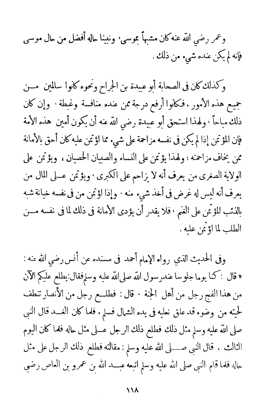 وَعُمَرُ رَضِيَ اللَّهُ عَنْهُ كَانَ مُشَبَّهًا بِمُوسَى وَنَبِيُّنَا حَالُهُ أَفْضَلُ مِنْ حَالِ مُوسَى فَإِنَّهُ لَمْ يَكُنْ عِنْدَهُ شَيْءٌ مِنْ ذَلِكَ. وَكَذَلِكَ كَانَ فِي الصَّحَابَةِ أَبُو عُبَيْدَةَ بْنُ الْجَرَّاحِ وَنَحْوُهُ كَانُوا سَالِمِينَ مِنْ جَمِيعِ هَذِهِ الْأُمُورِ فَكَانُوا أَرْفَعَ دَرَجَةً مِمَّنْ عِنْدَهُ مُنَافَسَةٌ وَغِبْطَةٌ وَإِنْ كَانَ ذَلِكَ مُبَاحًا وَلِهَذَا اسْتَحَقَّ أَبُو عُبَيْدَةَ رَضِيَ اللَّهُ عَنْهُ أَنْ يَكُونَ أَمِينَ هَذِهِ الْأُمَّةِ فَإِنَّ الْمُؤْتَمَنَ إذَا لَمْ يَكُنْ فِي نَفْسِهِ مُزَاحَمَةٌ عَلَى شَيْءٍ مِمَّا اُؤْتُمِنَ عَلَيْهِ كَانَ أَحَقَّ بِالْأَمَانَةِ مِمَّنْ يَخَافُ مُزَاحَمَتَهُ؛ وَلِهَذَا يُؤْتَمَنُ عَلَى النِّسَاءِ وَالصِّبْيَانِ الْخِصْيَانُ وَيُؤْتَمَنُ عَلَى الْوِلَايَةِ الصُّغْرَى مَنْ يُعْرَفُ أَنَّهُ لَا يُزَاحِمُ عَلَى الْكُبْرَى وَيُؤْتَمَنُ عَلَى الْمَالِ مَنْ يُعْرَفُ أَنَّهُ لَيْسَ لَهُ غَرَضٌ فِي أَخْذِ شَيْءٍ مِنْهُ وَإِذَا اُؤْتُمِنَ مَنْ فِي نَفْسِهِ خِيَانَةٌ شُبِّهَ بِالذِّئْبِ الْمُؤْتَمَنِ عَلَى الْغَنَمِ فَلَا يَقْدِرُ أَنْ يُؤَدِّيَ الْأَمَانَةَ فِي ذَلِكَ لِمَا فِي نَفْسِهِ مِنْ الطَّلَبِ لِمَا اُؤْتُمِنَ عَلَيْهِ. وَفِي الْحَدِيثِ الَّذِي رَوَاهُ الْإِمَامُ أَحْمَد فِي مُسْنَدِهِ عَنْ {أَنَسٍ رَضِيَ اللَّهُ عَنْهُ قَالَ: كُنَّا يَوْمًا جُلُوسًا عِنْدَ رَسُولِ اللَّهِ صَلَّى اللَّهُ عَلَيْهِ وَسَلَّمَ فَقَالَ: يَطْلُعُ عَلَيْكُمْ الْآنَ مِنْ هَذَا الْفَجِّ رَجُلٌ مِنْ أَهْلِ الْجَنَّةِ قَالَ: فَطَلَعَ رَجُلٌ مِنْ الْأَنْصَارِ تَنْطِفُ لِحْيَتُهُ مِنْ وُضُوءٍ قَدْ عَلَّقَ نَعْلَيْهِ فِي يَدِهِ الشِّمَالِ فَسَلَّمَ فَلَمَّا كَانَ الْغَدُ قَالَ النَّبِيُّ صَلَّى اللَّهُ عَلَيْهِ وَسَلَّمَ مِثْلَ ذَلِكَ فَطَلَعَ ذَلِكَ الرَّجُلُ عَلَى مِثْلِ حَالِهِ فَلَمَّا كَانَ الْيَوْمُ الثَّالِثُ قَالَ النَّبِيُّ صَلَّى اللَّهُ عَلَيْهِ وَسَلَّمَ مَقَالَتَهُ فَطَلَعَ ذَلِكَ الرَّجُلُ عَلَى مِثْلِ حَالِهِ فَلَمَّا قَامَ النَّبِيُّ صَلَّى اللَّهُ عَلَيْهِ وَسَلَّمَ اتَّبَعَهُ عَبْدُ اللَّهِ بْنُ عَمْرِو بْنِ العاص رَضِيَ