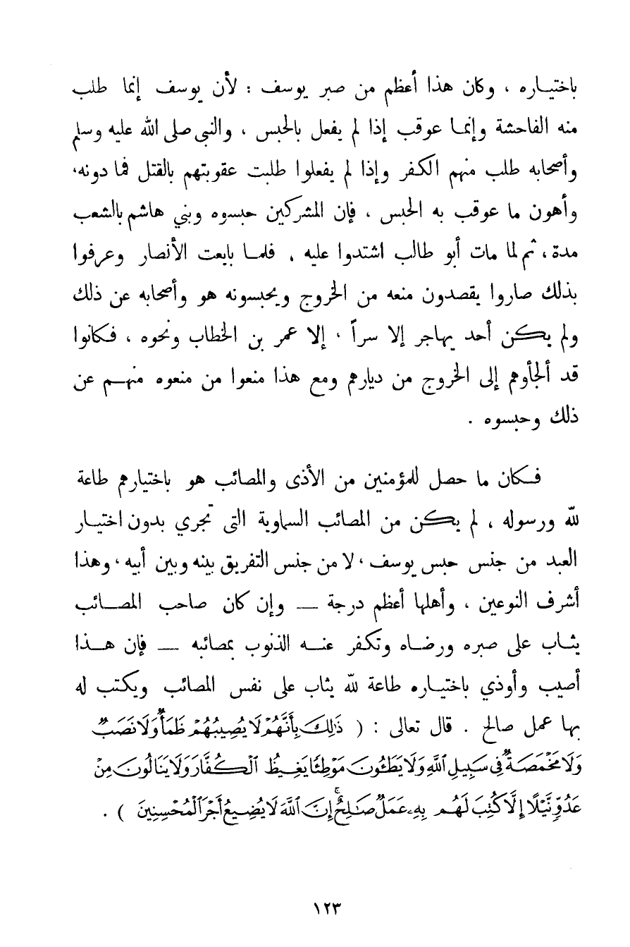بِاخْتِيَارِهِ وَكَانَ هَذَا أَعْظَمَ مِنْ صَبْرِ يُوسُفَ: لِأَنَّ يُوسُفَ إنَّمَا طُلِبَ مِنْهُ الْفَاحِشَةُ وَإِنَّمَا عُوقِبَ إذَا لَمْ يَفْعَلْ بِالْحَبْسِ وَالنَّبِيُّ صَلَّى اللَّهُ عَلَيْهِ وَسَلَّمَ وَأَصْحَابُهُ طُلِبَ مِنْهُمْ الْكُفْرُ وَإِذَا لَمْ يَفْعَلُوا طُلِبَتْ عُقُوبَتُهُمْ بِالْقَتْلِ فَمَا دُونَهُ وَأَهْوَنُ مَا عُوقِبَ بِهِ الْحَبْسُ فَإِنَّ الْمُشْرِكِينَ حَبَسُوهُ وَبَنِيَّ هَاشِمٍ بِالشِّعْبِ مُدَّةً ثُمَّ لَمَّا مَاتَ أَبُو طَالِبٍ اشْتَدُّوا عَلَيْهِ فَلَمَّا بَايَعَتْ الْأَنْصَارُ وَعَرَفُوا بِذَلِكَ صَارُوا يَقْصِدُونَ مَنْعَهُ مِنْ الْخُرُوجِ وَيَحْبِسُونَهُ هُوَ وَأَصْحَابُهُ عَنْ ذَلِكَ وَلَمْ يَكُنْ أَحَدٌ يُهَاجِرُ إلَّا سِرًّا إلَّا عُمَرُ بْنُ الْخَطَّابِ وَنَحْوُهُ فَكَانُوا قَدْ أَلْجَئُوهُمْ إلَى الْخُرُوجِ مِنْ دِيَارِهِمْ وَمَعَ هَذَا مَنَعُوا مَنْ مَنَعُوهُ مِنْهُمْ عَنْ ذَلِكَ وَحَبَسُوهُ. فَكَانَ مَا حَصَلَ لِلْمُؤْمِنِينَ مِنْ الْأَذَى وَالْمَصَائِبِ هُوَ بِاخْتِيَارِهِمْ طَاعَةً لِلَّهِ وَرَسُولِهِ لَمْ يَكُنْ مِنْ الْمَصَائِبِ السَّمَاوِيَّةِ الَّتِي تَجْرِي بِدُونِ اخْتِيَارِ الْعَبْدِ مِنْ جِنْسِ حَبْسِ يُوسُفَ لَا مِنْ جِنْسِ التَّفْرِيقِ بَيْنَهُ وَبَيْنَ أَبِيهِ وَهَذَا أَشْرَفُ النَّوْعَيْنِ وَأَهْلُهَا أَعْظَمُ دَرَجَةً - وَإِنْ كَانَ صَاحِبُ الْمَصَائِبِ يُثَابُ عَلَى صَبْرِهِ وَرِضَاهُ وَتُكَفَّرُ عَنْهُ الذُّنُوبُ بِمَصَائِبِهِ - فَإِنَّ هَذَا أُصِيبَ وَأُوذِيَ بِاخْتِيَارِهِ طَاعَةً لِلَّهِ يُثَابُ عَلَى نَفْسِ الْمَصَائِبِ وَيُكْتَبُ لَهُ بِهَا عَمَلٌ صَالِحٌ. قَالَ تَعَالَى: {ذَلِكَ بِأَنَّهُمْ لَا يُصِيبُهُمْ ظَمَأٌ وَلَا نَصَبٌ وَلَا مَخْمَصَةٌ فِي سَبِيلِ اللَّهِ وَلَا يَطَئُونَ مَوْطِئًا يَغِيظُ الْكُفَّارَ وَلَا يَنَالُونَ مِنْ عَدُوٍّ نَيْلًا إلَّا كُتِبَ لَهُمْ بِهِ عَمَلٌ صَالِحٌ إنَّ اللَّهَ لَا يُضِيعُ أَجْرَ الْمُحْسِنِينَ} .