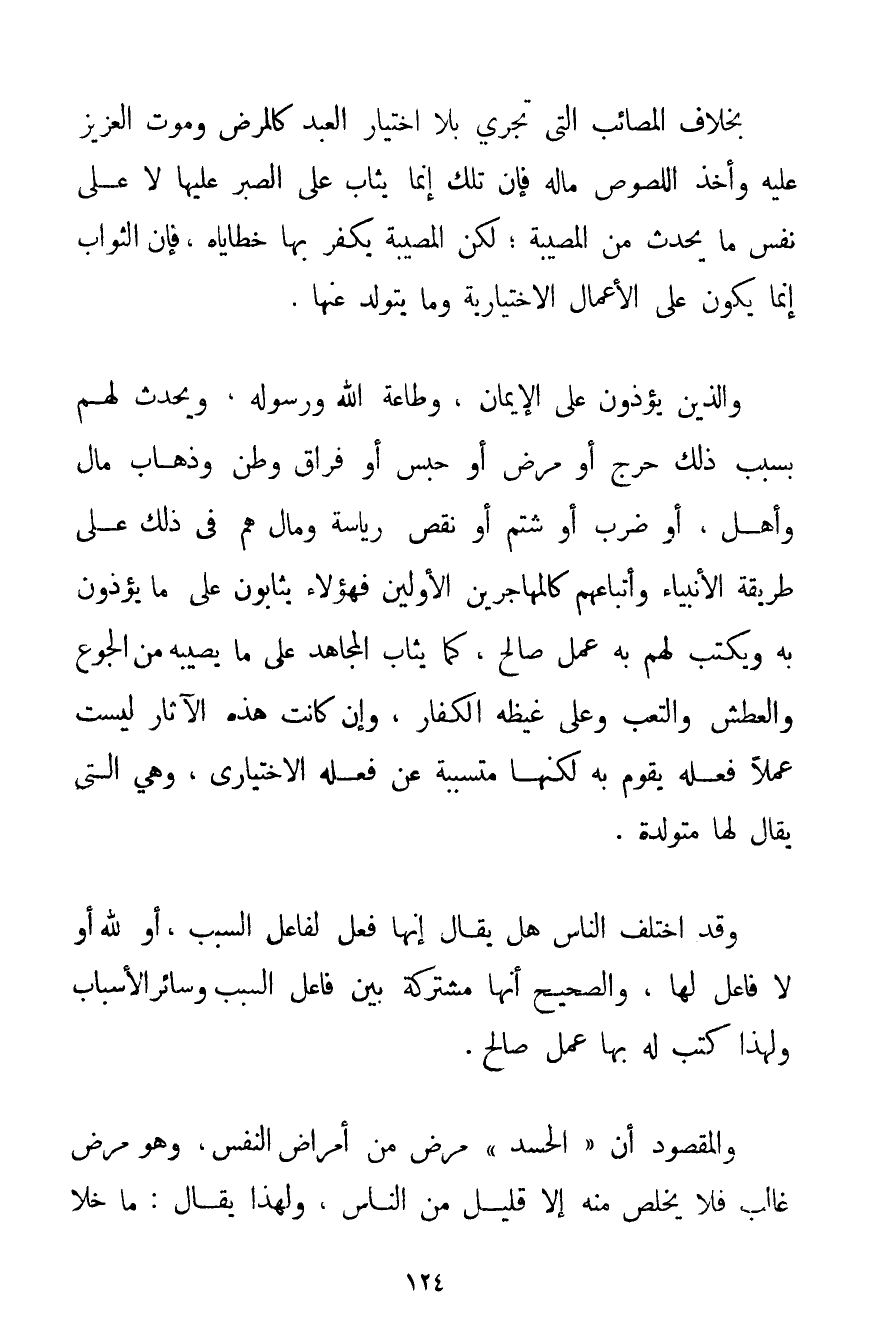 بِخِلَافِ الْمَصَائِبِ الَّتِي تَجْرِي بِلَا اخْتِيَارِ الْعَبْدِ كَالْمَرَضِ وَمَوْتِ الْعَزِيزِ عَلَيْهِ وَأَخْذِ اللُّصُوصِ مَالَهُ فَإِنَّ تِلْكَ إنَّمَا يُثَابُ عَلَى الصَّبْرِ عَلَيْهَا لَا عَلَى نَفْسِ مَا يَحْدُثُ مِنْ الْمُصِيبَةِ؛ لَكِنَّ الْمُصِيبَةَ يُكَفَّرُ بِهَا خَطَايَاهُ فَإِنَّ الثَّوَابَ إنَّمَا يَكُونُ عَلَى الْأَعْمَالِ الِاخْتِيَارِيَّةِ وَمَا يَتَوَلَّدُ عَنْهَا. وَاَلَّذِينَ يُؤْذَوْنَ عَلَى الْإِيمَانِ وَطَاعَةِ اللَّهِ وَرَسُولِهِ وَيَحْدُثُ لَهُمْ بِسَبَبِ ذَلِكَ حَرَجٌ أَوْ مَرَضٌ أَوْ حَبْسٌ أَوْ فِرَاقُ وَطَنٍ وَذَهَابُ مَالٍ وَأَهْلٍ أَوْ ضَرْبٌ أَوْ شَتْمٌ أَوْ نَقْصُ رِيَاسَةٍ وَمَالٍ هُمْ فِي ذَلِكَ عَلَى طَرِيقَةِ الْأَنْبِيَاءِ وَأَتْبَاعِهِمْ كَالْمُهَاجِرِينَ الْأَوَّلِينَ فَهَؤُلَاءِ يُثَابُونَ عَلَى مَا يُؤْذَوْنَ بِهِ وَيُكْتَبُ لَهُمْ بِهِ عَمَلٌ صَالِحٌ كَمَا يُثَابُ الْمُجَاهِدُ عَلَى مَا يُصِيبُهُ مِنْ الْجُوعِ وَالْعَطَشِ وَالتَّعَبِ وَعَلَى غَيْظِهِ الْكُفَّارَ وَإِنْ كَانَتْ هَذِهِ الْآثَارُ لَيْسَتْ عَمَلًا فَعَلَهُ يَقُومُ بِهِ لَكِنَّهَا مُتَسَبِّبَةٌ عَنْ فِعْلِهِ الِاخْتِيَارِيِّ وَهِيَ الَّتِي يُقَالُ لَهَا مُتَوَلِّدَةٌ. وَقَدْ اخْتَلَفَ النَّاسُ هَلْ يُقَالُ إنَّهَا فِعْلٌ لِفَاعِلِ السَّبَبِ أَوْ لِلَّهِ أَوْ لَا فَاعِلَ لَهَا وَالصَّحِيحُ أَنَّهَا مُشْتَرَكَةٌ بَيْنَ فَاعِلِ السَّبَبِ وَسَائِرِ الْأَسْبَابِ وَلِهَذَا كُتِبَ لَهُ بِهَا عَمَلٌ صَالِحٌ. وَالْمَقْصُودُ أَنَّ " الْحَسَدَ " مَرَضٌ مِنْ أَمْرَاضِ النَّفْسِ وَهُوَ مَرَضٌ غَالِبٌ فَلَا يَخْلُصُ مِنْهُ إلَّا قَلِيلٌ مِنْ النَّاسِ وَلِهَذَا يُقَالُ: مَا خَلَا
