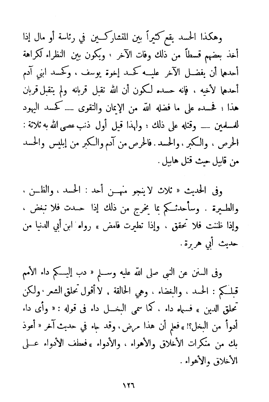 وَهَكَذَا الْحَسَدُ يَقَعُ كَثِيرًا بَيْنَ الْمُتَشَارِكِينَ فِي رِئَاسَةٍ أَوْ مَالٍ إذَا أَخَذَ بَعْضُهُمْ قِسْطًا مِنْ ذَلِكَ وَفَاتَ الْآخَرُ؛ وَيَكُونُ بَيْنَ النُّظَرَاءِ لِكَرَاهَةِ أَحَدِهِمَا أَنْ يُفَضَّلَ الْآخَرُ عَلَيْهِ كَحَسَدِ إخْوَةِ يُوسُفَ كَحَسَدِ ابْنَيْ آدَمَ أَحَدُهُمَا لِأَخِيهِ فَإِنَّهُ حَسَدَهُ لِكَوْنِ أَنَّ اللَّهَ تَقَبَّلَ قُرْبَانَهُ وَلَمْ يَتَقَبَّلْ قُرْبَانَ هَذَا؛ فَحَسَدَهُ عَلَى مَا فَضَّلَهُ اللَّهُ مِنْ الْإِيمَانِ وَالتَّقْوَى - كَحَسَدِ الْيَهُودِ لِلْمُسْلِمِينَ - وَقَتْلِهِ عَلَى ذَلِكَ؛ وَلِهَذَا قِيلَ أَوَّلُ ذَنْبٍ عُصِيَ اللَّهُ بِهِ ثَلَاثَةٌ: الْحِرْصُ وَالْكِبْرُ وَالْحَسَدُ. فَالْحِرْصُ مِنْ آدَمَ وَالْكِبْرُ مِنْ إبْلِيسَ وَالْحَسَدُ مِنْ قَابِيلَ حَيْثُ قَتَلَ هَابِيلَ. وَفِي الْحَدِيثِ {ثَلَاثٌ لَا يَنْجُو مِنْهُنَّ أَحَدٌ: الْحَسَدُ وَالظَّنُّ وَالطِّيَرَةُ. وَسَأُحَدِّثُكُمْ بِمَا يَخْرُجُ مِنْ ذَلِكَ إذَا حَسَدْت فَلَا تُبْغِضْ وَإِذَا ظَنَنْت فَلَا تُحَقِّقْ وَإِذَا تَطَيَّرْت فَامْضِ} رَوَاهُ ابْنُ أَبِي الدُّنْيَا مِنْ حَدِيثِ أَبِي هُرَيْرَةَ. وَفِي السُّنَنِ عَنْ النَّبِيِّ صَلَّى اللَّهُ عَلَيْهِ وَسَلَّمَ {دَبَّ إلَيْكُمْ دَاءُ الْأُمَمِ قَبْلَكُمْ: الْحَسَدُ وَالْبَغْضَاءُ وَهِيَ الْحَالِقَةُ لَا أَقُولُ تَحْلِقُ الشَّعْرَ وَلَكِنْ تَحْلِقُ الدِّينَ} فَسَمَّاهُ دَاءً كَمَا سَمَّى الْبُخْلَ دَاءً فِي قَوْلِهِ: {وَأَيُّ دَاءٍ أَدْوَأُ مِنْ الْبُخْلِ} فَعُلِمَ أَنَّ هَذَا مَرَضٌ وَقَدْ جَاءَ فِي حَدِيثٍ آخَرَ {أَعُوذُ بِك مِنْ مُنْكَرَاتِ الْأَخْلَاقِ وَالْأَهْوَاءِ وَالْأَدْوَاءِ} فَعَطَفَ الْأَدْوَاءَ عَلَى الْأَخْلَاقِ وَالْأَهْوَاءِ.