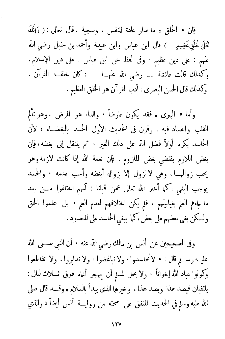 فَإِنَّ " الْخُلُقَ " مَا صَارَ عَادَةً لِلنَّفْسِ وَسَجِيَّةً. قَالَ تَعَالَى: {وَإِنَّكَ لَعَلى خُلُقٍ عَظِيمٍ} قَالَ ابْنُ عَبَّاسٍ وَابْنُ عُيَيْنَة وَأَحْمَد بْنُ حَنْبَلٍ رَضِيَ اللَّهُ عَنْهُمْ عَنْهُمْ: عَلَى دِينٍ عَظِيمٍ وَفِي لَفْظٍ عَنْ ابْنِ عَبَّاسٍ: عَلَى دِينِ الْإِسْلَامِ. وَكَذَلِكَ قَالَتْ عَائِشَةُ - رَضِيَ اللَّهُ عَنْهَا -: كَانَ خُلُقُهُ الْقُرْآنَ. وَكَذَلِكَ قَالَ الْحَسَنُ الْبَصْرِيُّ: أَدَبُ الْقُرْآنِ هُوَ الْخُلُقُ الْعَظِيمُ. وَأَمَّا " الْهَوَى " فَقَدْ يَكُونُ عَارِضًا وَالدَّاءُ هُوَ الْمَرَضُ وَهُوَ تَأَلُّمُ الْقَلْبِ وَالْفَسَادُ فِيهِ وَقَرَنَ فِي الْحَدِيثِ الْأَوَّلِ الْحَسَدَ بِالْبَغْضَاءِ؛ لِأَنَّ الْحَاسِدَ يَكْرَهُ أَوَّلًا فَضْلَ اللَّهِ عَلَى ذَلِكَ الْغَيْرِ؛ ثُمَّ يَنْتَقِلُ إلَى بُغْضِهِ؛ فَإِنَّ بُغْضَ اللَّازِمِ يَقْتَضِي بُغْضَ الْمَلْزُومِ فَإِنَّ نِعْمَةَ اللَّهِ إذَا كَانَتْ لَازِمَةً وَهُوَ يُحِبُّ زَوَالَهَا وَهِيَ لَا تَزُولُ إلَّا بِزَوَالِهِ أَبْغَضَهُ وَأَحَبَّ عَدَمَهُ وَالْحَسَدُ يُوجِبُ الْبَغْيَ كَمَا أَخْبَرَ اللَّهُ تَعَالَى عَمَّنْ قَبْلَنَا: أَنَّهُمْ اخْتَلَفُوا مِنْ بَعْدِ مَا جَاءَهُمْ الْعِلْمُ بَغْيًا بَيْنَهُمْ فَلَمْ يَكُنْ اخْتِلَافُهُمْ لِعَدَمِ الْعِلْمِ بَلْ عَلِمُوا الْحَقَّ وَلَكِنْ بَغَى بَعْضُهُمْ عَلَى بَعْضٍ كَمَا يَبْغِي الْحَاسِدُ عَلَى الْمَحْسُودِ. وَفِي الصَّحِيحَيْنِ عَنْ أَنَسِ بْنِ مَالِكٍ رَضِيَ اللَّهُ عَنْهُ أَنَّ النَّبِيَّ صَلَّى اللَّهُ عَلَيْهِ وَسَلَّمَ قَالَ: {لَا تَحَاسَدُوا وَلَا تَبَاغَضُوا؛ وَلَا تَدَابَرُوا وَلَا تَقَاطَعُوا وَكُونُوا عِبَادَ اللَّهِ إخْوَانًا وَلَا يَحِلُّ لِمُسْلِمِ أَنْ يَهْجُرَ أَخَاهُ فَوْقَ ثَلَاثِ لَيَالٍ: يَلْتَقِيَانِ فَيَصُدُّ هَذَا وَيَصُدُّ هَذَا وَخَيْرُهُمَا الَّذِي يَبْدَأُ بِالسَّلَامِ} وَقَدْ قَالَ صَلَّى اللَّهُ عَلَيْهِ وَسَلَّمَ فِي الْحَدِيثِ الْمُتَّفَقِ عَلَى صِحَّتِهِ مِنْ رِوَايَةِ أَنَسٍ أَيْضًا {وَاَلَّذِي