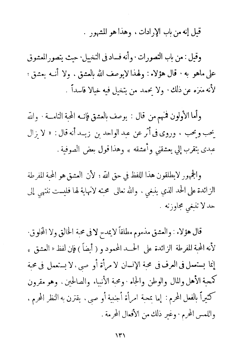 وَقِيلَ: مِنْ بَابِ التَّصَوُّرَاتِ وَأَنَّهُ فَسَادٌ فِي التَّخْيِيلِ حَيْثُ يَتَصَوَّرُ الْمَعْشُوقُ عَلَى مَا هُوَ بِهِ قَالَ هَؤُلَاءِ: وَلِهَذَا لَا يُوصَفُ اللَّهُ بِالْعِشْقِ وَلَا أَنَّهُ يَعْشَقُ؛ لِأَنَّهُ مُنَزَّهٌ عَنْ ذَلِكَ وَلَا يُحْمَدُ مَنْ يَتَخَيَّلُ فِيهِ خَيَالًا فَاسِدًا. وَأَمَّا الْأَوَّلُونَ فَمِنْهُمْ مَنْ قَالَ: يُوصَفُ بِالْعِشْقِ فَإِنَّهُ الْمَحَبَّةُ التَّامَّةُ؛ وَاَللَّهُ يُحَبُّ وَيُحِبُّ وَرُوِيَ فِي أَثَرٍ عَنْ عَبْدِ الْوَاحِدِ بْنِ زَيْدٍ أَنَّهُ قَالَ: {لَا يَزَالُ عَبْدِي يَتَقَرَّبُ إلَيَّ يَعْشَقُنِي وَأَعْشَقُهُ} وَهَذَا قَوْلُ بَعْضِ الصُّوفِيَّةِ. وَالْجُمْهُورُ لَا يُطْلِقُونَ هَذَا اللَّفْظَ فِي حَقِّ اللَّهِ؛ لِأَنَّ الْعِشْقَ هُوَ الْمَحَبَّةُ الْمُفْرِطَةُ الزَّائِدَةُ عَلَى الْحَدِّ الَّذِي يَنْبَغِي وَاَللَّهُ تَعَالَى مَحَبَّتُهُ لَا نِهَايَةَ لَهَا فَلَيْسَتْ تَنْتَهِي إلَى حَدٍّ لَا تَنْبَغِي مُجَاوَزَتُهُ. قَالَ هَؤُلَاءِ: وَالْعِشْقُ مَذْمُومٌ مُطْلَقًا لَا يُمْدَحُ لَا فِي مَحَبَّةِ الْخَالِقِ وَلَا الْمَخْلُوقِ لِأَنَّهُ الْمَحَبَّةُ الْمُفْرِطَةُ الزَّائِدَةُ عَلَى الْحَدِّ الْمَحْمُودِ وَأَيْضًا فَإِنَّ لَفْظَ " الْعِشْقِ " إنَّمَا يُسْتَعْمَلُ فِي الْعُرْفِ فِي مَحَبَّةِ الْإِنْسَانِ لِامْرَأَةٍ أَوْ صَبِيٍّ لَا يُسْتَعْمَلُ فِي مَحَبَّةٍ كَمَحَبَّةِ الْأَهْلِ وَالْمَالِ وَالْوَطَنِ وَالْجَاهِ وَمَحَبَّةِ الْأَنْبِيَاءِ وَالصَّالِحِينَ وَهُوَ مَقْرُونٌ كَثِيرًا بِالْفِعْلِ الْمُحَرَّمِ: إمَّا بِمَحَبَّةِ امْرَأَةٍ أَجْنَبِيَّةٍ أَوْ صَبِيٍّ يَقْتَرِنُ بِهِ النَّظَرُ الْمُحَرَّمُ وَاللَّمْسُ الْمُحَرَّمُ وَغَيْرُ ذَلِكَ مِنْ الْأَفْعَالِ الْمُحَرَّمَةِ. وَأَمَّا