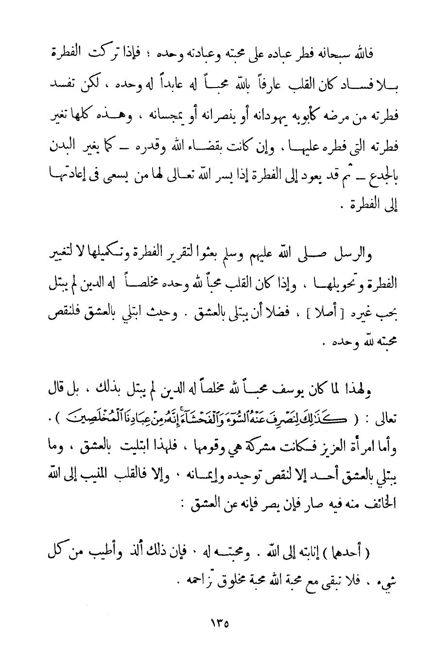 فَاَللَّهُ سُبْحَانَهُ فَطَرَ عِبَادَهُ عَلَى مَحَبَّتِهِ وَعِبَادَتِهِ وَحْدَهُ؛ فَإِذَا تُرِكَتْ الْفِطْرَةُ بِلَا فَسَادٍ كَانَ الْقَلْبُ عَارِفًا بِاَللَّهِ مُحِبًّا لَهُ عَابِدًا لَهُ وَحْدَهُ لَكِنْ تَفْسُدُ فِطْرَتُهُ مِنْ مَرَضِهِ كَأَبَوَيْهِ يُهَوِّدَانِهِ أَوْ يُنَصِّرَانِهِ أَوْ يُمَجِّسَانِهِ وَهَذِهِ كُلُّهَا تُغَيِّرُ فِطْرَتَهُ الَّتِي فَطَرَهُ عَلَيْهَا وَإِنْ كَانَتْ بِقَضَاءِ اللَّهِ وَقَدَرِهِ - كَمَا يُغَيَّرُ الْبَدَنُ بِالْجَدْعِ - ثُمَّ قَدْ يَعُودُ إلَى الْفِطْرَةِ إذَا يَسَّرَ اللَّهُ تَعَالَى لَهَا مَنْ يَسْعَى فِي إعَادَتِهَا إلَى الْفِطْرَةِ. وَالرُّسُلُ صَلَّى اللَّهُ عَلَيْهِمْ وَسَلَّمَ بُعِثُوا لِتَقْرِيرِ الْفِطْرَةِ وَتَكْمِيلِهَا لَا لِتَغْيِيرِ الْفِطْرَةِ وَتَحْوِيلِهَا وَإِذَا كَانَ الْقَلْبُ مُحِبًّا لِلَّهِ وَحْدَهُ مُخْلِصًا لَهُ الدِّينَ لَمْ يُبْتَلَ بِحُبِّ غَيْرِهِ أَصْلًا، فَضْلًا أَنْ يُبْتَلَى بِالْعِشْقِ. وَحَيْثُ اُبْتُلِيَ بِالْعِشْقِ فَلِنَقْصِ مَحَبَّتِهِ لِلَّهِ وَحْدَهُ. وَلِهَذَا لَمَّا كَانَ يُوسُفُ مُحِبًّا لِلَّهِ مُخْلِصًا لَهُ الدِّينَ لَمْ يُبْتَلَ بِذَلِكَ بَلْ قَالَ تَعَالَى: {كَذَلِكَ لِنَصْرِفَ عَنْهُ السُّوءَ وَالْفَحْشَاءَ إنَّهُ مِنْ عِبَادِنَا الْمُخْلَصِينَ} . وَأَمَّا امْرَأَةُ الْعَزِيزِ فَكَانَتْ مُشْرِكَةً هِيَ وَقَوْمُهَا فَلِهَذَا اُبْتُلِيَتْ بِالْعِشْقِ وَمَا يُبْتَلَى بِالْعِشْقِ أَحَدٌ إلَّا لِنَقْصِ تَوْحِيدِهِ وَإِيمَانِهِ وَإِلَّا فَالْقَلْبُ الْمُنِيبُ إلَى اللَّهِ الْخَائِفُ مِنْهُ فِيهِ صَارِفَانِ يَصْرِفَانِ عَنْ الْعِشْقِ: (أَحَدُهُمَا إنَابَتُهُ إلَى اللَّهِ وَمَحَبَّتُهُ لَهُ فَإِنَّ ذَلِكَ أَلَذُّ وَأَطْيَبُ مِنْ كُلِّ شَيْءٍ فَلَا تَبْقَى مَعَ مَحَبَّةِ اللَّهِ مَحَبَّةُ مَخْلُوقٍ تُزَاحِمُهُ.