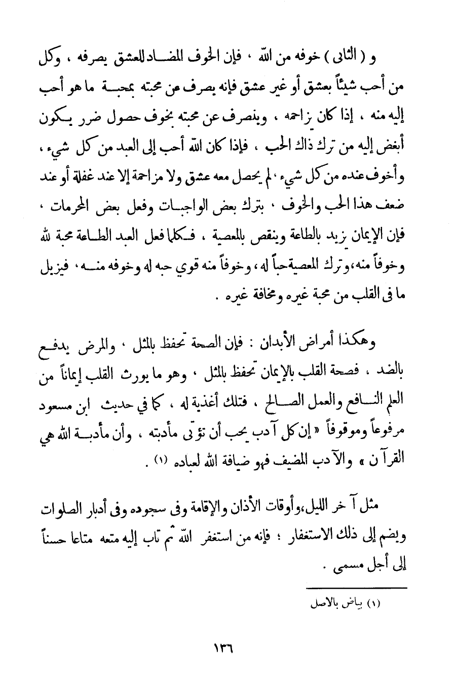 وَالثَّانِي خَوْفُهُ مِنْ اللَّهِ فَإِنَّ الْخَوْفَ الْمُضَادَّ لِلْعِشْقِ يَصْرِفُهُ وَكُلُّ مَنْ أَحَبَّ شَيْئًا بِعِشْقِ أَوْ غَيْرِ عِشْقٍ فَإِنَّهُ يُصْرَفُ عَنْ مَحَبَّتِهِ بِمَحَبَّةِ مَا هُوَ أَحَبُّ إلَيْهِ مِنْهُ إذَا كَانَ يُزَاحِمُهُ وَيَنْصَرِفُ عَنْ مَحَبَّتِهِ بِخَوْفِ حُصُولِ ضَرَرٍ يَكُونُ أَبْغَضَ إلَيْهِ مِنْ تَرْكِ ذَاكَ الْحُبِّ فَإِذَا كَانَ اللَّهُ أَحَبَّ إلَى الْعَبْدِ مَنْ كُلِّ شَيْءٍ وَأَخْوَفَ عِنْدَهُ مَنْ كُلِّ شَيْءٍ لَمْ يَحْصُلْ مَعَهُ عِشْقٌ وَلَا مُزَاحَمَةٌ إلَّا عِنْدَ غَفْلَةٍ أَوْ عِنْدَ ضَعْفِ هَذَا الْحُبِّ وَالْخَوْفِ بِتَرْكِ بَعْضِ الْوَاجِبَاتِ وَفِعْلِ بَعْضِ الْمُحَرَّمَاتِ فَإِنَّ الْإِيمَانَ يَزِيدُ بِالطَّاعَةِ وَيَنْقُصُ بِالْمَعْصِيَةِ فَكُلَّمَا فَعَلَ الْعَبْدُ الطَّاعَةَ مَحَبَّةً لِلَّهِ وَخَوْفًا مِنْهُ وَتَرَكَ الْمَعْصِيَةَ حُبًّا لَهُ وَخَوْفًا مِنْهُ قَوِيَ حُبُّهُ لَهُ وَخَوْفُهُ مِنْهُ فَيُزِيلُ مَا فِي الْقَلْبِ مِنْ مَحَبَّةِ غَيْرِهِ وَمَخَافَةِ غَيْرِهِ. وَهَكَذَا أَمْرَاضُ الْأَبْدَانِ: فَإِنَّ الصِّحَّةَ تُحْفَظُ بِالْمِثْلِ وَالْمَرَضُ يُدْفَعُ بِالضِّدِّ فَصِحَّةُ الْقَلْبِ بِالْإِيمَانِ تُحْفَظُ بِالْمِثْلِ وَهُوَ مَا يُورِثُ الْقَلْبَ إيمَانًا مِنْ الْعِلْمِ النَّافِعِ وَالْعَمَلِ الصَّالِحِ فَتِلْكَ أَغْذِيَةٌ لَهُ كَمَا فِي حَدِيثِ ابْنِ مَسْعُودٍ مَرْفُوعًا وَمَوْقُوفًا {إنَّ كُلَّ آدِبٍ يُحِبُّ أَنْ تُؤْتَى مَأْدُبَتُهُ وَأَنَّ مَأْدُبَةَ اللَّهِ هِيَ الْقُرْآنُ} وَالْآدِبُ الْمُضِيفُ فَهُوَ ضِيَافَةُ اللَّهِ لِعِبَادِهِ. . . (1) .