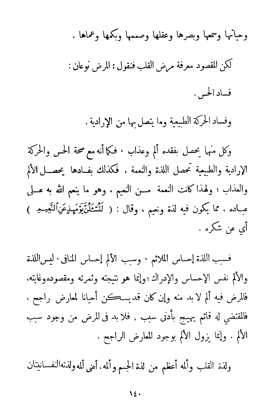 وَحَيَاتِهَا وَسَمْعِهَا وَبَصَرِهَا وَعَقْلِهَا وَصَمَمِهَا وَبُكْمِهَا وَعَمَاهَا. لَكِنَّ الْمَقْصُودَ مَعْرِفَةُ مَرَضِ الْقَلْبِ فَنَقُولُ: الْمَرَضُ نَوْعَانِ: فَسَادُ الْحِسِّ. وَفَسَادُ الْحَرَكَةِ الطَّبِيعِيَّةِ وَمَا يَتَّصِلُ بِهَا مِنْ الْإِرَادِيَّةِ. وَكُلٌّ مِنْهُمَا يَحْصُلُ بِفَقْدِهِ أَلَمٌ وَعَذَابٌ فَكَمَا أَنَّهُ مَعَ صِحَّةِ الْحِسِّ وَالْحَرَكَةِ الْإِرَادِيَّةِ وَالطَّبِيعِيَّةِ تَحْصُلُ اللَّذَّةُ وَالنِّعْمَةُ فَكَذَلِكَ بِفَسَادِهَا يَحْصُلُ الْأَلَمُ وَالْعَذَابُ؛ وَلِهَذَا كَانَتْ النِّعْمَةُ مِنْ النَّعِيمِ وَهُوَ مَا يُنْعِمُ اللَّهُ بِهِ عَلَى عِبَادِهِ مِمَّا يَكُونُ فِيهِ لَذَّةٌ وَنَعِيمٌ وَقَالَ: {لَتُسْأَلُنَّ يَوْمَئِذٍ عَنِ النَّعِيمِ} أَيْ عَنْ شُكْرِهِ. فَسَبَبُ اللَّذَّةِ إحْسَاسُ الْمُلَائِمِ وَسَبَبُ الْأَلَمِ إحْسَاسُ الْمُنَافِي لَيْسَ اللَّذَّةُ وَالْأَلَمُ نَفْسَ الْإِحْسَاسِ وَالْإِدْرَاكِ؛ وَإِنَّمَا هُوَ نَتِيجَتُهُ وَثَمَرَتُهُ وَمَقْصُودُهُ وَغَايَتُهُ فَالْمَرَضُ فِيهِ أَلَمٌ لَا بُدَّ مِنْهُ وَإِنْ كَانَ قَدْ يَسْكُنُ أَحْيَانًا لِمُعَارِضِ رَاجِحٍ فَالْمُقْتَضِي لَهُ قَائِمٌ يُهَيِّجُ بِأَدْنَى سَبَبٍ فَلَا بُدَّ فِي الْمَرَضِ مِنْ وُجُودِ سَبَبِ الْأَلَمِ وَإِنَّمَا يَزُولُ الْأَلَمُ بِوُجُودِ الْمُعَارِضِ الرَّاجِحِ. وَلَذَّةُ الْقَلْبِ وَأَلَمُهُ أَعْظَمُ مِنْ لَذَّةِ الْجِسْمِ وَأَلَمِهِ أَعْنِي أَلَمَهُ وَلَذَّتَهُ النَّفْسانِيّتان