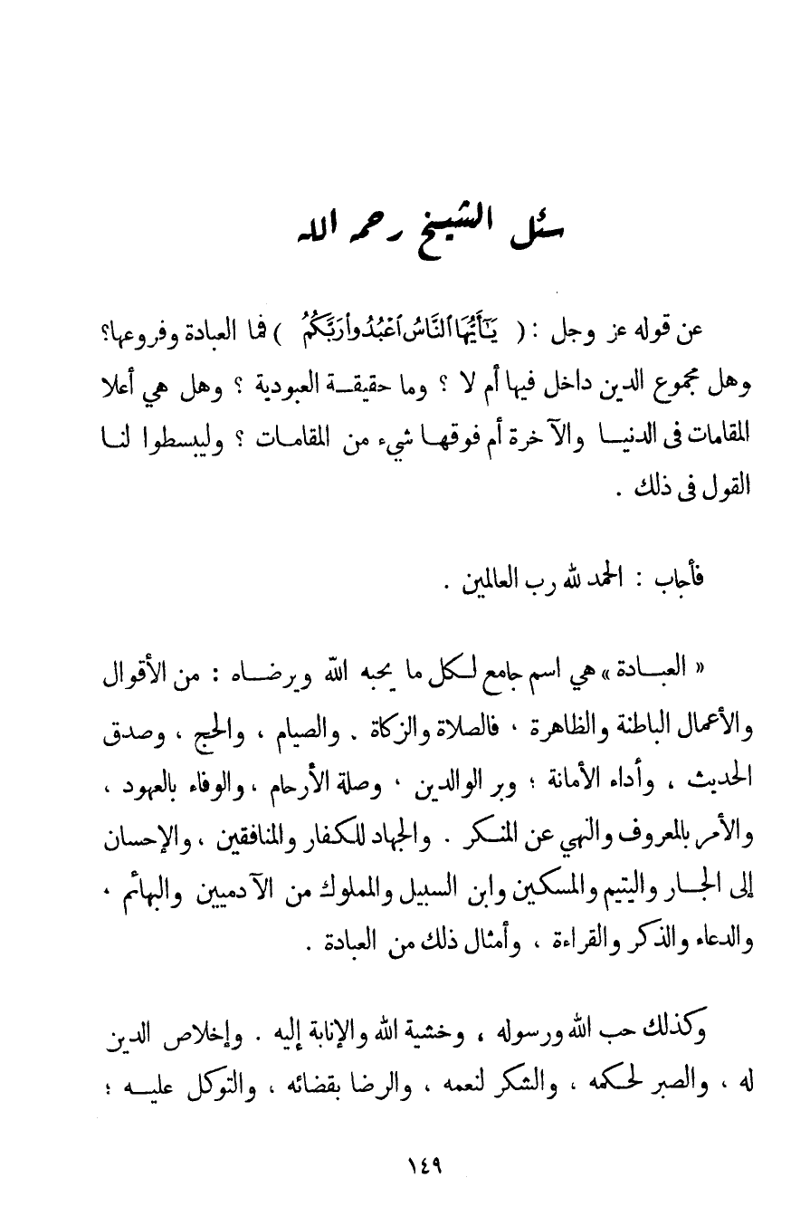 عَنْ قَوْلِهِ عَزَّ وَجَلَّ: {يَا أَيُّهَا النَّاسُ اعْبُدُوا رَبَّكُمُ} فَمَا الْعِبَادَةُ وَفُرُوعُهَا؟ وَهَلْ مَجْمُوعُ الدِّينِ دَاخِلٌ فِيهَا أَمْ لَا؟ وَمَا حَقِيقَةُ الْعُبُودِيَّةِ؟ وَهَلْ هِيَ أَعْلَى الْمَقَامَاتِ فِي الدُّنْيَا وَالْآخِرَةِ أَمْ فَوْقَهَا شَيْءٌ مِنْ الْمَقَامَاتِ؟ وَلِيَبْسُطُوا لَنَا الْقَوْلَ فِي ذَلِكَ.
