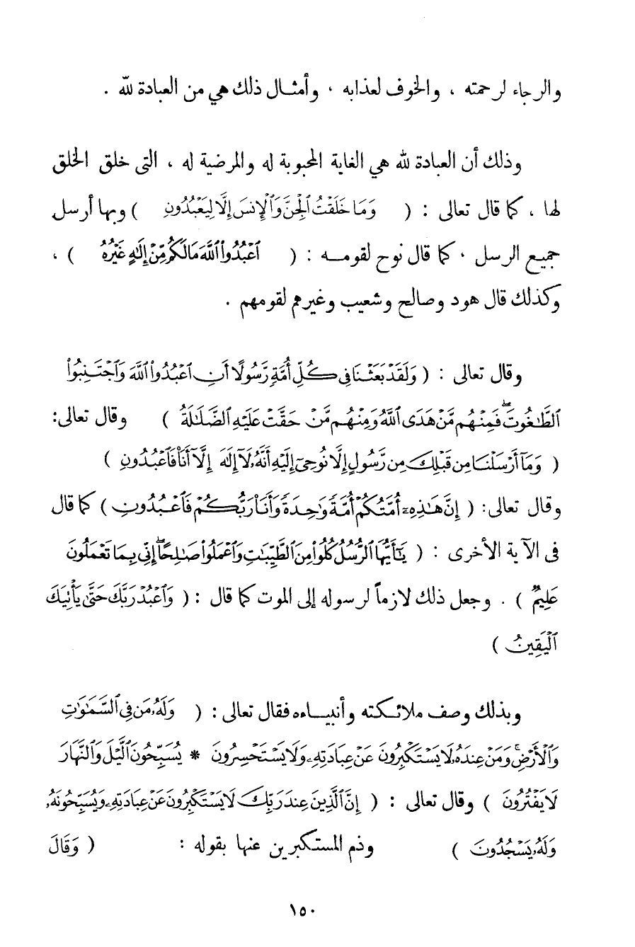 وَالرَّجَاءُ لِرَحْمَتِهِ وَالْخَوْفُ لِعَذَابِهِ وَأَمْثَالُ ذَلِكَ هِيَ مِنْ الْعِبَادَةِ لِلَّهِ. وَذَلِكَ أَنَّ الْعِبَادَةَ لِلَّهِ هِيَ الْغَايَةُ الْمَحْبُوبَةُ لَهُ وَالْمَرْضِيَّةُ لَهُ الَّتِي خَلَقَ الْخَلْقَ لَهَا كَمَا قَالَ تَعَالَى: {وَمَا خَلَقْتُ الْجِنَّ وَالْإِنْسَ إلَّا لِيَعْبُدُونِ} وَبِهَا أَرْسَلَ جَمِيعَ الرُّسُلِ كَمَا قَالَ نُوحٌ لِقَوْمِهِ: {اعْبُدُوا اللَّهَ مَا لَكُمْ مِنْ إلَهٍ غَيْرُهُ} وَكَذَلِكَ قَالَ هُودٌ وَصَالِحٌ وَشُعَيْبٌ وَغَيْرُهُمْ لِقَوْمِهِمْ. وَقَالَ تَعَالَى: {وَلَقَدْ بَعَثْنَا فِي كُلِّ أُمَّةٍ رَسُولًا أَنِ اُعْبُدُوا اللَّهَ وَاجْتَنِبُوا الطَّاغُوتَ فَمِنْهُمْ مَنْ هَدَى اللَّهُ وَمِنْهُمْ مَنْ حَقَّتْ عَلَيْهِ الضَّلَالَةُ} وَقَالَ تَعَالَى: {وَمَا أَرْسَلْنَا مِنْ قَبْلِكَ مِنْ رَسُولٍ إلَّا نُوحِي إلَيْهِ أَنَّهُ لَا إلَهَ إلَّا أَنَا فَاعْبُدُونِ} وَقَالَ تَعَالَى: {إِنَّ هَذِهِ أُمَّتُكُمْ أُمَّةً وَاحِدَةً وَأَنَا رَبُّكُمْ فَاتَّقُونِ} كَمَا قَالَ فِي الْآيَةِ الْأُخْرَى: {يَا أَيُّهَا الرُّسُلُ كُلُوا مِنَ الطَّيِّبَاتِ وَاعْمَلُوا صَالِحًا إنِّي بِمَا تَعْمَلُونَ عَلِيمٌ} . وَجَعَلَ ذَلِكَ لَازِمًا لِرَسُولِهِ إلَى الْمَوْتِ كَمَا قَالَ: {وَاعْبُدْ رَبَّكَ حَتَّى يَأْتِيَكَ الْيَقِينُ} وَبِذَلِكَ وَصَفَ مَلَائِكَتَهُ وَأَنْبِيَاءَهُ فَقَالَ تَعَالَى: {وَلَهُ مَنْ فِي السَّمَاوَاتِ وَالْأَرْضِ وَمَنْ عِنْدَهُ لَا يَسْتَكْبِرُونَ عَنْ عِبَادَتِهِ وَلَا يَسْتَحْسِرُونَ} {يُسَبِّحُونَ اللَّيْلَ وَالنَّهَارَ لَا يَفْتُرُونَ} وَقَالَ تَعَالَى: {إنَّ الَّذِينَ عِنْدَ رَبِّكَ لَا يَسْتَكْبِرُونَ عَنْ عِبَادَتِهِ وَيُسَبِّحُونَهُ وَلَهُ يَسْجُدُونَ} وَذَمَّ الْمُسْتَكْبِرِينَ عَنْهَا بِقَوْلِهِ: {وَقَالَ