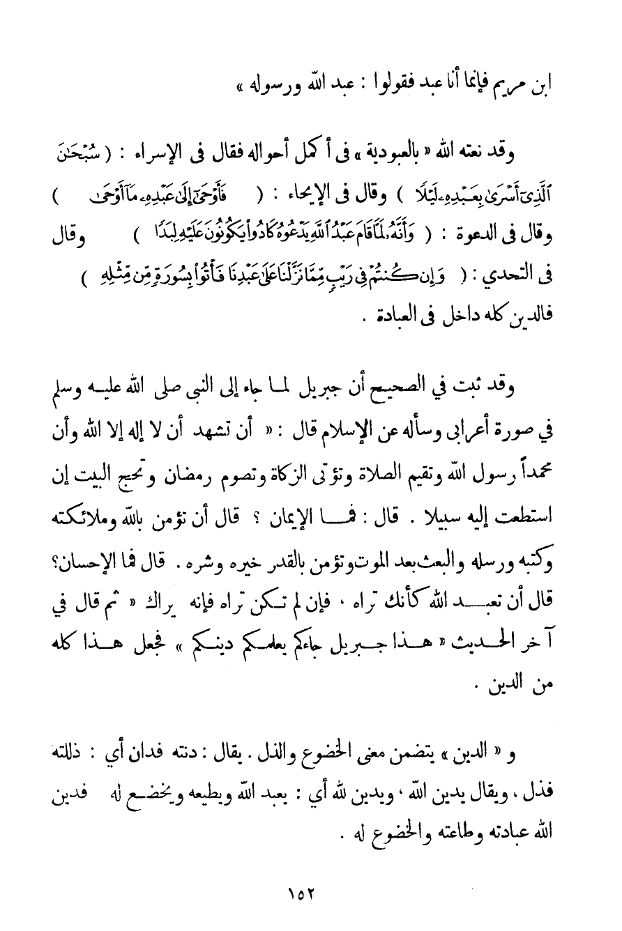 ابْنَ مَرْيَمَ فَإِنَّمَا أَنَا عَبْدٌ فَقُولُوا: عَبْدُ اللَّهِ وَرَسُولُهُ} وَقَدْ نَعَتَهُ اللَّهُ " بِالْعُبُودِيَّةِ " فِي أَكْمَلِ أَحْوَالِهِ فَقَالَ فِي الْإِسْرَاءِ: {سُبْحَانَ الَّذِي أَسْرَى بِعَبْدِهِ لَيْلًا} وَقَالَ فِي الْإِيحَاءِ: {فَأَوْحَى إلَى عَبْدِهِ مَا أَوْحَى} وَقَالَ فِي الدَّعْوَةِ: {وَأَنَّهُ لَمَّا قَامَ عَبْدُ اللَّهِ يَدْعُوهُ كَادُوا يَكُونُونَ عَلَيْهِ لِبَدًا} وَقَالَ فِي التَّحَدِّي: {وَإِنْ كُنْتُمْ فِي رَيْبٍ مِمَّا نَزَّلْنَا عَلَى عَبْدِنَا فَأْتُوا بِسُورَةٍ مِنْ مِثْلِهِ} فَالدِّينُ كُلُّهُ دَاخِلٌ فِي الْعِبَادَةِ. وَقَدْ ثَبَتَ فِي الصَّحِيحِ {أَنَّ جِبْرِيلَ لَمَّا جَاءَ إلَى النَّبِيِّ صَلَّى اللَّهُ عَلَيْهِ وَسَلَّمَ فِي صُورَةِ أَعْرَابِيٍّ وَسَأَلَهُ عَنْ الْإِسْلَامِ قَالَ: أَنْ تَشْهَدَ أَنْ لَا إلَهَ إلَّا اللَّهُ وَأَنَّ مُحَمَّدًا رَسُولُ اللَّهِ وَتُقِيمَ الصَّلَاةَ وَتُؤْتِيَ الزَّكَاةَ وَتَصُومَ رَمَضَانَ وَتَحُجَّ الْبَيْتَ إنْ اسْتَطَعْت إلَيْهِ سَبِيلًا. قَالَ: فَمَا الْإِيمَانُ؟ قَالَ أَنْ تُؤْمِنَ بِاَللَّهِ وَمَلَائِكَتِهِ وَكُتُبِهِ وَرُسُلِهِ وَالْبَعْثِ بَعْدَ الْمَوْتِ وَتُؤْمِنَ بِالْقَدَرِ خَيْرِهِ وَشَرِّهِ. قَالَ فَمَا الْإِحْسَانُ؟ قَالَ أَنْ تَعْبُدَ اللَّهَ كَأَنَّك تَرَاهُ فَإِنْ لَمْ تَكُنْ تَرَاهُ فَإِنَّهُ يَرَاك ثُمَّ قَالَ فِي آخِرِ الْحَدِيثِ هَذَا جِبْرِيلُ جَاءَكُمْ يُعَلِّمُكُمْ دِينَكُمْ} فَجَعَلَ هَذَا كُلَّهُ مِنْ الدِّينِ. وَ " الدِّينُ " يَتَضَمَّنُ مَعْنَى الْخُضُوعِ وَالذُّلِّ. يُقَالُ: دِنْته فَدَانَ أَيْ: ذَلَّلْته فَذَلَّ وَيُقَالُ يَدِينُ اللَّهَ وَيَدِينُ لِلَّهِ أَيْ: يَعْبُدُ اللَّهَ وَيُطِيعُهُ وَيَخْضَعُ لَهُ فَدِينُ اللَّهِ عِبَادَتُهُ وَطَاعَتُهُ وَالْخُضُوعُ لَهُ.