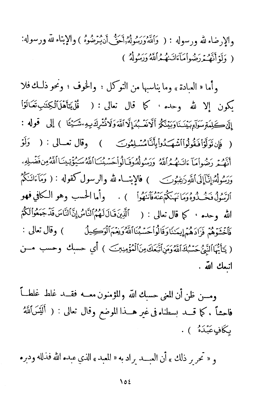 وَالْإِرْضَاءَ لِلَّهِ وَرَسُولِهِ: {وَاللَّهُ وَرَسُولُهُ أَحَقُّ أَنْ يُرْضُوهُ} وَالْإِيتَاءُ لِلَّهِ وَرَسُولِهِ: {وَلَوْ أَنَّهُمْ رَضُوا مَا آتَاهُمُ اللَّهُ وَرَسُولُهُ} . وَأَمَّا " الْعِبَادَةُ " وَمَا يُنَاسِبُهَا مِنْ التَّوَكُّلِ؛ وَالْخَوْفِ؛ وَنَحْوِ ذَلِكَ فَلَا يَكُونُ إلَّا لِلَّهِ وَحْدَهُ كَمَا قَالَ تَعَالَى: {قُلْ يَا أَهْلَ الْكِتَابِ تَعَالَوْا إلَى كَلِمَةٍ سَوَاءٍ بَيْنَنَا وَبَيْنَكُمْ أَلَّا نَعْبُدَ إلَّا اللَّهَ وَلَا نُشْرِكَ بِهِ شَيْئًا} إلَى قَوْلِهِ: {فَإِنْ تَوَلَّوْا فَقُولُوا اشْهَدُوا بِأَنَّا مُسْلِمُونَ} وَقَالَ تَعَالَى: {وَلَوْ أَنَّهُمْ رَضُوا مَا آتَاهُمُ اللَّهُ وَرَسُولُهُ وَقَالُوا حَسْبُنَا اللَّهُ سَيُؤْتِينَا اللَّهُ مِنْ فَضْلِهِ وَرَسُولُهُ إنَّا إلَى اللَّهِ رَاغِبُونَ} فَالْإِيتَاءُ لِلَّهِ وَالرَّسُولِ كَقَوْلِهِ: {وَمَا آتَاكُمُ الرَّسُولُ فَخُذُوهُ وَمَا نَهَاكُمْ عَنْهُ فَانْتَهُوا} . وَأَمَّا الحسب وَهُوَ الْكَافِي فَهُوَ اللَّهُ وَحْدَهُ كَمَا قَالَ تَعَالَى: {الَّذِينَ قَالَ لَهُمُ النَّاسُ إنَّ النَّاسَ قَدْ جَمَعُوا لَكُمْ فَاخْشَوْهُمْ فَزَادَهُمْ إيمَانًا وَقَالُوا حَسْبُنَا اللَّهُ وَنِعْمَ الْوَكِيلُ} وَقَالَ تَعَالَى: {يَا أَيُّهَا النَّبِيُّ حَسْبُكَ اللَّهُ وَمَنِ اتَّبَعَكَ مِنَ الْمُؤْمِنِينَ} أَيْ حَسْبُك وَحَسْبُ مَنْ اتَّبَعَك اللَّهُ. وَمَنْ ظَنَّ أَنَّ الْمَعْنَى حَسْبُك اللَّهُ وَالْمُؤْمِنُونَ مَعَهُ فَقَدْ غَلِطَ غَلَطًا فَاحِشًا كَمَا قَدْ بَسَطْنَاهُ فِي غَيْرِ هَذَا الْمَوْضِعِ وَقَالَ تَعَالَى: {أَلَيْسَ اللَّهُ بِكَافٍ عَبْدَهُ} . وَ " تَحْرِيرُ ذَلِكَ " أَنَّ الْعَبْدَ يُرَادُ بِهِ " الْمُعَبَّدُ " الَّذِي عَبَّدَهُ اللَّهُ فَذَلَّلَهُ وَدَبَّرَهُ