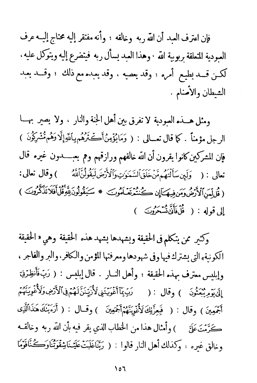 فَإِنْ اعْتَرَفَ الْعَبْدُ أَنَّ اللَّهَ رَبُّهُ وَخَالِقُهُ؛ وَأَنَّهُ مُفْتَقِرٌ إلَيْهِ مُحْتَاجٌ إلَيْهِ عَرَفَ الْعُبُودِيَّةَ الْمُتَعَلِّقَةَ بِرُبُوبِيَّةِ اللَّهِ وَهَذَا الْعَبْدُ يَسْأَلُ رَبَّهُ فَيَتَضَرَّعُ إلَيْهِ وَيَتَوَكَّلُ عَلَيْهِ لَكِنْ قَدْ يُطِيعُ أَمْرَهُ؛ وَقَدْ يَعْصِيهِ وَقَدْ يَعْبُدُهُ مَعَ ذَلِكَ؛ وَقَدْ يَعْبُدُ الشَّيْطَانَ وَالْأَصْنَامَ. وَمِثْلُ هَذِهِ الْعُبُودِيَّةِ لَا تُفَرِّقُ بَيْنَ أَهْلِ الْجَنَّةِ وَالنَّارِ وَلَا يَصِيرُ بِهَا الرَّجُلُ مُؤْمِنًا. كَمَا قَالَ تَعَالَى: {وَمَا يُؤْمِنُ أَكْثَرُهُمْ بِاللَّهِ إلَّا وَهُمْ مُشْرِكُونَ} فَإِنَّ الْمُشْرِكِينَ كَانُوا يُقِرُّونَ أَنَّ اللَّهَ خَالِقُهُمْ وَرَازِقُهُمْ وَهُمْ يَعْبُدُونَ غَيْرَهُ قَالَ تَعَالَى: {وَلَئِنْ سَأَلْتَهُمْ مَنْ خَلَقَ السَّمَاوَاتِ وَالْأَرْضَ لَيَقُولُنَّ اللَّهُ} وَقَالَ تَعَالَى: {قُلْ لِمَنِ الْأَرْضُ وَمَنْ فِيهَا إنْ كُنْتُمْ تَعْلَمُونَ} {سَيَقُولُونَ لِلَّهِ قُلْ أَفَلَا تَذَكَّرُونَ} إلَى قَوْلِهِ: {قُلْ فَأَنَّى تُسْحَرُونَ} وَكَثِيرٌ مِمَّنْ يَتَكَلَّمُ فِي الْحَقِيقَةِ وَيَشْهَدُهَا يَشْهَدُ هَذِهِ الْحَقِيقَةَ وَهِيَ " الْحَقِيقَةُ الْكَوْنِيَّةُ " الَّتِي يَشْتَرِكُ فِيهَا وَفِي شُهُودِهَا وَمَعْرِفَتِهَا الْمُؤْمِنُ وَالْكَافِرُ وَالْبَرُّ وَالْفَاجِرُ وَإِبْلِيسُ مُعْتَرِفٌ بِهَذِهِ الْحَقِيقَةِ؛ وَأَهْلُ النَّارِ. قَالَ إبْلِيسُ: {رَبِّ فَأَنْظِرْنِي إلَى يَوْمِ يُبْعَثُونَ} وَقَالَ: {رَبِّ بِمَا أَغْوَيْتَنِي لَأُزَيِّنَنَّ لَهُمْ فِي الْأَرْضِ وَلَأُغْوِيَنَّهُمْ أَجْمَعِينَ} وَقَالَ: {فَبِعِزَّتِكَ لَأُغْوِيَنَّهُمْ أَجْمَعِينَ} وَقَالَ: {أَرَأَيْتَكَ هَذَا الَّذِي كَرَّمْتَ عَلَيَّ} وَأَمْثَالَ هَذَا مِنْ الْخِطَابِ الَّذِي يُقِرُّ فِيهِ بِأَنَّ اللَّهَ رَبُّهُ وَخَالِقُهُ وَخَالِقُ غَيْرِهِ؛ وَكَذَلِكَ أَهْلُ النَّارِ قَالُوا: {رَبَّنَا غَلَبَتْ عَلَيْنَا شِقْوَتُنَا وَكُنَّا