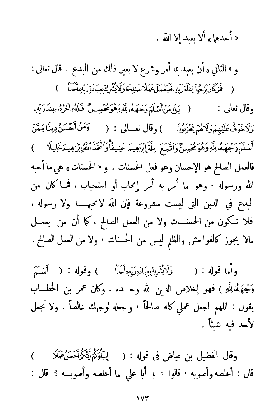 " أَحَدُهُمَا " أَلَّا يُعْبَدَ إلَّا اللَّهُ. وَ " الثَّانِي " أَنْ يُعْبَدَ بِمَا أَمَرَ وَشَرَعَ لَا بِغَيْرِ ذَلِكَ مِنْ الْبِدَعِ. قَالَ تَعَالَى: {فَمَنْ كَانَ يَرْجُوا لِقَاءَ رَبِّهِ فَلْيَعْمَلْ عَمَلًا صَالِحًا وَلَا يُشْرِكْ بِعِبَادَةِ رَبِّهِ أَحَدًا} وَقَالَ تَعَالَى: {بَلَى مَنْ أَسْلَمَ وَجْهَهُ لِلَّهِ وَهُوَ مُحْسِنٌ فَلَهُ أَجْرُهُ عِنْدَ رَبِّهِ وَلَا خَوْفٌ عَلَيْهِمْ وَلَا هُمْ يَحْزَنُونَ} وَقَالَ تَعَالَى: {وَمَنْ أَحْسَنُ دِينًا مِمَّنْ أَسْلَمَ وَجْهَهُ لِلَّهِ وَهُوَ مُحْسِنٌ وَاتَّبَعَ مِلَّةَ إبْرَاهِيمَ حَنِيفًا وَاتَّخَذَ اللَّهُ إبْرَاهِيمَ خَلِيلًا} فَالْعَمَلُ الصَّالِحُ هُوَ الْإِحْسَانُ وَهُوَ فِعْلُ الْحَسَنَاتِ. و " الْحَسَنَاتُ " هِيَ مَا أَحَبَّهُ اللَّهُ وَرَسُولُهُ وَهُوَ مَا أَمَرَ بِهِ أَمْرَ إيجَابٍ أَوْ اسْتِحْبَابٍ فَمَا كَانَ مِنْ الْبِدَعِ فِي الدِّينِ الَّتِي لَيْسَتْ مَشْرُوعَةً فَإِنَّ اللَّهَ لَا يُحِبُّهَا وَلَا رَسُولُهُ فَلَا تَكُونُ مِنْ الْحَسَنَاتِ وَلَا مِنْ الْعَمَلِ الصَّالِحِ كَمَا أَنَّ مَنْ يَعْمَلُ مَا لَا يَجُوزُ كَالْفَوَاحِشِ وَالظُّلْمِ لَيْسَ مِنْ الْحَسَنَاتِ وَلَا مِنْ الْعَمَلِ الصَّالِحِ. وَأَمَّا قَوْلُهُ. {وَلَا يُشْرِكْ بِعِبَادَةِ رَبِّهِ أَحَدًا} وَقَوْلُهُ: {أَسْلَمَ وَجْهَهُ لِلَّهِ} فَهُوَ إخْلَاصُ الدِّينِ لِلَّهِ وَحْدَهُ وَكَانَ عُمَرُ بْنُ الْخَطَّابِ يَقُولُ: اللَّهُمَّ اجْعَلْ عَمَلِي كُلَّهُ صَالِحًا وَاجْعَلْهُ لِوَجْهِكَ خَالِصًا وَلَا تَجْعَلْ لِأَحَدِ فِيهِ شَيْئًا. وَقَالَ الْفُضَيْل بْنُ عِيَاضٍ فِي قَوْلِهِ: {لِيَبْلُوَكُمْ أَيُّكُمْ أَحْسَنُ عَمَلًا} قَالَ: أَخْلَصُهُ وَأَصْوَبُهُ قَالُوا: يَا أَبَا عَلِيٍّ مَا أَخْلَصُهُ وَأَصْوَبُهُ؟ قَالَ: