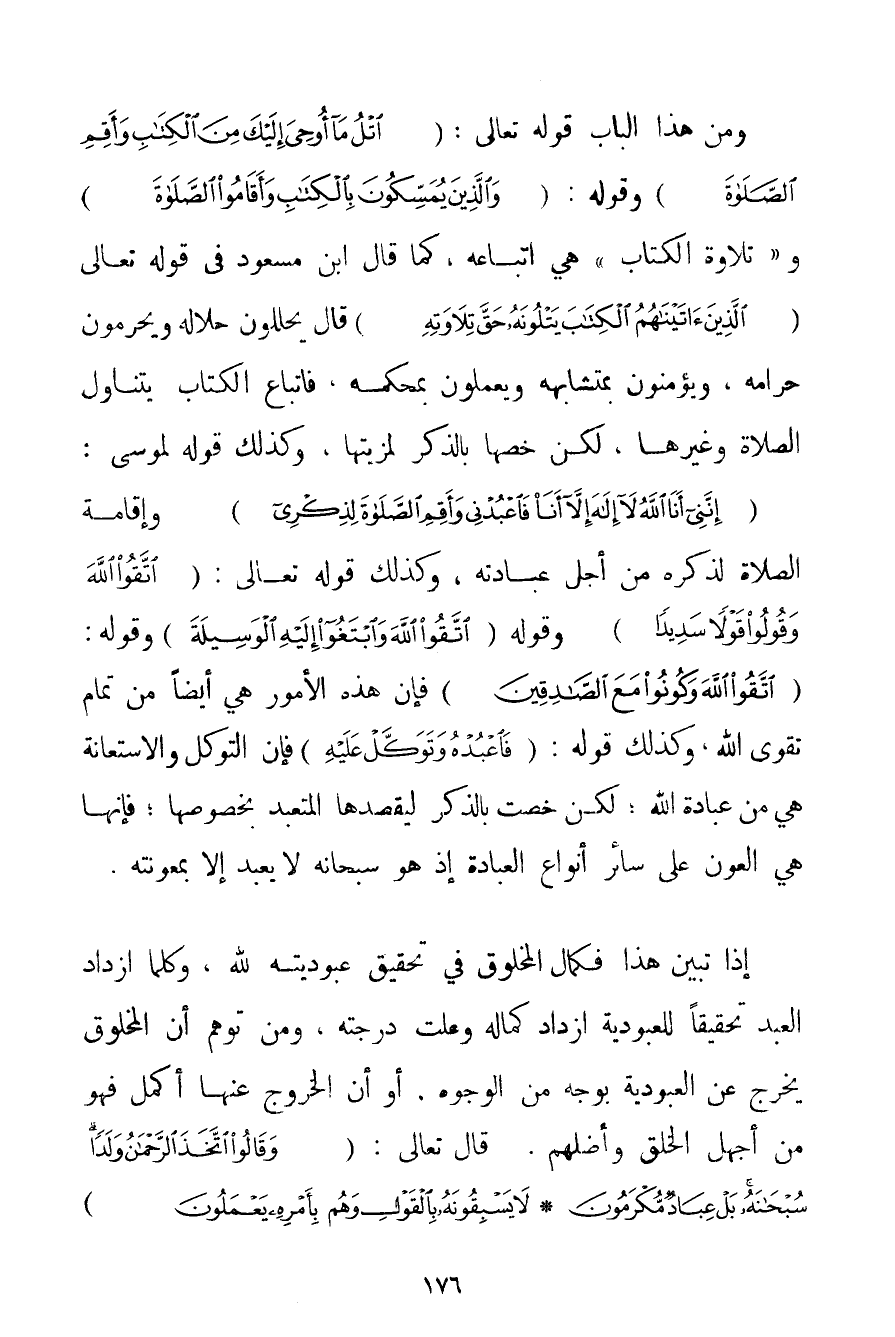 وَمِنْ هَذَا الْبَابِ قَوْله تَعَالَى {اتْلُ مَا أُوحِيَ إلَيْكَ مِنَ الْكِتَابِ وَأَقِمِ الصَّلَاةَ} وَقَوْلُهُ: {وَالَّذِينَ يُمَسِّكُونَ بِالْكِتَابِ وَأَقَامُوا الصَّلَاةَ} و " تِلَاوَةُ الْكِتَابِ " هِيَ اتِّبَاعُهُ كَمَا قَالَ ابْنُ مَسْعُودٍ فِي قَوْله تَعَالَى {الَّذِينَ آتَيْنَاهُمُ الْكِتَابَ يَتْلُونَهُ حَقَّ تِلَاوَتِهِ} قَالَ يُحَلِّلُونَ حَلَالَهُ وَيُحَرِّمُونَ حَرَامَهُ وَيُؤْمِنُونَ بِمُتَشَابِهِهِ وَيَعْمَلُونَ بِمُحْكَمِهِ فَاتِّبَاعُ الْكِتَابِ يَتَنَاوَلُ الصَّلَاةَ وَغَيْرَهَا لَكِنْ خَصَّهَا بِالذِّكْرِ لِمَزِيَّتِهَا وَكَذَلِكَ قَوْلُهُ لِمُوسَى: {إنَّنِي أَنَا اللَّهُ لَا إلَهَ إلَّا أَنَا فَاعْبُدْنِي وَأَقِمِ الصَّلَاةَ لِذِكْرِي} وَإِقَامَةُ الصَّلَاةِ لِذِكْرِهِ مِنْ أَجْلِ عِبَادَتِهِ وَكَذَلِكَ قَوْله تَعَالَى {اتَّقُوا اللَّهَ وَقُولُوا قَوْلًا سَدِيدًا} وَقَوْلُهُ {اتَّقُوا اللَّهَ وَابْتَغُوا إلَيْهِ الْوَسِيلَةَ} وَقَوْلُهُ: {اتَّقُوا اللَّهَ وَكُونُوا مَعَ الصَّادِقِينَ} فَإِنَّ هَذِهِ الْأُمُورَ هِيَ أَيْضًا مِنْ تَمَامِ تَقْوَى اللَّهِ وَكَذَلِكَ قَوْلُهُ: {فَاعْبُدْهُ وَتَوَكَّلْ عَلَيْهِ} فَإِنَّ التَّوَكُّلَ وَالِاسْتِعَانَةَ هِيَ مِنْ عِبَادَةِ اللَّهِ؛ لَكِنْ خُصَّتْ بِالذِّكْرِ لِيَقْصِدَهَا الْمُتَعَبِّدُ بِخُصُوصِهَا؛ فَإِنَّهَا هِيَ الْعَوْنُ عَلَى سَائِرِ أَنْوَاعِ الْعِبَادَةِ إذْ هُوَ سُبْحَانَهُ لَا يُعْبَدُ إلَّا بِمَعُونَتِهِ. إذَا تَبَيَّنَ هَذَا فَكَمَالُ الْمَخْلُوقِ فِي تَحْقِيقِ عُبُودِيَّتِهِ لِلَّهِ وَكُلَّمَا ازْدَادَ الْعَبْدُ تَحْقِيقًا لِلْعُبُودِيَّةِ ازْدَادَ كَمَالِهِ وَعَلَتْ دَرَجَتُهُ وَمَنْ تَوَهَّمَ أَنَّ الْمَخْلُوقَ يَخْرُجُ عَنْ الْعُبُودِيَّةِ بِوَجْهِ مِنْ الْوُجُوهِ. أَوْ أَنَّ الْخُرُوجَ عَنْهَا أَكْمَلُ فَهُوَ مِنْ أَجْهَلِ الْخَلْقِ وَأَضَلِّهِمْ. قَالَ تَعَالَى: {وَقَالُوا اتَّخَذَ الرَّحْمَنُ وَلَدًا سُبْحَانَهُ بَلْ عِبَادٌ مُكْرَمُونَ} {لَا يَسْبِقُونَهُ بِالْقَوْلِ وَهُمْ بِأَمْرِهِ يَعْمَلُونَ}