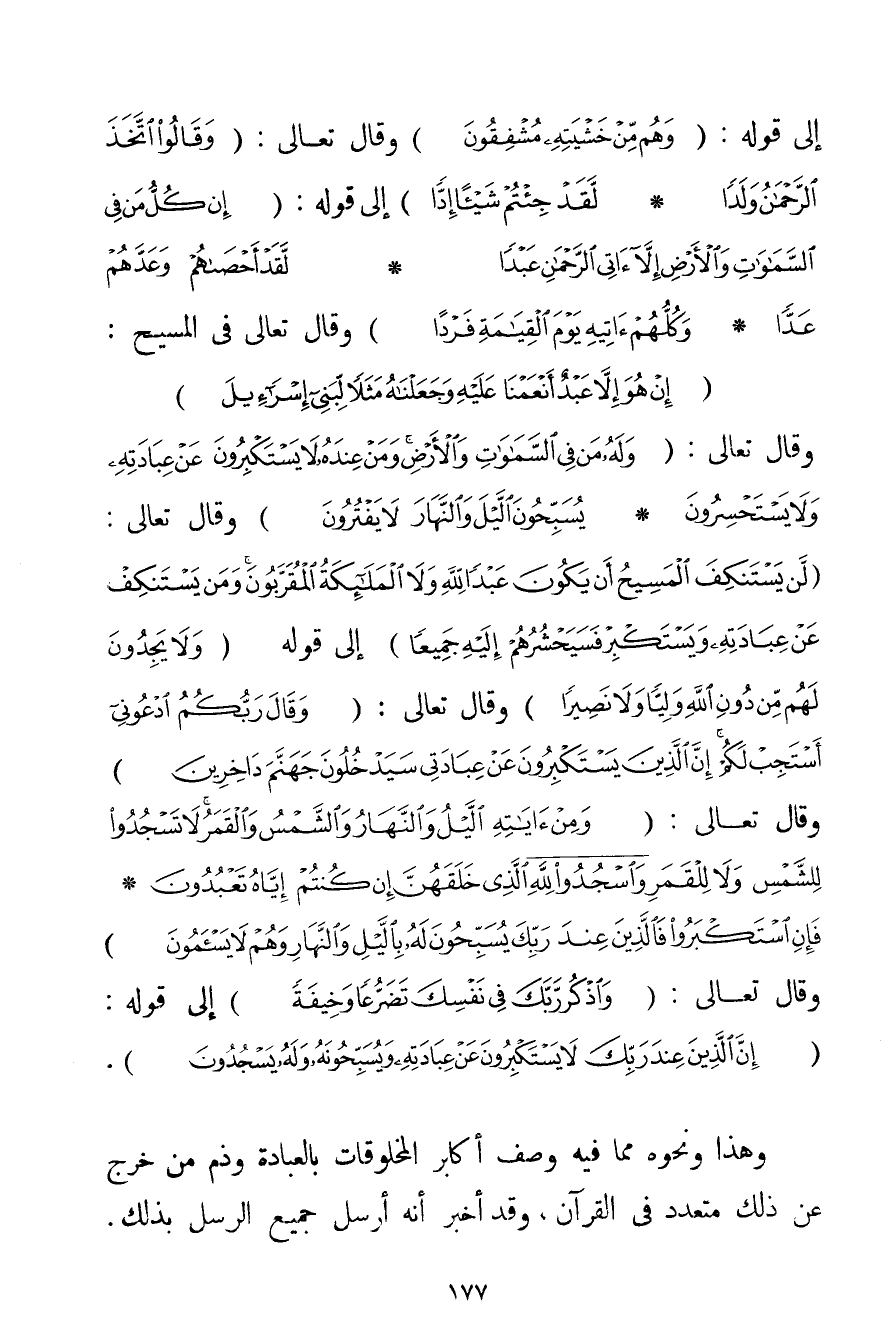إلَى قَوْلِهِ: {وَهُمْ مِنْ خَشْيَتِهِ مُشْفِقُونَ} وَقَالَ تَعَالَى: {وَقَالُوا اتَّخَذَ الرَّحْمَنُ وَلَدًا} {لَقَدْ جِئْتُمْ شَيْئًا إدًّا} إلَى قَوْلِهِ: {إنْ كُلُّ مَنْ فِي السَّمَاوَاتِ وَالْأَرْضِ إلَّا آتِي الرَّحْمَنِ عَبْدًا} {لَقَدْ أَحْصَاهُمْ وَعَدَّهُمْ عَدًّا} {وَكُلُّهُمْ آتِيهِ يَوْمَ الْقِيَامَةِ فَرْدًا} وَقَالَ تَعَالَى فِي الْمَسِيحِ: {إنْ هُوَ إلَّا عَبْدٌ أَنْعَمْنَا عَلَيْهِ وَجَعَلْنَاهُ مَثَلًا لِبَنِي إسْرَائِيلَ} وَقَالَ تَعَالَى: {وَلَهُ مَنْ فِي السَّمَاوَاتِ وَالْأَرْضِ وَمَنْ عِنْدَهُ لَا يَسْتَكْبِرُونَ عَنْ عِبَادَتِهِ وَلَا يَسْتَحْسِرُونَ} {يُسَبِّحُونَ اللَّيْلَ وَالنَّهَارَ لَا يَفْتُرُونَ} وَقَالَ تَعَالَى: {لَنْ يَسْتَنْكِفَ الْمَسِيحُ أَنْ يَكُونَ عَبْدًا لِلَّهِ وَلَا الْمَلَائِكَةُ الْمُقَرَّبُونَ وَمَنْ يَسْتَنْكِفْ عَنْ عِبَادَتِهِ وَيَسْتَكْبِرْ فَسَيَحْشُرُهُمْ إلَيْهِ جَمِيعًا} إلَى قَوْلِهِ {وَلَا يَجِدُونَ لَهُمْ مِنْ دُونِ اللَّهِ وَلِيًّا وَلَا نَصِيرًا} وَقَالَ تَعَالَى: {وَقَالَ رَبُّكُمُ ادْعُونِي أَسْتَجِبْ لَكُمْ إنَّ الَّذِينَ يَسْتَكْبِرُونَ عَنْ عِبَادَتِي سَيَدْخُلُونَ جَهَنَّمَ دَاخِرِينَ} وَقَالَ تَعَالَى: {وَمِنْ آيَاتِهِ اللَّيْلُ وَالنَّهَارُ وَالشَّمْسُ وَالْقَمَرُ لَا تَسْجُدُوا لِلشَّمْسِ وَلَا لِلْقَمَرِ وَاسْجُدُوا لِلَّهِ الَّذِي خَلَقَهُنَّ إنْ كُنْتُمْ إيَّاهُ تَعْبُدُونَ} {فَإِنِ اسْتَكْبَرُوا فَالَّذِينَ عِنْدَ رَبِّكَ يُسَبِّحُونَ لَهُ بِاللَّيْلِ وَالنَّهَارِ وَهُمْ لَا يَسْأَمُونَ} وَقَالَ تَعَالَى: {وَاذْكُرْ رَبَّكَ فِي نَفْسِكَ تَضَرُّعًا وَخِيفَةً} إلَى قَوْلِهِ: {إنَّ الَّذِينَ عِنْدَ رَبِّكَ لَا يَسْتَكْبِرُونَ عَنْ عِبَادَتِهِ وَيُسَبِّحُونَهُ وَلَهُ يَسْجُدُونَ} . وَهَذَا وَنَحْوُهُ مِمَّا فِيهِ وَصْفُ أَكَابِرِ الْمَخْلُوقَاتِ بِالْعِبَادَةِ وَذَمُّ مَنْ خَرَجَ عَنْ ذَلِكَ مُتَعَدِّدٌ فِي الْقُرْآنِ وَقَدْ أَخْبَرَ أَنَّهُ أَرْسَلَ جَمِيعَ الرُّسُلِ بِذَلِكَ.