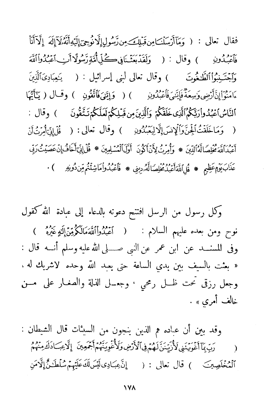 فَقَالَ تَعَالَى: {وَمَا أَرْسَلْنَا مِنْ قَبْلِكَ مِنْ رَسُولٍ إلَّا نُوحِي إلَيْهِ أَنَّهُ لَا إلَهَ إلَّا أَنَا فَاعْبُدُونِ} وَقَالَ: {وَلَقَدْ بَعَثْنَا فِي كُلِّ أُمَّةٍ رَسُولًا أَنِ اُعْبُدُوا اللَّهَ وَاجْتَنِبُوا الطَّاغُوتَ} وَقَالَ تَعَالَى لِبَنِي إسْرَائِيلَ: {يَا عِبَادِيَ الَّذِينَ آمَنُوا إنَّ أَرْضِي وَاسِعَةٌ فَإِيَّايَ فَاعْبُدُونِ} {وَإِيَّايَ فَاتَّقُونِ} وَقَالَ {يَا أَيُّهَا النَّاسُ اعْبُدُوا رَبَّكُمُ الَّذِي خَلَقَكُمْ وَالَّذِينَ مِنْ قَبْلِكُمْ لَعَلَّكُمْ تَتَّقُونَ} وَقَالَ: {وَمَا خَلَقْتُ الْجِنَّ وَالْإِنْسَ إلَّا لِيَعْبُدُونِ} وَقَالَ تَعَالَى: {قُلْ إنِّي أُمِرْتُ أَنْ أَعْبُدَ اللَّهَ مُخْلِصًا لَهُ الدِّينَ} {وَأُمِرْتُ لِأَنْ أَكُونَ أَوَّلَ الْمُسْلِمِينَ} {قُلْ إنِّي أَخَافُ إنْ عَصَيْتُ رَبِّي عَذَابَ يَوْمٍ عَظِيمٍ} {قُلِ اللَّهَ أَعْبُدُ مُخْلِصًا لَهُ دِينِي} {فَاعْبُدُوا مَا شِئْتُمْ مِنْ دُونِهِ} . وَكُلُّ رَسُولٍ مِنْ الرُّسُلِ افْتَتَحَ دَعْوَتَهُ بِالدُّعَاءِ إلَى عِبَادَةِ اللَّهِ كَقَوْلِ نُوحٍ وَمَنْ بَعْدَهُ عَلَيْهِمْ السَّلَامُ {اعْبُدُوا اللَّهَ مَا لَكُمْ مِنْ إلَهٍ غَيْرُهُ} وَفِي الْمُسْنَدِ عَنْ ابْنِ عُمَرَ عَنْ النَّبِيِّ صَلَّى اللَّهُ عَلَيْهِ وَسَلَّمَ أَنَّهُ قَالَ: {بُعِثْتُ بِالسَّيْفِ بَيْنَ يَدَيْ السَّاعَةِ حَتَّى يُعْبَدَ اللَّهُ وَحْدَهُ لَا شَرِيكَ لَهُ وَجُعِلَ رِزْقِي تَحْتَ ظِلِّ رُمْحِي وَجُعِلَ الذُّلُّ وَالصَّغَارُ عَلَى مَنْ خَالَفَ أَمْرِي} . وَقَدْ بَيَّنَ أَنَّ عِبَادَهُ هُمْ الَّذِينَ يَنْجُونَ مِنْ السَّيِّئَاتِ قَالَ الشَّيْطَانُ: {رَبِّ بِمَا أَغْوَيْتَنِي لَأُزَيِّنَنَّ لَهُمْ فِي الْأَرْضِ وَلَأُغْوِيَنَّهُمْ أَجْمَعِينَ} {إلَّا عِبَادَكَ مِنْهُمُ الْمُخْلَصِينَ} قَالَ تَعَالَى: {إنَّ عِبَادِي لَيْسَ لَكَ عَلَيْهِمْ سُلْطَانٌ إلَّا