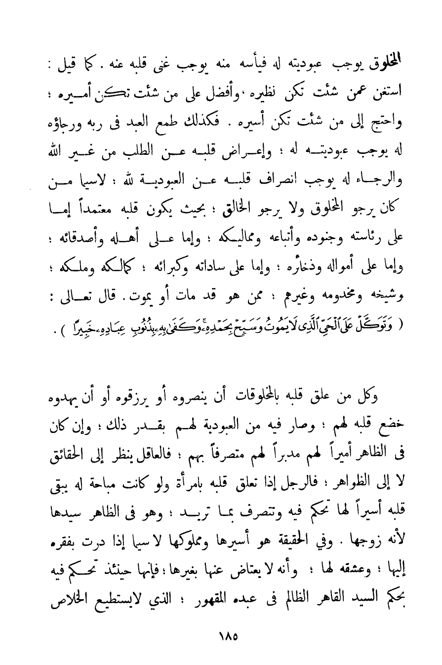 عَمَّنْ شِئْتَ تَكُنْ نَظِيرَهُ وَأَفْضِلْ عَلَى مَنْ شِئْتَ تَكُنْ أَمِيرَهُ؛ وَاحْتَجْ إلَى مَنْ شِئْتَ تَكُنْ أَسِيرَهُ. فَكَذَلِكَ طَمَعُ الْعَبْدِ فِي رَبِّهِ وَرَجَاؤُهُ لَهُ يُوجِبُ عُبُودِيَّتَهُ لَهُ؛ وَإِعْرَاضَ قَلْبِهِ عَنْ الطَّلَبِ مِنْ غَيْرِ اللَّهِ، وَالرَّجَاءِ لَهُ يُوجِبُ انْصِرَافَ قَلْبِهِ عَنْ الْعُبُودِيَّةِ لِلَّهِ؛ لَا سِيَّمَا مَنْ كَانَ يَرْجُو الْمَخْلُوقَ وَلَا يَرْجُو الْخَالِقَ؛ بِحَيْثُ يَكُونُ قَلْبُهُ مُعْتَمِدًا إمَّا عَلَى رِئَاسَتِهِ وَجُنُودِهِ وَأَتْبَاعِهِ وَمَمَالِيكِهِ؛ وَإِمَّا عَلَى أَهْلِهِ وَأَصْدِقَائِهِ؛ وَإِمَّا عَلَى أَمْوَالِهِ وَذَخَائِرِهِ؛ وَإِمَّا عَلَى سَادَاتِهِ وَكُبَرَائِهِ؛ كَمَالِكِهِ وَمَلِكِهِ؛ وَشَيْخِهِ وَمَخْدُومِهِ وَغَيْرِهِمْ؛ مِمَّنْ هُوَ قَدْ مَاتَ أَوْ يَمُوتُ. قَالَ تَعَالَى: {وَتَوَكَّلْ عَلَى الْحَيِّ الَّذِي لَا يَمُوتُ وَسَبِّحْ بِحَمْدِهِ وَكَفَى بِهِ بِذُنُوبِ عِبَادِهِ خَبِيرًا} . وَكُلُّ مَنْ عَلَّقَ قَلْبَهُ بِالْمَخْلُوقَاتِ أَنْ يَنْصُرُوهُ أَوْ يَرْزُقُوهُ أَوْ أَنْ يَهْدُوهُ خَضَعَ قَلْبُهُ لَهُمْ؛ وَصَارَ فِيهِ مِنْ الْعُبُودِيَّةِ لَهُمْ بِقَدْرِ ذَلِكَ؛ وَإِنْ كَانَ فِي الظَّاهِرِ أَمِيرًا لَهُمْ مُدَبِّرًا لَهُمْ مُتَصَرِّفًا بِهِمْ؛ فَالْعَاقِلُ يَنْظُرُ إلَى الْحَقَائِقِ لَا إلَى الظَّوَاهِرِ؛ فَالرَّجُلُ إذَا تَعَلَّقَ قَلْبُهُ بِامْرَأَةٍ وَلَوْ كَانَتْ مُبَاحَةً لَهُ يَبْقَى قَلْبُهُ أَسِيرًا لَهَا تَحْكُمُ فِيهِ وَتَتَصَرَّفُ بِمَا تُرِيدُ؛ وَهُوَ فِي الظَّاهِرِ سَيِّدُهَا لِأَنَّهُ زَوْجُهَا. وَفِي الْحَقِيقَةِ هُوَ أَسِيرُهَا وَمَمْلُوكُهَا لَا سِيَّمَا إذَا دَرَتْ بِفَقْرِهِ إلَيْهَا؛ وَعِشْقِهِ لَهَا؛ وَأَنَّهُ لَا يَعْتَاضُ عَنْهَا بِغَيْرِهَا؛ فَإِنَّهَا حِينَئِذٍ تَحْكُمُ فِيهِ بِحُكْمِ السَّيِّدِ الْقَاهِرِ الظَّالِمِ فِي عَبْدِهِ الْمَقْهُورِ؛ الَّذِي لَا يَسْتَطِيعُ الْخَلَاصَ