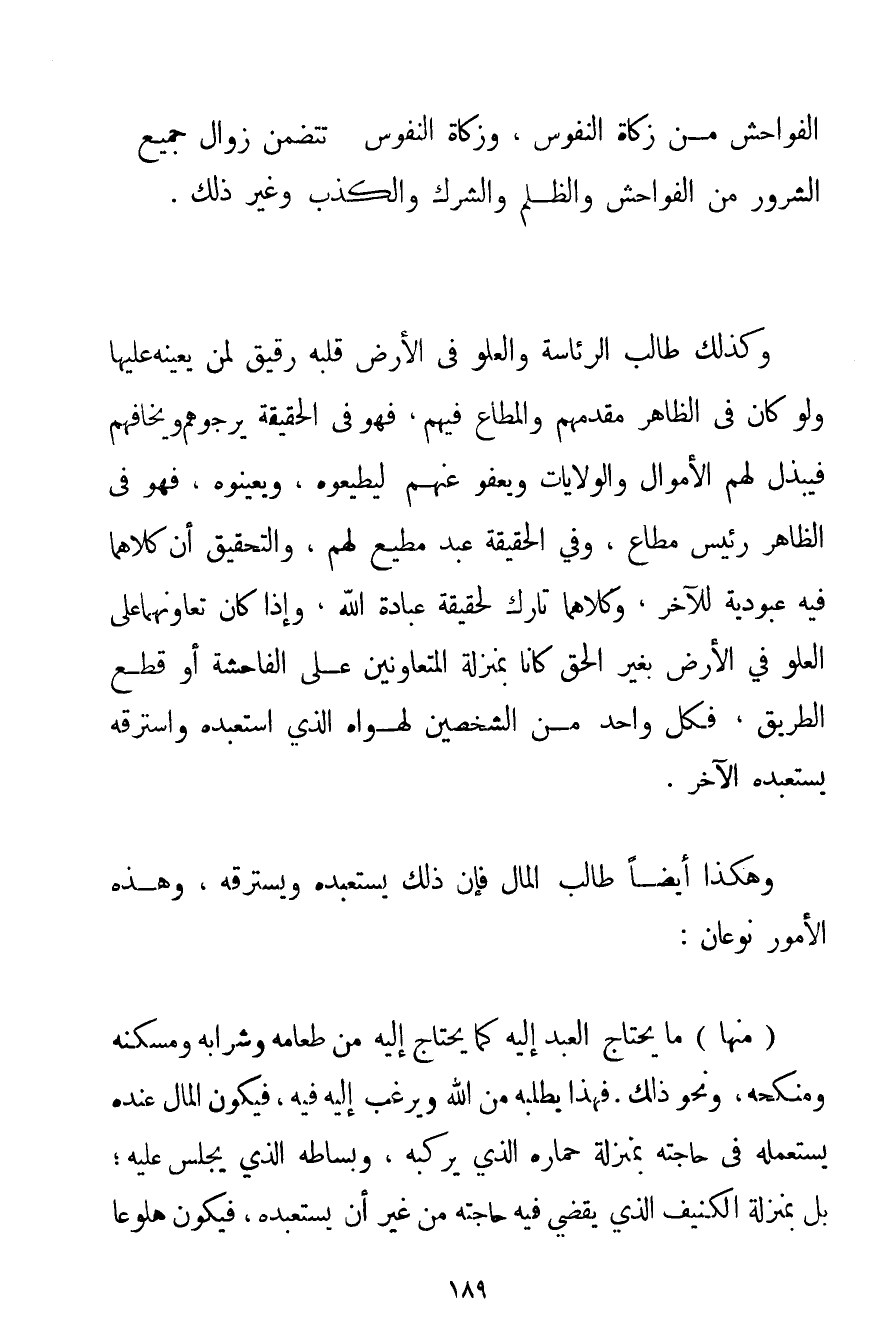 لِلنَّفْسِ وَبَيَّنَ أَنَّ تَرْكَ الْفَوَاحِشِ مِنْ زَكَاةِ النُّفُوسِ وَزَكَاةُ النُّفُوسِ تَتَضَمَّنُ زَوَالَ جَمِيعِ الشُّرُورِ مِنْ الْفَوَاحِشِ وَالظُّلْمِ وَالشِّرْكِ وَالْكَذِبِ وَغَيْرِ ذَلِكَ. وَكَذَلِكَ طَالِبُ الرِّئَاسَةِ وَالْعُلُوِّ فِي الْأَرْضِ قَلْبُهُ رَقِيقٌ لِمَنْ يُعِينُهُ عَلَيْهَا وَلَوْ كَانَ فِي الظَّاهِرِ مُقَدَّمَهُمْ وَالْمُطَاعَ فِيهِمْ فَهُوَ فِي الْحَقِيقَةِ يَرْجُوهُمْ وَيَخَافُهُمْ فَيَبْذُلُ لَهُمْ الْأَمْوَالَ وَالْوِلَايَاتِ وَيَعْفُو عَنْهُمْ لِيُطِيعُوهُ وَيُعِينُوهُ فَهُوَ فِي الظَّاهِرِ رَئِيسٌ مُطَاعٌ وَفِي الْحَقِيقَةِ عَبْدٌ مُطِيعٌ لَهُمْ وَالتَّحْقِيقُ أَنَّ كِلَاهُمَا فِيهِ عُبُودِيَّةٌ لِلْآخَرِ وَكِلَاهُمَا تَارِكٌ لِحَقِيقَةِ عِبَادَةِ اللَّهِ وَإِذَا كَانَ تَعَاوُنُهُمَا عَلَى الْعُلُوِّ فِي الْأَرْضِ بِغَيْرِ الْحَقِّ كَانَا بِمَنْزِلَةِ الْمُتَعَاوِنَيْنِ عَلَى الْفَاحِشَةِ أَوْ قَطْعِ الطَّرِيقِ فَكُلُّ وَاحِدٍ مِنْ الشَّخْصَيْنِ لِهَوَاهُ الَّذِي اسْتَعْبَدَهُ وَاسْتَرَقَّهُ يَسْتَعْبِدُهُ الْآخَرُ. وَهَكَذَا أَيْضًا طَالِبُ الْمَالِ فَإِنَّ ذَلِكَ يَسْتَعْبِدُهُ وَيَسْتَرِقُّهُ وَهَذِهِ الْأُمُورُ نَوْعَانِ: (مِنْهَا) مَا يَحْتَاجُ الْعَبْدُ إلَيْهِ كَمَا يَحْتَاجُ إلَيْهِ مِنْ طَعَامِهِ وَشَرَابِهِ وَمَسْكَنِهِ ومنكحه وَنَحْوِ ذَلِكَ. فَهَذَا يَطْلُبُهُ مِنْ اللَّهِ وَيَرْغَبُ إلَيْهِ فِيهِ فَيَكُونُ الْمَالُ عِنْدَهُ يَسْتَعْمِلُهُ فِي حَاجَتِهِ بِمَنْزِلَةِ حِمَارِهِ الَّذِي يَرْكَبُهُ وَبِسَاطِهِ الَّذِي يَجْلِسُ عَلَيْهِ؛ بَلْ بِمَنْزِلَةِ الْكَنِيفِ الَّذِي يَقْضِي فِيهِ حَاجَتَهُ مِنْ غَيْرِ أَنْ يَسْتَعْبِدَهُ فَيَكُونُ هَلُوعًا