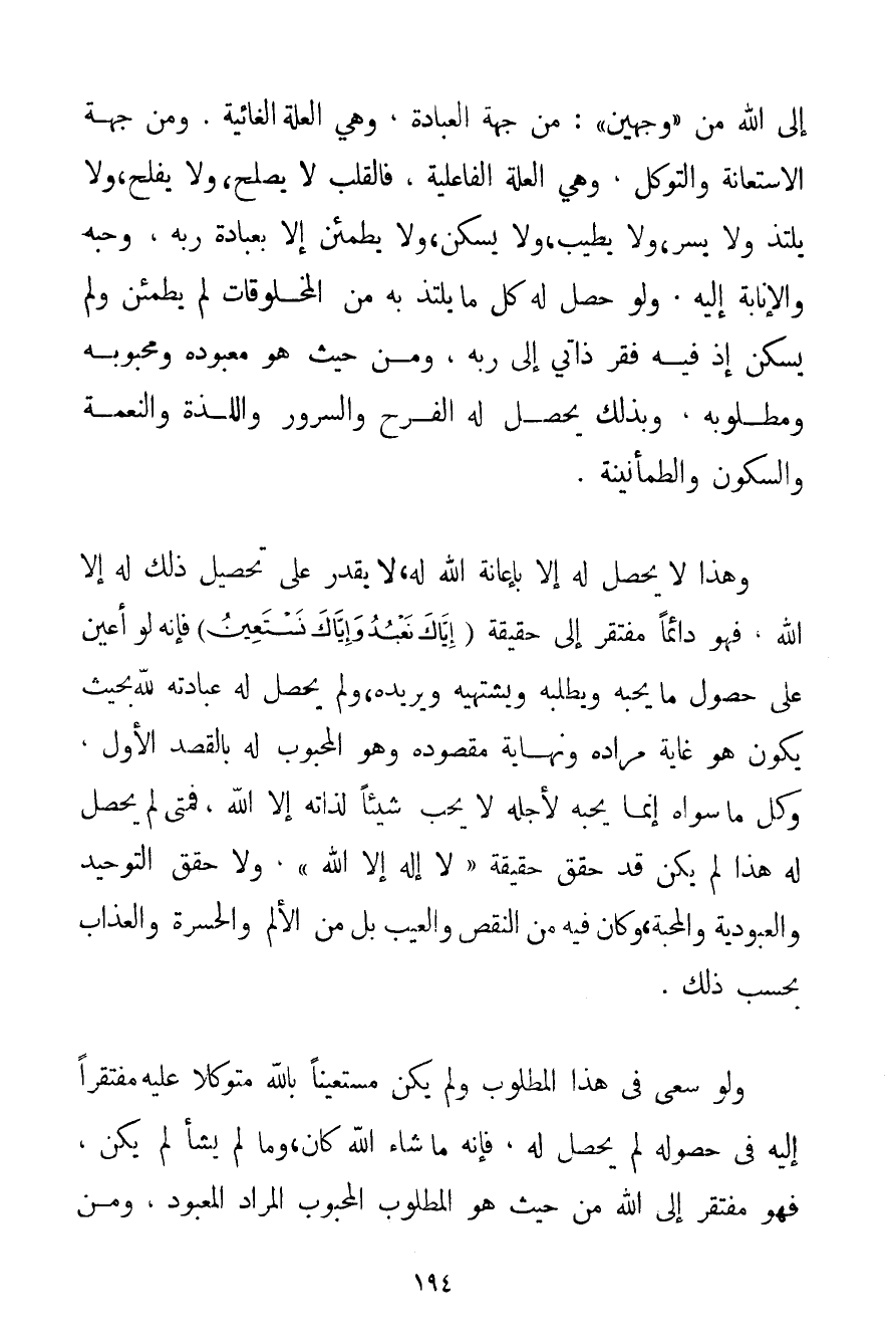 إلَى اللَّهِ مِنْ " وَجْهَيْنِ ": مِنْ جِهَةِ الْعِبَادَةِ وَهِيَ الْعِلَّةُ الغائية. وَمِنْ جِهَةِ الِاسْتِعَانَةِ وَالتَّوَكُّلِ وَهِيَ الْعِلَّةُ الْفَاعِلِيَّةُ فَالْقَلْبُ لَا يَصْلُحُ وَلَا يُفْلِحُ وَلَا يَلْتَذُّ وَلَا يُسَرُّ وَلَا يَطِيبُ وَلَا يَسْكُنُ وَلَا يَطْمَئِنُّ إلَّا بِعِبَادَةِ رَبِّهِ وَحُبِّهِ وَالْإِنَابَةِ إلَيْهِ. وَلَوْ حَصَلَ لَهُ كُلُّ مَا يَلْتَذُّ بِهِ مِنْ الْمَخْلُوقَاتِ لَمْ يَطْمَئِنَّ وَلَمْ يَسْكُنْ إذْ فِيهِ فَقْرٌ ذَاتِيٌّ إلَى رَبِّهِ وَمِنْ حَيْثُ هُوَ مَعْبُودُهُ وَمَحْبُوبُهُ وَمَطْلُوبُهُ وَبِذَلِكَ يَحْصُلُ لَهُ الْفَرَحُ وَالسُّرُورُ وَاللَّذَّةُ وَالنِّعْمَةُ وَالسُّكُونُ وَالطُّمَأْنِينَةُ. وَهَذَا لَا يَحْصُلُ لَهُ إلَّا بِإِعَانَةِ اللَّهِ لَهُ لَا يَقْدِرُ عَلَى تَحْصِيلِ ذَلِكَ لَهُ إلَّا اللَّهُ فَهُوَ دَائِمًا مُفْتَقِرٌ إلَى حَقِيقَةِ {إيَّاكَ نَعْبُدُ وَإِيَّاكَ نَسْتَعِينُ} فَإِنَّهُ لَوْ أُعِينَ عَلَى حُصُولِ مَا يُحِبُّهُ وَيَطْلُبُهُ وَيَشْتَهِيهِ وَيُرِيدُهُ وَلَمْ يَحْصُلْ لَهُ عِبَادَتُهُ لِلَّهِ بِحَيْثُ يَكُونُ هُوَ غَايَةَ مُرَادِهِ وَنِهَايَةَ مَقْصُودِهِ وَهُوَ الْمَحْبُوبُ لَهُ بِالْقَصْدِ الْأَوَّلِ وَكُلُّ مَا سِوَاهُ إنَّمَا يُحِبُّهُ لِأَجْلِهِ لَا يُحِبُّ شَيْئًا لِذَاتِهِ إلَّا اللَّهَ فَمَتَى لَمْ يَحْصُلْ لَهُ هَذَا لَمْ يَكُنْ قَدْ حَقَّقَ حَقِيقَةَ " لَا إلَهَ إلَّا اللَّهُ " وَلَا حَقَّقَ التَّوْحِيدَ وَالْعُبُودِيَّةَ وَالْمَحَبَّةَ وَكَانَ فِيهِ مِنْ النَّقْصِ وَالْعَيْبِ بَلْ مِنْ الْأَلَمِ وَالْحَسْرَةِ وَالْعَذَابِ بِحَسَبِ ذَلِكَ. وَلَوْ سَعَى فِي هَذَا الْمَطْلُوبِ وَلَمْ يَكُنْ مُسْتَعِينًا بِاَللَّهِ مُتَوَكِّلًا عَلَيْهِ مُفْتَقِرًا إلَيْهِ فِي حُصُولِهِ لَمْ يَحْصُلْ لَهُ فَإِنَّهُ مَا شَاءَ اللَّهُ كَانَ وَمَا لَمْ يَشَأْ لَمْ يَكُنْ فَهُوَ مُفْتَقِرٌ إلَى اللَّهِ مِنْ حَيْثُ هُوَ الْمَطْلُوبُ الْمَحْبُوبُ الْمُرَادُ الْمَعْبُودُ وَمِنْ