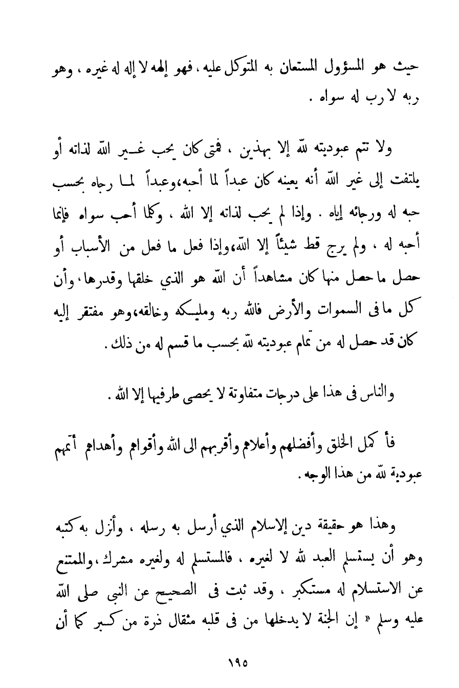 حَيْثُ هُوَ الْمَسْئُولُ الْمُسْتَعَانُ بِهِ الْمُتَوَكَّلُ عَلَيْهِ فَهُوَ إلَهُهُ لَا إلَهَ لَهُ غَيْرُهُ وَهُوَ رَبُّهُ لَا رَبَّ لَهُ سِوَاهُ. وَلَا تَتِمُّ عُبُودِيَّتُهُ لِلَّهِ إلَّا بِهَذَيْنِ فَمَتَى كَانَ يُحِبُّ غَيْرَ اللَّهِ لِذَاتِهِ أَوْ يَلْتَفِتُ إلَى غَيْرِ اللَّهِ أَنَّهُ يُعِينُهُ كَانَ عَبْدًا لِمَا أَحَبَّهُ وَعَبْدًا لِمَا رَجَاهُ بِحَسَبِ حُبِّهِ لَهُ وَرَجَائِهِ إيَّاهُ. وَإِذَا لَمْ يُحِبَّ لِذَاتِهِ إلَّا اللَّهَ وَكُلَّمَا أَحَبَّ سِوَاهُ فَإِنَّمَا أَحَبَّهُ لَهُ وَلَمْ يَرْجُ قَطُّ شَيْئًا إلَّا اللَّهَ وَإِذَا فَعَلَ مَا فَعَلَ مِنْ الْأَسْبَابِ أَوْ حَصَّلَ مَا حَصَّلَ مِنْهَا كَانَ مُشَاهِدًا أَنَّ اللَّهَ هُوَ الَّذِي خَلَقَهَا وَقَدَّرَهَا. وَأَنَّ كُلَّ مَا فِي السَّمَوَاتِ وَالْأَرْضِ فَاَللَّهُ رَبُّهُ وَمَلِيكُهُ وَخَالِقُهُ وَهُوَ مُفْتَقِرٌ إلَيْهِ كَانَ قَدْ حَصَلَ لَهُ مِنْ تَمَامِ عُبُودِيَّتِهِ لِلَّهِ بِحَسَبِ مَا قُسِمَ لَهُ مِنْ ذَلِكَ. وَالنَّاسُ فِي هَذَا عَلَى دَرَجَاتٍ مُتَفَاوِتَةٍ لَا يُحْصِي طَرَفَيْهَا إلَّا اللَّهُ. فَأَكْمَلُ الْخَلْقِ وَأَفْضَلُهُمْ وَأَعْلَاهُمْ وَأَقْرَبُهُمْ إلَى اللَّهِ وَأَقْوَاهُمْ وَأَهْدَاهُمْ أَتَمُّهُمْ عُبُودِيَّةً لِلَّهِ مِنْ هَذَا الْوَجْهِ. وَهَذَا هُوَ حَقِيقَةُ دِينِ الْإِسْلَامِ الَّذِي أَرْسَلَ بِهِ رُسُلَهُ وَأَنْزَلَ بِهِ كُتُبَهُ وَهُوَ أَنْ يَسْتَسْلِمَ الْعَبْدُ لِلَّهِ لَا لِغَيْرِهِ فَالْمُسْتَسْلِمُ لَهُ وَلِغَيْرِهِ مُشْرِكٌ وَالْمُمْتَنِعُ عَنْ الِاسْتِسْلَامِ لَهُ مُسْتَكْبِرٌ وَقَدْ ثَبَتَ فِي الصَّحِيحِ عَنْ النَّبِيِّ صَلَّى اللَّهُ عَلَيْهِ وَسَلَّمَ {إنَّ الْجَنَّةَ لَا يَدْخُلُهَا مَنْ فِي قَلْبِهِ مِثْقَالُ ذَرَّةٍ مِنْ كِبْرٍ كَمَا