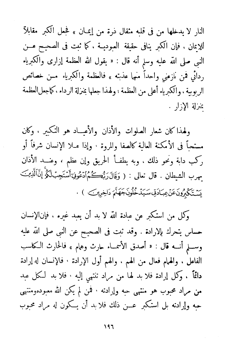 أَنَّ النَّارَ لَا يَدْخُلُهَا مَنْ فِي قَلْبِهِ مِثْقَالُ ذَرَّةٍ مِنْ إيمَانٍ} فَجَعَلَ الْكِبْرَ مُقَابِلًا لِلْإِيمَانِ فَإِنَّ الْكِبْرَ يُنَافِي حَقِيقَةَ الْعُبُودِيَّةِ كَمَا ثَبَتَ فِي الصَّحِيحِ عَنْ النَّبِيِّ صَلَّى اللَّهُ عَلَيْهِ وَسَلَّمَ أَنَّهُ قَالَ: {يَقُولُ اللَّهُ الْعَظَمَةُ إزَارِي وَالْكِبْرِيَاءُ رِدَائِي فَمَنْ نَازَعَنِي وَاحِدًا مِنْهُمَا عَذَّبْتُهُ} فَالْعَظَمَةُ وَالْكِبْرِيَاءُ مِنْ خَصَائِصِ الرُّبُوبِيَّةِ وَالْكِبْرِيَاءُ أَعْلَى مِنْ الْعَظَمَةِ؛ وَلِهَذَا جَعَلَهَا بِمَنْزِلَةِ الرِّدَاءِ كَمَا جَعَلَ الْعَظَمَةَ بِمَنْزِلَةِ الْإِزَارِ. وَلِهَذَا كَانَ شِعَارُ الصَّلَوَاتِ وَالْأَذَانِ وَالْأَعْيَادِ هُوَ التَّكْبِيرَ وَكَانَ مُسْتَحَبًّا فِي الْأَمْكِنَةِ الْعَالِيَةِ كَالصَّفَا والمروة وَإِذَا عَلَا الْإِنْسَانُ شَرَفًا أَوْ رَكِبَ دَابَّةً وَنَحْوَ ذَلِكَ وَبِهِ يُطْفَأُ الْحَرِيقُ وَإِنْ عَظُمَ وَعِنْدَ الْأَذَانِ يَهْرُبُ الشَّيْطَانُ. قَالَ تَعَالَى: {وَقَالَ رَبُّكُمُ ادْعُونِي أَسْتَجِبْ لَكُمْ إنَّ الَّذِينَ يَسْتَكْبِرُونَ عَنْ عِبَادَتِي سَيَدْخُلُونَ جَهَنَّمَ دَاخِرِينَ} .