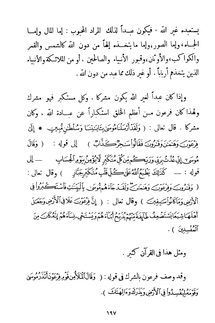 يَسْتَعْبِدُهُ غَيْرُ اللَّهِ فَيَكُونُ عَبْدًا لِذَلِكَ الْمُرَادِ الْمَحْبُوبِ: إمَّا الْمَالُ وَإِمَّا الْجَاهُ وَإِمَّا الصُّوَرُ وَإِمَّا مَا يَتَّخِذُهُ إلَهًا مِنْ دُونِ اللَّهِ كَالشَّمْسِ وَالْقَمَرِ وَالْكَوَاكِبِ وَالْأَوْثَانِ وَقُبُورِ الْأَنْبِيَاءِ وَالصَّالِحِينَ أَوْ مِنْ الْمَلَائِكَةِ وَالْأَنْبِيَاءِ الَّذِينَ يَتَّخِذُهُمْ أَرْبَابًا أَوْ غَيْرِ ذَلِكَ مِمَّا عُبِدَ مِنْ دُونِ اللَّهِ. وَإِذَا كَانَ عَبْدًا لِغَيْرِ اللَّهِ يَكُونُ مُشْرِكًا وَكُلُّ مُسْتَكْبِرٍ فَهُوَ مُشْرِكٌ وَلِهَذَا كَانَ فِرْعَوْنُ مِنْ أَعْظَمِ الْخَلْقِ اسْتِكْبَارًا عَنْ عِبَادَةِ اللَّهِ وَكَانَ مُشْرِكًا. قَالَ تَعَالَى: {وَلَقَدْ أَرْسَلْنَا مُوسَى بِآيَاتِنَا وَسُلْطَانٍ مُبِينٍ} {إلَى فِرْعَوْنَ وَهَامَانَ وَقَارُونَ فَقَالُوا سَاحِرٌ كَذَّابٌ} إلَى قَوْلِهِ: {وَقَالَ مُوسَى إنِّي عُذْتُ بِرَبِّي وَرَبِّكُمْ مِنْ كُلِّ مُتَكَبِّرٍ لَا يُؤْمِنُ بِيَوْمِ الْحِسَابِ} - إلَى قَوْلِهِ: - {كَذَلِكَ يَطْبَعُ اللَّهُ عَلَى كُلِّ قَلْبِ مُتَكَبِّرٍ جَبَّارٍ} وَقَالَ تَعَالَى: {وَقَارُونَ وَفِرْعَوْنَ وَهَامَانَ وَلَقَدْ جَاءَهُمْ مُوسَى بِالْبَيِّنَاتِ فَاسْتَكْبَرُوا فِي الْأَرْضِ وَمَا كَانُوا سَابِقِينَ} وَقَالَ تَعَالَى: {إنَّ فِرْعَوْنَ عَلَا فِي الْأَرْضِ وَجَعَلَ أَهْلَهَا شِيَعًا يَسْتَضْعِفُ طَائِفَةً مِنْهُمْ يُذَبِّحُ أَبْنَاءَهُمْ وَيَسْتَحْيِي نِسَاءَهُمْ إنَّهُ كَانَ مِنَ الْمُفْسِدِينَ} وَمِثْلُ هَذَا فِي الْقُرْآنِ كَثِيرٌ. وَقَدْ وُصِفَ فِرْعَوْنُ بِالشِّرْكِ فِي قَوْلِهِ: {وَقَالَ الْمَلَأُ مِنْ قَوْمِ فِرْعَوْنَ أَتَذَرُ مُوسَى وَقَوْمَهُ لِيُفْسِدُوا فِي الْأَرْضِ وَيَذَرَكَ وَآلِهَتَكَ} .