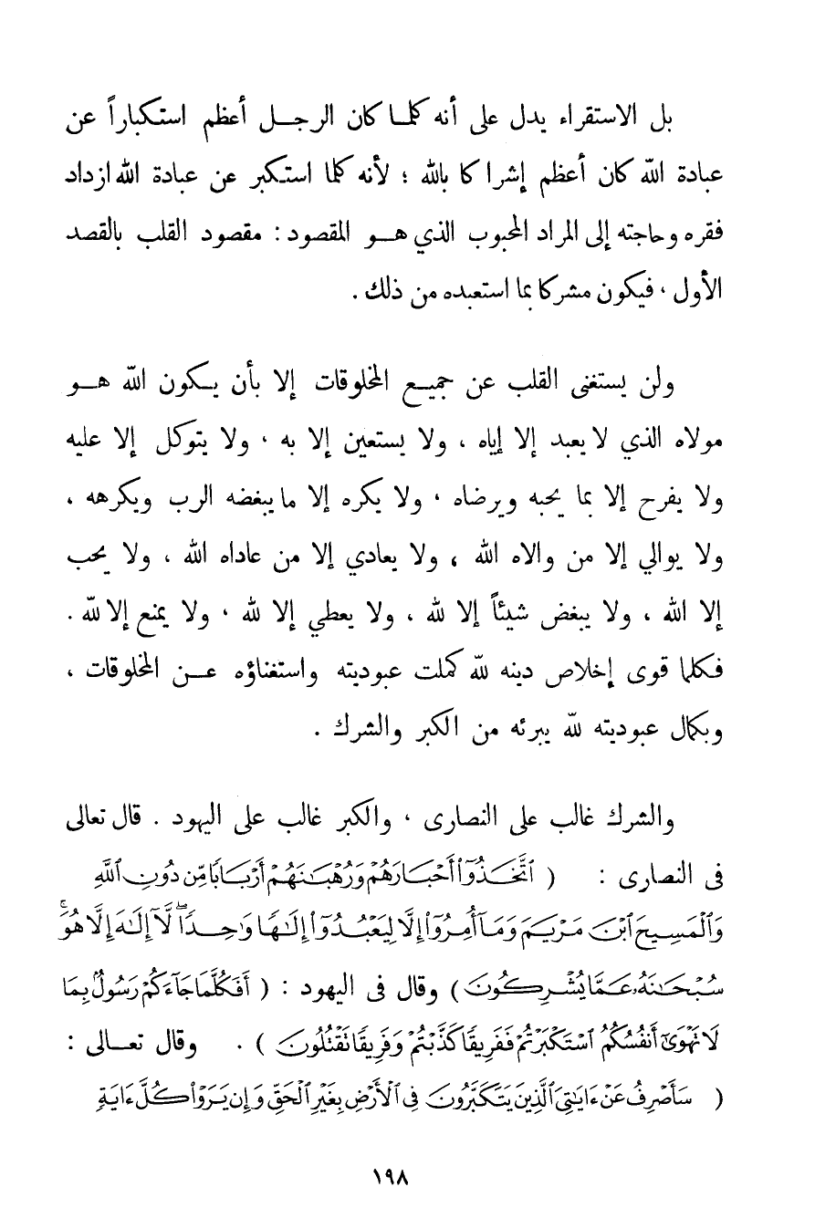 بَلْ الِاسْتِقْرَاءُ يَدُلُّ عَلَى أَنَّهُ كُلَّمَا كَانَ الرَّجُلُ أَعْظَمَ اسْتِكْبَارًا عَنْ عِبَادَةِ اللَّهِ كَانَ أَعْظَمَ إشْرَاكًا بِاَللَّهِ؛ لِأَنَّهُ كُلَّمَا اسْتَكْبَرَ عَنْ عِبَادَةِ اللَّهِ ازْدَادَ فَقْرُهُ وَحَاجَتُهُ إلَى الْمُرَادِ الْمَحْبُوبِ الَّذِي هُوَ الْمَقْصُودُ: مَقْصُودُ الْقَلْبِ بِالْقَصْدِ الْأَوَّلِ فَيَكُونُ مُشْتَرِكًا بِمَا اسْتَعْبَدَهُ مِنْ ذَلِكَ. وَلَنْ يَسْتَغْنِيَ الْقَلْبُ عَنْ جَمِيعِ الْمَخْلُوقَاتِ إلَّا بِأَنْ يَكُونَ اللَّهُ هُوَ مَوْلَاهُ الَّذِي لَا يَعْبُدُ إلَّا إيَّاهُ وَلَا يَسْتَعِينُ إلَّا بِهِ وَلَا يَتَوَكَّلُ إلَّا عَلَيْهِ وَلَا يَفْرَحُ إلَّا بِمَا يُحِبُّهُ وَيَرْضَاهُ وَلَا يَكْرَهُ إلَّا مَا يُبْغِضُهُ الرَّبُّ وَيَكْرَهُهُ وَلَا يُوَالِي إلَّا مَنْ وَالَاهُ اللَّهُ وَلَا يُعَادِي إلَّا مَنْ عَادَاهُ اللَّهُ وَلَا يُحِبُّ إلَّا لِلَّهِ وَلَا يُبْغِضُ شَيْئًا إلَّا لِلَّهِ وَلَا يُعْطِي إلَّا لِلَّهِ وَلَا يَمْنَعُ إلَّا لِلَّهِ. فَكُلَّمَا قَوِيَ إخْلَاصُ دِينِهِ لِلَّهِ كَمُلَتْ عُبُودِيَّتُهُ وَاسْتِغْنَاؤُهُ عَنْ الْمَخْلُوقَاتِ وَبِكَمَالِ عُبُودِيَّتِهِ لِلَّهِ يُبَرِّئُهُ مِنْ الْكِبْرِ وَالشِّرْكِ. وَالشِّرْكُ غَالِبٌ عَلَى النَّصَارَى وَالْكِبْرُ غَالِبٌ عَلَى الْيَهُودِ. قَالَ تَعَالَى فِي النَّصَارَى: {اتَّخَذُوا أَحْبَارَهُمْ وَرُهْبَانَهُمْ أَرْبَابًا مِنْ دُونِ اللَّهِ وَالْمَسِيحَ ابْنَ مَرْيَمَ وَمَا أُمِرُوا إلَّا لِيَعْبُدُوا إلَهًا وَاحِدًا لَا إلَهَ إلَّا هُوَ سُبْحَانَهُ عَمَّا يُشْرِكُونَ} وَقَالَ فِي الْيَهُودِ: {أَفَكُلَّمَا جَاءَكُمْ رَسُولٌ بِمَا لَا تَهْوَى أَنْفُسُكُمُ اسْتَكْبَرْتُمْ فَفَرِيقًا كَذَّبْتُمْ وَفَرِيقًا تَقْتُلُونَ} . وَقَالَ تَعَالَى: {سَأَصْرِفُ عَنْ آيَاتِيَ الَّذِينَ يَتَكَبَّرُونَ فِي الْأَرْضِ بِغَيْرِ الْحَقِّ وَإِنْ يَرَوْا