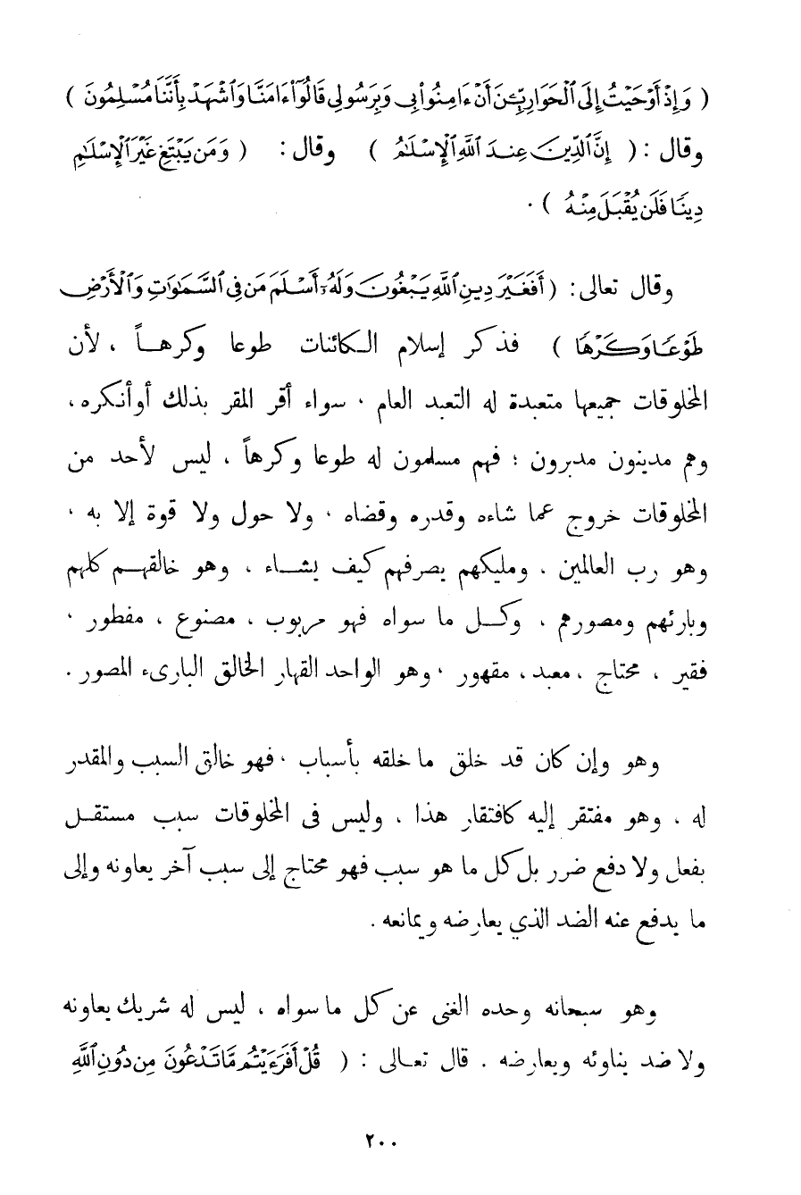 {وَإِذْ أَوْحَيْتُ إلَى الْحَوَارِيِّينَ أَنْ آمِنُوا بِي وَبِرَسُولِي قَالُوا آمَنَّا وَاشْهَدْ بِأَنَّنَا مُسْلِمُونَ} وَقَالَ: {إنَّ الدِّينَ عِنْدَ اللَّهِ الْإِسْلَامُ} وَقَالَ: {وَمَنْ يَبْتَغِ غَيْرَ الْإِسْلَامِ دِينًا فَلَنْ يُقْبَلَ مِنْهُ} . وَقَالَ تَعَالَى: {أَفَغَيْرَ دِينِ اللَّهِ يَبْغُونَ وَلَهُ أَسْلَمَ مَنْ فِي السَّمَاوَاتِ وَالْأَرْضِ طَوْعًا وَكَرْهًا} فَذَكَرَ إسْلَامَ الْكَائِنَاتِ طَوْعًا وَكَرْهًا لِأَنَّ الْمَخْلُوقَاتِ جَمِيعَهَا مُتَعَبِّدَةٌ لَهُ التَّعَبُّدَ الْعَامَّ سَوَاءٌ أَقَرَّ الْمُقِرُّ بِذَلِكَ أَوْ أَنْكَرَهُ وَهُمْ مَدِينُونَ مدبرون؛ فَهُمْ مُسْلِمُونَ لَهُ طَوْعًا وَكَرْهًا لَيْسَ لِأَحَدِ مِنْ الْمَخْلُوقَاتِ خُرُوجٌ عَمَّا شَاءَهُ وَقَدَّرَهُ وَقَضَاهُ وَلَا حَوْلَ وَلَا قُوَّةَ إلَّا بِهِ وَهُوَ رَبُّ الْعَالَمِينَ وَمَلِيكُهُمْ يصرفهم كَيْفَ يَشَاءُ وَهُوَ خَالِقُهُمْ كُلُّهُمْ وَبَارِئُهُمْ وَمُصَوِّرُهُمْ وَكُلُّ مَا سِوَاهُ فَهُوَ مَرْبُوبٌ مَصْنُوعٌ مَفْطُورٌ فَقِيرٌ مُحْتَاجٌ مُعَبَّدٌ مَقْهُورٌ وَهُوَ الْوَاحِدُ الْقَهَّارُ الْخَالِقُ الْبَارِئُ الْمُصَوِّرُ. وَهُوَ وَإِنْ كَانَ قَدْ خَلَقَ مَا خَلَقَهُ بِأَسْبَابِ فَهُوَ خَالِقُ السَّبَبِ وَالْمُقَدِّرُ لَهُ وَهُوَ مُفْتَقِرٌ إلَيْهِ كَافْتِقَارِ هَذَا وَلَيْسَ فِي الْمَخْلُوقَاتِ سَبَبٌ مُسْتَقِلٌّ بِفِعْلِ وَلَا دَفْعِ ضَرَرٍ بَلْ كُلُّ مَا هُوَ سَبَبٌ فَهُوَ مُحْتَاجٌ إلَى سَبَبٍ آخَرَ يُعَاوِنُهُ وَإِلَى مَا يَدْفَعُ عَنْهُ الضِّدَّ الَّذِي يُعَارِضُهُ وَيُمَانِعُهُ. وَهُوَ سُبْحَانَهُ وَحْدَهُ الْغَنِيُّ عَنْ كُلِّ مَا سِوَاهُ لَيْسَ لَهُ شَرِيكٌ يُعَاوِنُهُ وَلَا ضِدٌّ يُنَاوِئُهُ وَيُعَارِضُهُ. قَالَ تَعَالَى: {قُلْ أَفَرَأَيْتُمْ مَا تَدْعُونَ مِنْ دُونِ