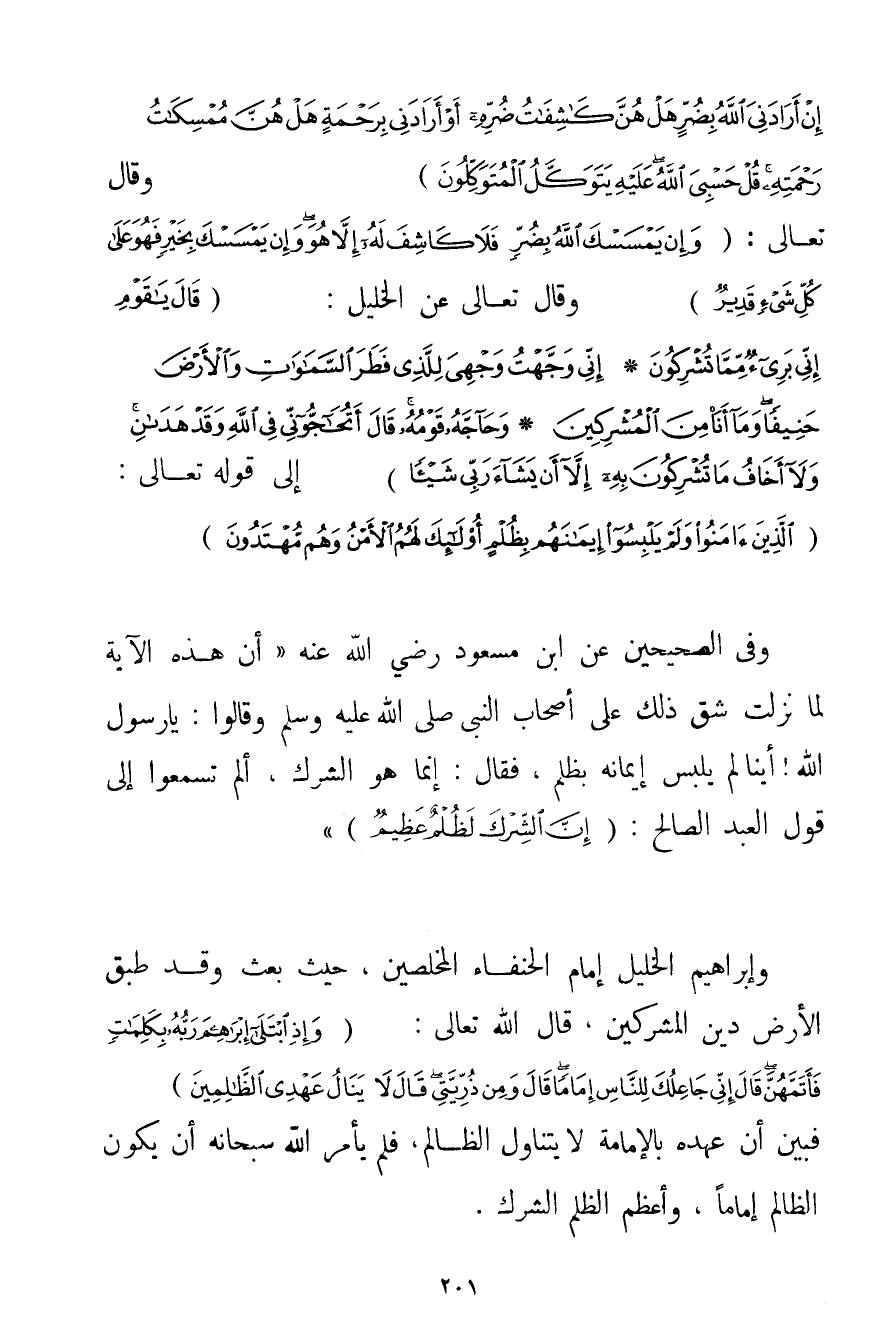 اللَّهِ إنْ أَرَادَنِيَ اللَّهُ بِضُرٍّ هَلْ هُنَّ كَاشِفَاتُ ضُرِّهِ أَوْ أَرَادَنِي بِرَحْمَةٍ هَلْ هُنَّ مُمْسِكَاتُ رَحْمَتِهِ قُلْ حَسْبِيَ اللَّهُ عَلَيْهِ يَتَوَكَّلُ الْمُتَوَكِّلُونَ} وَقَالَ تَعَالَى: {وَإِنْ يَمْسَسْكَ اللَّهُ بِضُرٍّ فَلَا كَاشِفَ لَهُ إلَّا هُوَ وَإِنْ يَمْسَسْكَ بِخَيْرٍ فَهُوَ عَلَى كُلِّ شَيْءٍ قَدِيرٌ} وَقَالَ تَعَالَى عَنْ الْخَلِيلِ: {يَا قَوْمِ إنِّي بَرِيءٌ مِمَّا تُشْرِكُونَ} {إنِّي وَجَّهْتُ وَجْهِيَ لِلَّذِي فَطَرَ السَّمَاوَاتِ وَالْأَرْضَ حَنِيفًا وَمَا أَنَا مِنَ الْمُشْرِكِينَ} {وَحَاجَّهُ قَوْمُهُ قَالَ أَتُحَاجُّونِّي فِي اللَّهِ وَقَدْ هَدَانِي وَلَا أَخَافُ مَا تُشْرِكُونَ بِهِ إلَّا أَنْ يَشَاءَ رَبِّي شَيْئًا} إلَى قَوْله تَعَالَى {الَّذِينَ آمَنُوا وَلَمْ يَلْبِسُوا إيمَانَهُمْ بِظُلْمٍ أُولَئِكَ لَهُمُ الْأَمْنُ وَهُمْ مُهْتَدُونَ} وَفِي الصَّحِيحَيْنِ عَنْ ابْنِ مَسْعُودٍ رَضِيَ اللَّهُ عَنْهُ {أَنَّ هَذِهِ الْآيَةَ لَمَّا نَزَلَتْ شَقَّ ذَلِكَ عَلَى أَصْحَابِ النَّبِيِّ صَلَّى اللَّهُ عَلَيْهِ وَسَلَّمَ وَقَالُوا: يَا رَسُولَ اللَّهِ أَيُّنَا لَمْ يَلْبِسْ إيمَانَهُ بِظُلْمٍ فَقَالَ: إنَّمَا هُوَ الشِّرْكُ أَلَمْ تَسْمَعُوا إلَى قَوْلِ الْعَبْدِ الصَّالِحِ: {إنَّ الشِّرْكَ لَظُلْمٌ عَظِيمٌ} } وَإِبْرَاهِيمُ الْخَلِيلُ إمَامُ الْحُنَفَاءِ الْمُخْلِصِينَ حَيْثُ بُعِثَ وَقَدْ طَبَقَ الْأَرْضَ دِينُ الْمُشْرِكِينَ قَالَ اللَّهُ تَعَالَى: {وَإِذِ ابْتَلَى إبْرَاهِيمَ رَبُّهُ بِكَلِمَاتٍ فَأَتَمَّهُنَّ قَالَ إنِّي جَاعِلُكَ لِلنَّاسِ إمَامًا قَالَ وَمِنْ ذُرِّيَّتِي قَالَ لَا يَنَالُ عَهْدِي الظَّالِمِينَ} فَبَيَّنَ أَنَّ عَهْدَهُ بِالْإِمَامَةِ لَا يَتَنَاوَلُ الظَّالِمَ فَلَمْ يَأْمُرْ اللَّهُ سُبْحَانَهُ أَنْ يَكُونَ الظَّالِمُ إمَامًا وَأَعْظَمُ الظُّلْمِ الشِّرْكُ.