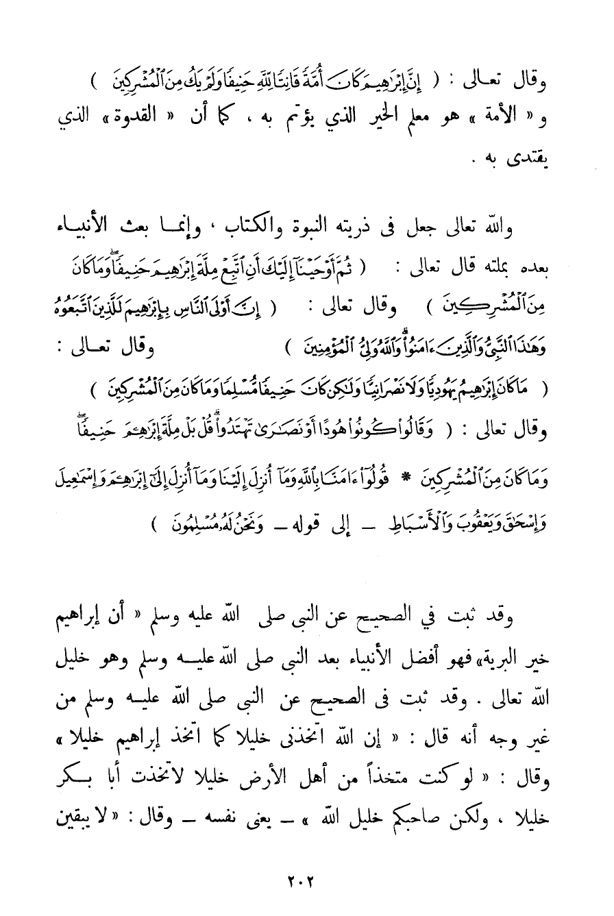 وَقَالَ تَعَالَى: {إنَّ إبْرَاهِيمَ كَانَ أُمَّةً قَانِتًا لِلَّهِ حَنِيفًا وَلَمْ يَكُ مِنَ الْمُشْرِكِينَ} و " الْأُمَّةُ " هُوَ مُعَلِّمُ الْخَيْرِ الَّذِي يُؤْتَمُّ بِهِ كَمَا أَنَّ " الْقُدْوَةَ " الَّذِي يُقْتَدَى بِهِ. وَاَللَّهُ تَعَالَى جَعَلَ فِي ذُرِّيَّتِهِ النُّبُوَّةَ وَالْكِتَابَ وَإِنَّمَا بَعَثَ الْأَنْبِيَاءَ بَعْدَهُ بِمِلَّتِهِ قَالَ تَعَالَى: {ثُمَّ أَوْحَيْنَا إلَيْكَ أَنِ اتَّبِعْ مِلَّةَ إبْرَاهِيمَ حَنِيفًا وَمَا كَانَ مِنَ الْمُشْرِكِينَ} وَقَالَ تَعَالَى: {إنَّ أَوْلَى النَّاسِ بِإِبْرَاهِيمَ لَلَّذِينَ اتَّبَعُوهُ وَهَذَا النَّبِيُّ وَالَّذِينَ آمَنُوا وَاللَّهُ وَلِيُّ الْمُؤْمِنِينَ} وَقَالَ تَعَالَى: {مَا كَانَ إبْرَاهِيمُ يَهُودِيًّا وَلَا نَصْرَانِيًّا وَلَكِنْ كَانَ حَنِيفًا مُسْلِمًا وَمَا كَانَ مِنَ الْمُشْرِكِينَ} وَقَالَ تَعَالَى: {وَقَالُوا كُونُوا هُودًا أَوْ نَصَارَى تَهْتَدُوا قُلْ بَلْ مِلَّةَ إبْرَاهِيمَ حَنِيفًا وَمَا كَانَ مِنَ الْمُشْرِكِينَ} {قُولُوا آمَنَّا بِاللَّهِ وَمَا أُنْزِلَ إلَيْنَا وَمَا أُنْزِلَ إلَى إبْرَاهِيمَ وَإِسْمَاعِيلَ وَإِسْحَاقَ وَيَعْقُوبَ وَالْأَسْبَاطِ} - إلَى قَوْلِهِ - {وَنَحْنُ لَهُ مُسْلِمُونَ} وَقَدْ ثَبَتَ فِي الصَّحِيحِ عَنْ النَّبِيِّ صَلَّى اللَّهُ عَلَيْهِ وَسَلَّمَ {إنَّ إبْرَاهِيمَ خَيْرُ الْبَرِيَّةِ} فَهُوَ أَفْضَلُ الْأَنْبِيَاءِ بَعْدَ النَّبِيِّ صَلَّى اللَّهُ عَلَيْهِ وَسَلَّمَ وَهُوَ خَلِيلُ اللَّهِ تَعَالَى. وَقَدْ ثَبَتَ فِي الصَّحِيحِ عَنْ النَّبِيِّ صَلَّى اللَّهُ عَلَيْهِ وَسَلَّمَ مِنْ غَيْرِ وَجْهٍ أَنَّهُ قَالَ: {إنَّ اللَّهَ اتَّخَذَنِي خَلِيلًا كَمَا اتَّخَذَ إبْرَاهِيمَ خَلِيلًا} وَقَالَ: {لَوْ كُنْتُ مُتَّخِذًا مِنْ أَهْلِ الْأَرْضِ خَلِيلًا لَاِتَّخَذْتُ أَبَا بَكْرٍ خَلِيلًا وَلَكِنَّ صَاحِبَكُمْ خَلِيلُ اللَّهِ} - يَعْنِي نَفْسَهُ - وَقَالَ: {لَا يَبْقَيَن