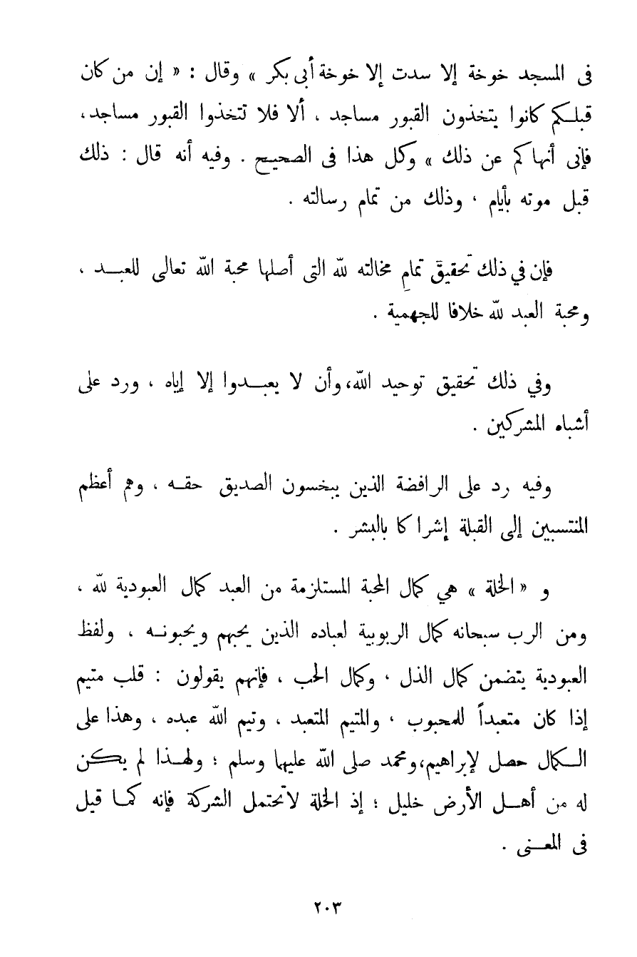 فِي الْمَسْجِدِ خَوْخَةٌ إلَّا سُدَّتْ إلَّا خَوْخَةَ أَبِي بَكْرٍ} وَقَالَ: {إنَّ مَنْ كَانَ قَبْلَكُمْ كَانُوا يَتَّخِذُونَ الْقُبُورَ مَسَاجِدَ أَلَا فَلَا تَتَّخِذُوا الْقُبُورَ مَسَاجِدَ فَإِنِّي أَنْهَاكُمْ عَنْ ذَلِكَ} وَكُلُّ هَذَا فِي الصَّحِيحِ. وَفِيهِ أَنَّهُ قَالَ: ذَلِكَ قَبْلَ مَوْتِهِ بِأَيَّامِ وَذَلِكَ مِنْ تَمَامِ رِسَالَتِهِ. فَإِنَّ فِي ذَلِكَ تَحْقِيقُ تَمَامِ مُخَالَّتِهِ لِلَّهِ الَّتِي أَصْلُهَا مَحَبَّةُ اللَّهِ تَعَالَى لِلْعَبْدِ وَمَحَبَّةُ الْعَبْدِ لِلَّهِ خِلَافًا للجهمية. وَفِي ذَلِكَ تَحْقِيقُ تَوْحِيدِ اللَّهِ وَأَنْ لَا يَعْبُدُوا إلَّا إيَّاهُ وَرَدٌّ عَلَى أَشْبَاهِ الْمُشْرِكِينَ. وَفِيهِ رَدٌّ عَلَى الرَّافِضَةِ الَّذِينَ يَبْخَسُونَ الصِّدِّيقَ حَقَّهُ وَهُمْ أَعْظَمُ الْمُنْتَسِبِينَ إلَى الْقِبْلَةِ إشْرَاكًا بِالْبَشَرِ.