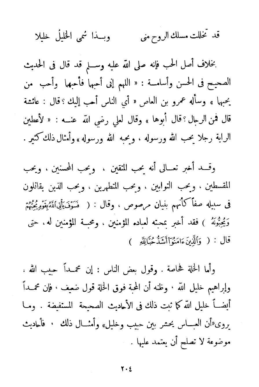 قَدْ تَخَلَّلْتَ مَسْلَكَ الرُّوحِ مِنِّي وَبِذَا سُمِّي الْخَلِيلُ خَلِيلًا بِخِلَافِ أَصْلِ الْحُبِّ فَإِنَّهُ صَلَّى اللَّهُ عَلَيْهِ وَسَلَّمَ قَدْ قَالَ فِي الْحَدِيثِ الصَّحِيحِ فِي الْحَسَنِ وَأُسَامَةَ: {اللَّهُمَّ إنِّي أُحِبُّهُمَا فَأَحِبَّهُمَا وَأَحِبَّ مَنْ يُحِبُّهُمَا} {وَسَأَلَهُ عَمْرُو بْنُ العاص أَيُّ النَّاسِ أَحَبُّ إلَيْكَ؟ قَالَ: عَائِشَةُ قَالَ فَمِنْ الرِّجَالِ؟ قَالَ أَبُوهَا} {وَقَالَ لِعَلِيِّ رَضِيَ اللَّهُ عَنْهُ لَأُعْطِيَنَّ الرَّايَةَ رَجُلًا يُحِبُّ اللَّهَ وَرَسُولَهُ وَيُحِبُّهُ اللَّهُ وَرَسُولُهُ} وَأَمْثَالُ ذَلِكَ كَثِيرٌ. وَقَدْ أَخْبَرَ تَعَالَى أَنَّهُ يُحِبُّ الْمُتَّقِينَ وَيُحِبُّ الْمُحْسِنِينَ وَيُحِبُّ الْمُقْسِطِينَ وَيُحِبُّ التَّوَّابِينَ وَيُحِبُّ الْمُتَطَهِّرِينَ وَيُحِبُّ الَّذِينَ يُقَاتِلُونَ فِي سَبِيلِهِ صَفًّا كَأَنَّهُمْ بُنْيَانٌ مَرْصُوصٌ وَقَالَ: {فَسَوْفَ يَأْتِي اللَّهُ بِقَوْمٍ يُحِبُّهُمْ وَيُحِبُّونَهُ} فَقَدْ أَخْبَرَ بِمَحَبَّتِهِ لِعِبَادِهِ الْمُؤْمِنِينَ وَمَحَبَّةِ الْمُؤْمِنِينَ لَهُ حَتَّى قَالَ: {وَالَّذِينَ آمَنُوا أَشَدُّ حُبًّا لِلَّهِ} وَأَمَّا الْخُلَّةُ فَخَاصَّةٌ. وَقَوْلُ بَعْضِ النَّاسِ: إنَّ مُحَمَّدًا حَبِيبُ اللَّهِ؛ وَإِبْرَاهِيمَ خَلِيلُ اللَّهِ وَظَنُّهُ أَنَّ الْمَحَبَّةَ فَوْقَ الْخُلَّةِ قَوْلٌ ضَعِيفٌ فَإِنَّ مُحَمَّدًا أَيْضًا خَلِيلُ اللَّهِ كَمَا ثَبَتَ ذَلِكَ فِي الْأَحَادِيثِ الصَّحِيحَةِ الْمُسْتَفِيضَةِ. وَمَا يُرْوَى {أَنَّ الْعَبَّاسَ يُحْشَرُ بَيْنَ حَبِيبٍ وَخَلِيلٍ} وَأَمْثَالُ ذَلِكَ فَأَحَادِيثُ مَوْضُوعَةٌ لَا تَصْلُحُ أَنْ يُعْتَمَدَ عَلَيْهَا.