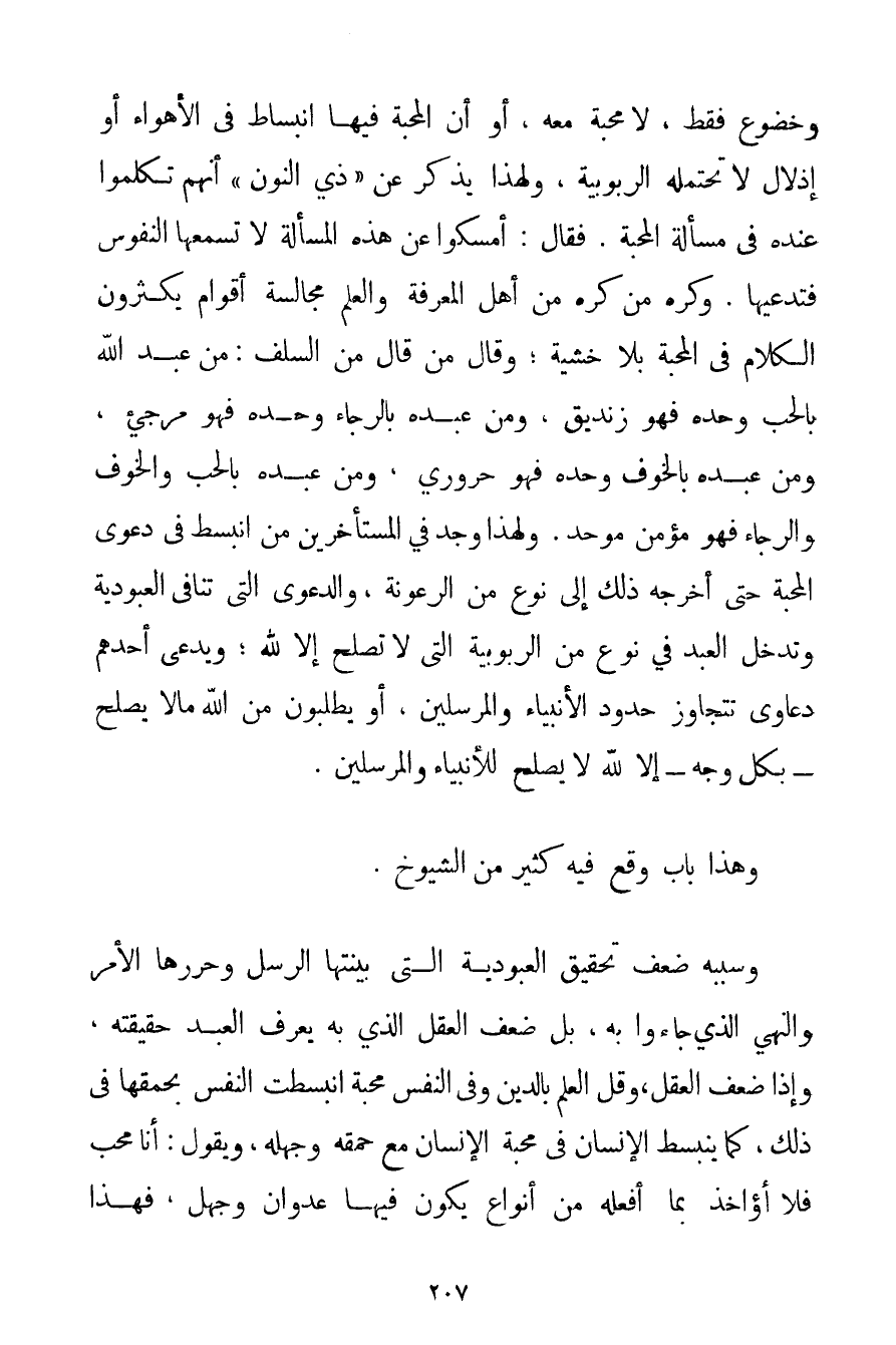 وَخُضُوعٍ فَقَطْ لَا مَحَبَّةَ مَعَهُ أَوْ أَنَّ الْمَحَبَّةَ فِيهَا انْبِسَاطٌ فِي الْأَهْوَاءِ أَوْ إذْلَالٌ لَا تَحْتَمِلُهُ الرُّبُوبِيَّةُ وَلِهَذَا يُذْكَرُ عَنْ " ذِي النُّونِ " أَنَّهُمْ تَكَلَّمُوا عِنْدَهُ فِي مَسْأَلَةِ الْمَحَبَّةِ. فَقَالَ: أَمْسِكُوا عَنْ هَذِهِ الْمَسْأَلَةِ لَا تَسْمَعْهَا النُّفُوسُ فَتَدَّعِيَهَا. وَكَرِهَ مَنْ كَرِهَ مِنْ أَهْلِ الْمَعْرِفَةِ وَالْعِلْمِ مُجَالَسَةَ أَقْوَامٍ يُكْثِرُونَ الْكَلَامَ فِي الْمَحَبَّةِ بِلَا خَشْيَةٍ؛ وَقَالَ مَنْ قَالَ مِنْ السَّلَفِ: مَنْ عَبَدَ اللَّهَ بِالْحُبِّ وَحْدَهُ فَهُوَ زِنْدِيقٌ وَمَنْ عَبَدَهُ بِالرَّجَاءِ وَحْدَهُ فَهُوَ مُرْجِئٌ وَمَنْ عَبَدَهُ بِالْخَوْفِ وَحْدَهُ فَهُوَ حروري وَمَنْ عَبَدَهُ بِالْحُبِّ وَالْخَوْفِ وَالرَّجَاءِ فَهُوَ مُؤْمِنٌ مُوَحِّدٌ. وَلِهَذَا وُجِدَ فِي الْمُسْتَأْخِرِينَ مَنْ انْبَسَطَ فِي دَعْوَى الْمَحَبَّةِ حَتَّى أَخْرَجَهُ ذَلِكَ إلَى نَوْعٍ مِنْ الرُّعُونَةِ وَالدَّعْوَى الَّتِي تُنَافِي الْعُبُودِيَّةَ وَتُدْخِلُ الْعَبْدَ فِي نَوْعٍ مِنْ الرُّبُوبِيَّةِ الَّتِي لَا تَصْلُحُ إلَّا لِلَّهِ. وَيَدَّعِي أَحَدُهُمْ دَعَاوَى تَتَجَاوَزُ حُدُودَ الْأَنْبِيَاءِ وَالْمُرْسَلِينَ أَوْ يَطْلُبُونَ مِنْ اللَّهِ مَا لَا يَصْلُحُ - بِكُلِّ وَجْهٍ - إلَّا لِلَّهِ لَا يَصْلُحُ لِلْأَنْبِيَاءِ وَالْمُرْسَلِينَ. وَهَذَا بَابٌ وَقَعَ فِيهِ كَثِيرٌ مِنْ الشُّيُوخِ. وَسَبَبُهُ ضَعْفُ تَحْقِيقِ الْعُبُودِيَّةِ الَّتِي بَيَّنَتْهَا الرُّسُلُ وَحَرَّرَهَا الْأَمْرُ وَالنَّهْيُ الَّذِي جَاءُوا بِهِ بَلْ ضَعْفُ الْعَقْلِ الَّذِي بِهِ يَعْرِفُ الْعَبْدُ حَقِيقَتَهُ وَإِذَا ضَعُفَ الْعَقْلُ وَقَلَّ الْعِلْمُ بِالدِّينِ وَفِي النَّفْسِ مَحَبَّةٌ انْبَسَطَتْ النَّفْسُ بِحُمْقِهَا فِي ذَلِكَ كَمَا يَنْبَسِطُ الْإِنْسَانُ فِي مَحَبَّةِ الْإِنْسَانِ مَعَ حُمْقِهِ وَجَهْلِهِ وَيَقُولُ: أَنَا مُحِبٌّ فَلَا أُؤَاخَذُ بِمَا أَفْعَلُهُ مِنْ أَنْوَاعٍ يَكُونُ فِيهَا عُدْوَانٌ وَجَهْلٌ فَهَذَا