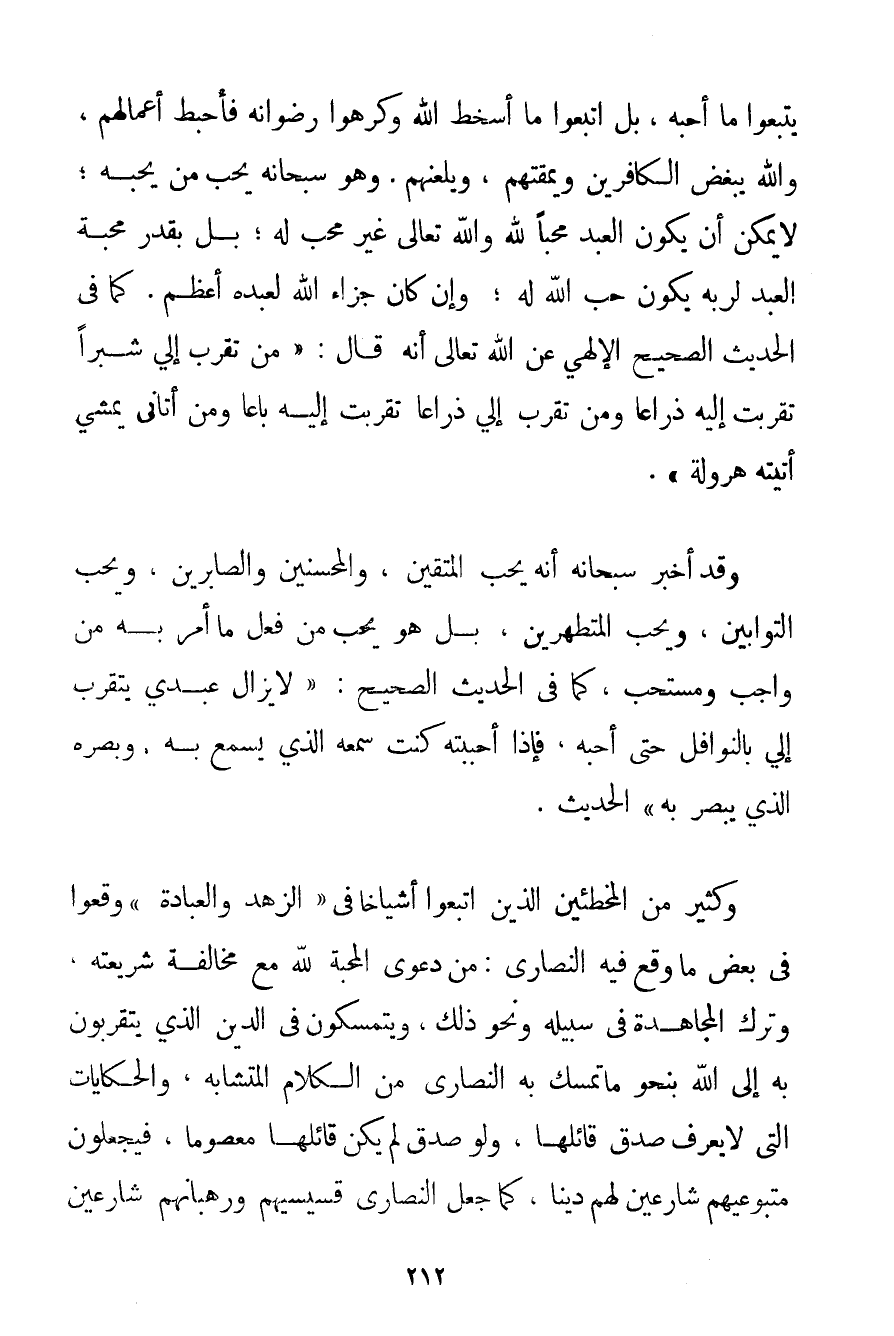 يَتَّبِعُوا مَا أَحَبَّهُ بَلْ اتَّبَعُوا مَا أَسْخَطَ اللَّهَ وَكَرِهُوا رِضْوَانَهُ فَأَحْبَطَ أَعْمَالَهُمْ وَاَللَّهُ يُبْغِضُ الْكَافِرِينَ وَيَمْقُتُهُمْ وَيَلْعَنُهُمْ. وَهُوَ سُبْحَانَهُ يُحِبُّ مَنْ يُحِبُّهُ؛ لَا يُمْكِنُ أَنْ يَكُونَ الْعَبْدُ مُحِبًّا لِلَّهِ وَاَللَّهُ تَعَالَى غَيْرُ مُحِبٍّ لَهُ؛ بَلْ بِقَدْرِ مَحَبَّةِ الْعَبْدِ لِرَبِّهِ يَكُونُ حُبُّ اللَّهِ لَهُ؛ وَإِنْ كَانَ جَزَاءُ اللَّهِ لِعَبْدِهِ أَعْظَمَ. كَمَا فِي الْحَدِيثِ الصَّحِيحِ الْإِلَهِيِّ عَنْ اللَّهِ تَعَالَى أَنَّهُ قَالَ: {مَنْ تَقَرَّبَ إلَيَّ شِبْرًا تَقَرَّبْتُ إلَيْهِ ذِرَاعًا وَمَنْ تَقَرَّبَ إلَيَّ ذِرَاعًا تَقَرَّبْتُ إلَيْهِ بَاعًا وَمَنْ أَتَانِي يَمْشِي أَتَيْتُهُ هَرْوَلَةً} . وَقَدْ أَخْبَرَ سُبْحَانَهُ أَنَّهُ يُحِبُّ الْمُتَّقِينَ وَالْمُحْسِنِينَ وَالصَّابِرِينَ وَيُحِبُّ التَّوَّابِينَ وَيُحِبُّ الْمُتَطَهِّرِينَ بَلْ هُوَ يُحِبُّ مَنْ فَعَلَ مَا أَمَرَ بِهِ مِنْ وَاجِبٍ وَمُسْتَحَبٍّ كَمَا فِي الْحَدِيثِ الصَّحِيحِ: {لَا يَزَالُ عَبْدِي يَتَقَرَّبُ إلَيَّ بِالنَّوَافِلِ حَتَّى أُحِبَّهُ فَإِذَا أَحْبَبْتُهُ كُنْتُ سَمْعَهُ الَّذِي يَسْمَعُ بِهِ وَبَصَرَهُ الَّذِي يُبْصِرُ بِهِ} الْحَدِيثَ. وَكَثِيرٌ مِنْ الْمُخْطِئِينَ الَّذِينَ اتَّبَعُوا أَشْيَاخًا فِي " الزُّهْدِ وَالْعِبَادَةِ " وَقَعُوا فِي بَعْضِ مَا وَقَعَ فِيهِ النَّصَارَى: مِنْ دَعْوَى الْمَحَبَّةِ لِلَّهِ مَعَ مُخَالَفَةِ شَرِيعَتِهِ وَتَرْكِ الْمُجَاهَدَةِ فِي سَبِيلِهِ وَنَحْوِ ذَلِكَ وَيَتَمَسَّكُونَ فِي الدِّينِ الَّذِي يَتَقَرَّبُونَ بِهِ إلَى اللَّهِ بِنَحْوِ مَا تَمَسَّكَ بِهِ النَّصَارَى مِنْ الْكَلَامِ الْمُتَشَابِهِ وَالْحِكَايَاتِ الَّتِي لَا يُعْرَفُ صِدْقُ قَائِلِهَا وَلَوْ صَدَقَ لَمْ يَكُنْ قَائِلُهَا مَعْصُومًا فَيَجْعَلُونَ مَتْبُوعِيهِمْ شَارِعِينَ لَهُمْ دِينًا كَمَا جَعَلَ النَّصَارَى قِسِّيسِيهِمْ وَرُهْبَانَهُمْ شَارِعِينَ
