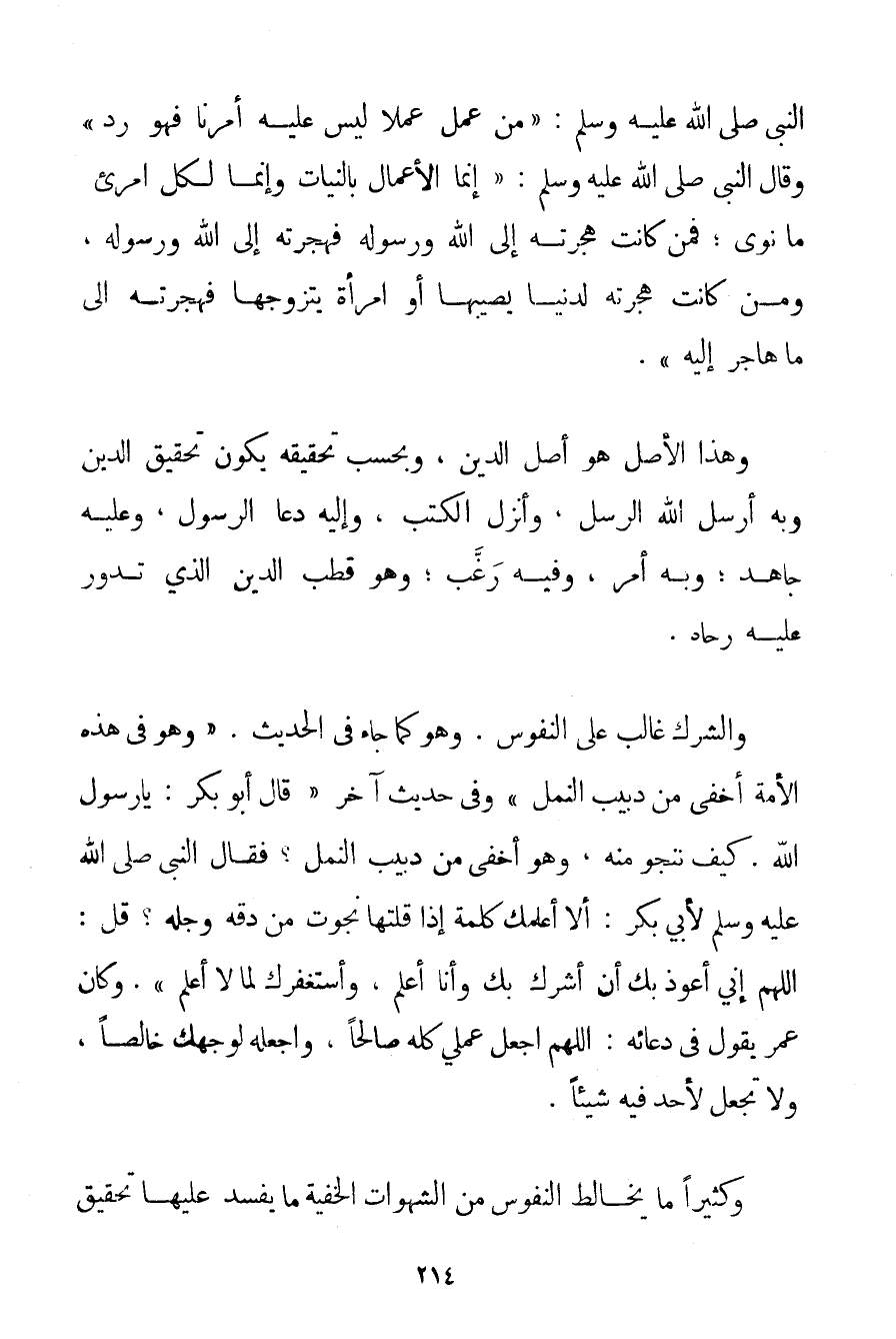 النَّبِيُّ صَلَّى اللَّهُ عَلَيْهِ وَسَلَّمَ {مَنْ عَمِلَ عَمَلًا لَيْسَ عَلَيْهِ أَمْرُنَا فَهُوَ رَدٌّ} وَقَالَ النَّبِيُّ صَلَّى اللَّهُ عَلَيْهِ وَسَلَّمَ {إنَّمَا الْأَعْمَالُ بِالنِّيَّاتِ وَإِنَّمَا لِكُلِّ امْرِئٍ مَا نَوَى؛ فَمَنْ كَانَتْ هِجْرَتُهُ إلَى اللَّهِ وَرَسُولِهِ فَهِجْرَتُهُ إلَى اللَّهِ وَرَسُولِهِ وَمَنْ كَانَتْ هِجْرَتُهُ لِدُنْيَا يُصِيبُهَا أَوْ امْرَأَةٍ يَتَزَوَّجُهَا فَهِجْرَتُهُ إلَى مَا هَاجَرَ إلَيْهِ} . وَهَذَا الْأَصْلُ هُوَ أَصْلُ الدِّينِ وَبِحَسَبِ تَحْقِيقِهِ يَكُونُ تَحْقِيقُ الدِّينِ وَبِهِ أَرْسَلَ اللَّهُ الرُّسُلَ وَأَنْزَلَ الْكُتُبَ وَإِلَيْهِ دَعَا الرَّسُولُ وَعَلَيْهِ جَاهَدَ؛ وَبِهِ أَمَرَ وَفِيهِ رَغَّبَ؛ وَهُوَ قُطْبُ الدِّينِ الَّذِي تَدُورُ عَلَيْهِ رَحَاهُ. وَالشِّرْكُ غَالِبٌ عَلَى النُّفُوسِ. وَهُوَ كَمَا جَاءَ فِي الْحَدِيثِ. {وَهُوَ فِي هَذِهِ الْأُمَّةِ أَخْفَى مِنْ دَبِيبِ النَّمْلِ} وَفِي حَدِيثٍ آخَرَ {قَالَ أَبُو بَكْرٍ: يَا رَسُولَ اللَّهِ. كَيْفَ نَنْجُو مِنْهُ وَهُوَ أَخْفَى مِنْ دَبِيبِ النَّمْلِ؟ فَقَالَ النَّبِيُّ صَلَّى اللَّهُ عَلَيْهِ وَسَلَّمَ لِأَبِي بَكْرٍ: أَلَا أُعَلِّمُكَ كَلِمَةً إذَا قُلْتَهَا نَجَوْتَ مِنْ دِقِّهِ وَجِلِّهِ؟ قُلْ: اللَّهُمَّ إنِّي أَعُوذُ بِكَ أَنْ أُشْرِكَ بِكَ وَأَنَا أَعْلَمُ وَأَسْتَغْفِرُكَ لِمَا لَا أَعْلَمُ} . وَكَانَ عُمَرُ يَقُولُ فِي دُعَائِهِ: اللَّهُمَّ اجْعَلْ عَمَلِي كُلَّهُ صَالِحًا وَاجْعَلْهُ لِوَجْهِكَ خَالِصًا وَلَا تَجْعَلْ لِأَحَدِ فِيهِ شَيْئًا. وَكَثِيرًا مَا يُخَالِطُ النُّفُوسَ مِنْ الشَّهَوَاتِ الْخَفِيَّةِ مَا يُفْسِدُ عَلَيْهَا تَحْقِيقَ