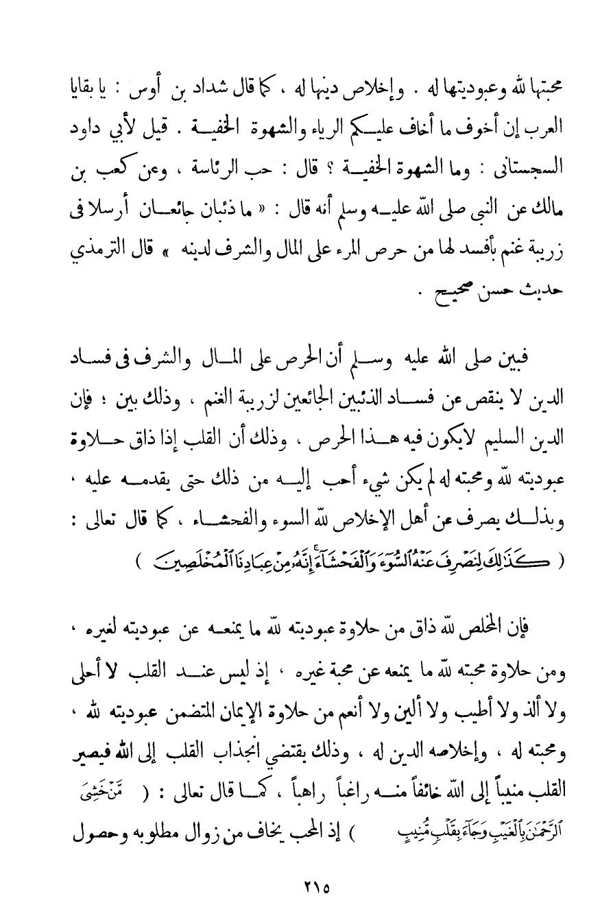 مَحَبَّتِهَا لِلَّهِ وَعُبُودِيَّتِهَا لَهُ. وَإِخْلَاصِ دِينِهَا لَهُ كَمَا قَالَ شَدَّادُ بْنُ أَوْسٍ: يَا بَقَايَا الْعَرَبِ إنَّ أَخْوَفَ مَا أَخَافُ عَلَيْكُمْ الرِّيَاءُ وَالشَّهْوَةُ الْخَفِيَّةُ. قِيلَ لِأَبِي دَاوُد السجستاني: وَمَا الشَّهْوَةُ الْخَفِيَّةُ؟ قَالَ: حُبُّ الرِّئَاسَةِ وَعَنْ كَعْبِ بْنِ مَالِكٍ عَنْ النَّبِيِّ صَلَّى اللَّهُ عَلَيْهِ وَسَلَّمَ أَنَّهُ قَالَ: {مَا ذِئْبَانِ جَائِعَانِ أُرْسِلَا فِي زَرِيبَةِ غَنَمٍ بِأَفْسَدَ لَهَا مِنْ حِرْصِ الْمَرْءِ عَلَى الْمَالِ وَالشَّرَفِ لِدِينِهِ} قَالَ التِّرْمِذِيُّ حَدِيثٌ حَسَنٌ صَحِيحٌ. فَبَيَّنَ صَلَّى اللَّهُ عَلَيْهِ وَسَلَّمَ أَنَّ الْحِرْصَ عَلَى الْمَالِ وَالشَّرَفِ فِي فَسَادِ الدِّينِ لَا يَنْقُصُ عَنْ فَسَادِ الذِّئْبَيْنِ الْجَائِعَيْنِ لِزَرِيبَةِ الْغَنَمِ وَذَلِكَ بَيِّنٌ؛ فَإِنَّ الدِّينَ السَّلِيمَ لَا يَكُونُ فِيهِ هَذَا الْحِرْصُ وَذَلِكَ أَنَّ الْقَلْبَ إذَا ذَاقَ حَلَاوَةَ عُبُودِيَّتِهِ لِلَّهِ وَمَحَبَّتِهِ لَهُ لَمْ يَكُنْ شَيْءٌ أَحَبَّ إلَيْهِ مِنْ ذَلِكَ حَتَّى يُقَدِّمَهُ عَلَيْهِ وَبِذَلِكَ يُصْرَفُ عَنْ أَهْلِ الْإِخْلَاصِ لِلَّهِ السُّوءُ وَالْفَحْشَاءُ كَمَا قَالَ تَعَالَى: {كَذَلِكَ لِنَصْرِفَ عَنْهُ السُّوءَ وَالْفَحْشَاءَ إنَّهُ مِنْ عِبَادِنَا الْمُخْلَصِينَ} فَإِنَّ الْمُخْلِصَ لِلَّهِ ذَاقَ مِنْ حَلَاوَةِ عُبُودِيَّتِهِ لِلَّهِ مَا يَمْنَعُهُ عَنْ عُبُودِيَّتِهِ لِغَيْرِهِ وَمِنْ حَلَاوَةِ مَحَبَّتِهِ لِلَّهِ مَا يَمْنَعُهُ عَنْ مَحَبَّةِ غَيْرِهِ إذْ لَيْسَ عِنْدَ الْقَلْبِ لَا أَحْلَى وَلَا أَلَذَّ وَلَا أَطْيَبَ وَلَا أَلْيَنَ وَلَا أَنْعَمَ مِنْ حَلَاوَةِ الْإِيمَانِ الْمُتَضَمِّنِ عُبُودِيَّتَهُ لِلَّهِ وَمَحَبَّتَهُ لَهُ وَإِخْلَاصَهُ الدِّينَ لَهُ وَذَلِكَ يَقْتَضِي انْجِذَابَ الْقَلْبِ إلَى اللَّهِ فَيَصِيرُ الْقَلْبُ مُنِيبًا إلَى اللَّهِ خَائِفًا مِنْهُ رَاغِبًا رَاهِبًا. كَمَا قَالَ تَعَالَى: {مَنْ خَشِيَ الرَّحْمَنَ بِالْغَيْبِ وَجَاءَ بِقَلْبٍ مُنِيبٍ} إذْ الْمُحِبُّ يَخَافُ مِنْ زَوَالِ مَطْلُوبِهِ وَحُصُولِ