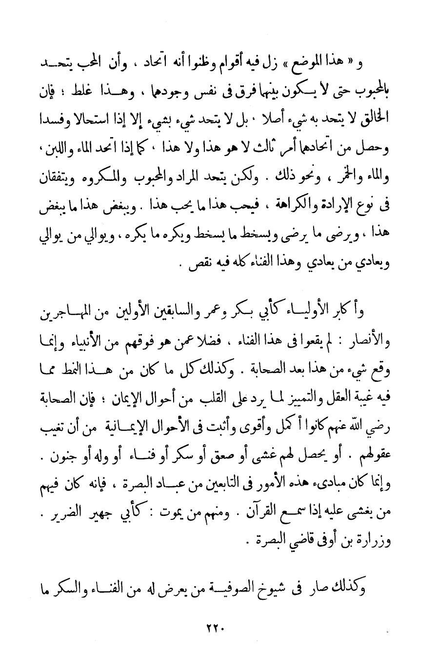 وَ " هَذَا الْمَوْضِعُ " زَلَّ فِيهِ أَقْوَامٌ وَظَنُّوا أَنَّهُ اتِّحَادٌ وَأَنَّ الْمُحِبَّ يَتَّحِدُ بِالْمَحْبُوبِ حَتَّى لَا يَكُونَ بَيْنَهُمَا فَرْقٌ فِي نَفْسِ وُجُودِهِمَا وَهَذَا غَلَطٌ؛ فَإِنَّ الْخَالِقَ لَا يَتَّحِدُ بِهِ شَيْءٌ أَصْلًا بَلْ لَا يَتَّحِدُ شَيْءٌ بِشَيْءِ إلَّا إذَا اسْتَحَالَا وَفَسَدَا وَحَصَلَ مِنْ اتِّحَادِهِمَا أَمْرٌ ثَالِثٌ لَا هُوَ هَذَا وَلَا هَذَا كَمَا إذَا اتَّحَدَ الْمَاءُ وَاللَّبَنُ وَالْمَاءُ وَالْخَمْرُ وَنَحْوُ ذَلِكَ. وَلَكِنْ يَتَّحِدُ الْمُرَادُ وَالْمَحْبُوبُ وَالْمَكْرُوهُ وَيَتَّفِقَانِ فِي نَوْعِ الْإِرَادَةِ وَالْكَرَاهَةِ فَيُحِبُّ هَذَا مَا يُحِبُّ هَذَا. وَيُبْغِضُ هَذَا مَا يُبْغِضُ هَذَا وَيَرْضَى مَا يَرْضَى وَيَسْخَطُ مَا يَسْخَطُ وَيَكْرَهُ مَا يَكْرَهُ وَيُوَالِي مَنْ يُوَالِي وَيُعَادِي مَنْ يُعَادِي وَهَذَا الْفَنَاءُ كُلُّهُ فِيهِ نَقْصٌ. وَأَكَابِرُ الْأَوْلِيَاءِ كَأَبِي بَكْرٍ وَعُمَرَ وَالسَّابِقِينَ الْأَوَّلِينَ مِنْ الْمُهَاجِرِينَ وَالْأَنْصَارِ: لَمْ يَقَعُوا فِي هَذَا الْفَنَاءِ فَضْلًا عَمَّنْ هُوَ فَوْقَهُمْ مِنْ الْأَنْبِيَاءِ وَإِنَّمَا وَقَعَ شَيْءٌ مِنْ هَذَا بَعْدَ الصَّحَابَةِ. وَكَذَلِكَ كُلُّ مَا كَانَ مِنْ هَذَا النَّمَطِ مِمَّا فِيهِ غَيْبَةُ الْعَقْلِ وَالتَّمْيِيزِ لِمَا يَرِدُ عَلَى الْقَلْبِ مِنْ أَحْوَالِ الْإِيمَان؛ فَإِنَّ الصَّحَابَةَ رَضِيَ اللَّهُ عَنْهُمْ كَانُوا أَكْمَلَ وَأَقْوَى وَأَثْبَتَ فِي الْأَحْوَالِ الْإِيمَانِيَّةِ مِنْ أَنْ تَغِيبَ عُقُولُهُمْ. أَوْ يَحْصُلَ لَهُمْ غَشْيٌ أَوْ صَعْقٌ أَوْ سُكْرٌ أَوْ فَنَاءٌ أَوْ وَلَهٌ أَوْ جُنُونٌ. وَإِنَّمَا كَانَ مَبَادِئُ هَذِهِ الْأُمُورِ فِي التَّابِعِينَ مِنْ عُبَّادِ الْبَصْرَةِ فَإِنَّهُ كَانَ فِيهِمْ مَنْ يُغْشَى عَلَيْهِ إذَا سَمِعَ الْقُرْآنَ. وَمِنْهُمْ مَنْ يَمُوتُ: كَأَبِي جهير الضَّرِيرِ. وزرارة بْنِ أَوْفَى قَاضِي الْبَصْرَةِ. وَكَذَلِكَ صَارَ فِي شُيُوخِ الصُّوفِيَّةِ مَنْ يَعْرِضُ لَهُ مِنْ الْفَنَاءِ وَالسُّكْرِ مَا
