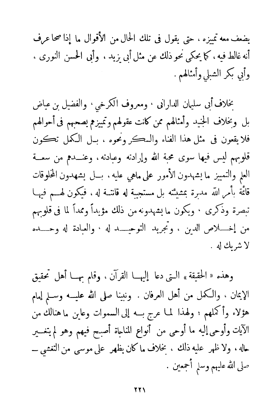 يَضْعُفُ مَعَهُ تَمْيِيزُهُ حَتَّى يَقُولَ فِي تِلْكَ الْحَالِ مِنْ الْأَقْوَالِ مَا إذَا صَحَا عَرَفَ أَنَّهُ غَالَطَ فِيهِ كَمَا يُحْكَى نَحْوُ ذَلِكَ عَنْ مِثْلِ أَبِي يَزِيدَ وَأَبِي الْحُسَينِ النُّورِيِّ وَأَبِي بَكْرٍ الشِّبْلِيِّ وَأَمْثَالِهِمْ. بِخِلَافِ أَبِي سُلَيْمَانَ الداراني وَمَعْرُوفٍ الْكَرْخِي والْفُضَيْل بْنِ عِيَاضٍ بَلْ وَبِخِلَافِ الْجُنَيْد وَأَمْثَالِهِمْ مِمَّنْ كَانَتْ عُقُولُهُمْ وَتَمْيِيزُهُمْ يَصْحَبُهُمْ فِي أَحْوَالِهِمْ فَلَا يَقَعُونَ فِي مِثْلِ هَذَا الْفَنَاءِ وَالسُّكْرِ وَنَحْوِهِ بَلْ الكمل تَكُونُ قُلُوبُهُمْ لَيْسَ فِيهَا سِوَى مَحَبَّةِ اللَّهِ وَإِرَادَتِهِ وَعِبَادَتِهِ وَعِنْدَهُمْ مِنْ سَعَةِ الْعِلْمِ وَالتَّمْيِيزِ مَا يَشْهَدُونَ الْأُمُورَ عَلَى مَا هِيَ عَلَيْهِ بَلْ يَشْهَدُونَ الْمَخْلُوقَاتِ قَائِمَةً بِأَمْرِ اللَّهِ مُدَبَّرَةً بِمَشِيئَتِهِ بَلْ مُسْتَجِيبَةً لَهُ قَانِتَةً لَهُ فَيَكُونُ لَهُمْ فِيهَا تَبْصِرَةٌ وَذِكْرَى وَيَكُونُ مَا يَشْهَدُونَهُ مِنْ ذَلِكَ مُؤَيَّدًا وَمُمَدًّا لِمَا فِي قُلُوبِهِمْ مِنْ إخْلَاصِ الدِّينِ وَتَجْرِيدِ التَّوْحِيدِ لَهُ وَالْعِبَادَةِ لَهُ وَحْدَهُ لَا شَرِيكَ لَهُ. وَهَذِهِ " الْحَقِيقَةُ " الَّتِي دَعَا إلَيْهَا الْقُرْآنُ وَقَامَ بِهَا أَهْلُ تَحْقِيقِ الْإِيمَانِ والكمل مِنْ أَهْلِ الْعِرْفَانِ. وَنَبِيُّنَا صَلَّى اللَّهُ عَلَيْهِ وَسَلَّمَ إمَامُ هَؤُلَاءِ وَأَكْمَلُهُمْ؛ وَلِهَذَا لَمَّا عُرِجَ بِهِ إلَى السَّمَوَاتِ وَعَايَنَ مَا هُنَالِكَ مِنْ الْآيَاتِ وَأُوحِيَ إلَيْهِ مَا أُوحِيَ مِنْ أَنْوَاعِ الْمُنَاجَاةِ أَصْبَحَ فِيهِمْ وَهُوَ لَمْ يَتَغَيَّرْ حَالُهُ وَلَا ظَهَرَ عَلَيْهِ ذَلِكَ بِخِلَافِ مَا كَانَ يَظْهَرُ عَلَى مُوسَى مِنْ التَّغَشِّي - صَلَّى اللَّهُ عَلَيْهِمْ وَسَلَّمَ أَجْمَعِينَ.