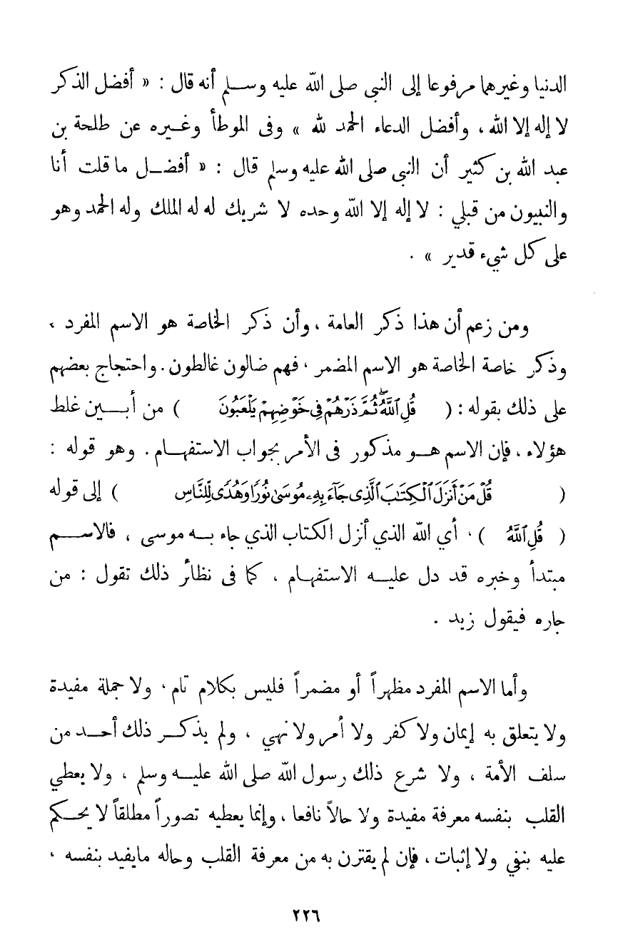 الدُّنْيَا وَغَيْرُهُمَا مَرْفُوعًا إلَى النَّبِيِّ صَلَّى اللَّهُ عَلَيْهِ وَسَلَّمَ أَنَّهُ قَالَ: {أَفْضَلُ الذِّكْرِ لَا إلَهَ إلَّا اللَّهُ وَأَفْضَلُ الدُّعَاءِ الْحَمْدُ لِلَّهِ} وَفِي الْمُوَطَّأِ وَغَيْرِهِ عَنْ طَلْحَةَ بْنِ عَبْدِ اللَّهِ بْنِ كَثِيرٍ أَنَّ النَّبِيَّ صَلَّى اللَّهُ عَلَيْهِ وَسَلَّمَ قَالَ: {أَفْضَلُ مَا قُلْتُ أَنَا وَالنَّبِيُّونَ مِنْ قَبْلِي: لَا إلَهَ إلَّا اللَّهُ وَحْدَهُ لَا شَرِيكَ لَهُ لَهُ الْمُلْكُ وَلَهُ الْحَمْدُ وَهُوَ عَلَى كُلِّ شَيْءٍ قَدِيرٌ} . وَمَنْ زَعَمَ أَنَّ هَذَا ذِكْرُ الْعَامَّةِ وَأَنَّ ذِكْرَ الْخَاصَّةِ هُوَ الِاسْمُ الْمُفْرَدُ وَذِكْرُ خَاصَّةِ الْخَاصَّةِ هُوَ الِاسْمُ الْمُضْمَرُ فَهُمْ ضَالُّونَ غالطون. وَاحْتِجَاجُ بَعْضِهِمْ عَلَى ذَلِكَ بِقَوْلِهِ: {قُلِ اللَّهُ ثُمَّ ذَرْهُمْ فِي خَوْضِهِمْ يَلْعَبُونَ} مِنْ أَبْيَنِ غَلَطِ هَؤُلَاءِ فَإِنَّ الِاسْمَ هُوَ مَذْكُورٌ فِي الْأَمْرِ بِجَوَابِ الِاسْتِفْهَامِ. وَهُوَ قَوْلُهُ: {قُلْ مَنْ أَنْزَلَ الْكِتَابَ الَّذِي جَاءَ بِهِ مُوسَى نُورًا وَهُدًى لِلنَّاسِ} إلَى قَوْلِهِ {قُلِ اللَّهُ} أَيْ اللَّهُ الَّذِي أَنْزَلَ الْكِتَابَ الَّذِي جَاءَ بِهِ مُوسَى فَالِاسْمُ مُبْتَدَأٌ وَخَبَرُهُ قَدْ دَلَّ عَلَيْهِ الِاسْتِفْهَامُ كَمَا فِي نَظَائِرِ ذَلِكَ تَقُولُ: مَنْ جَارُهُ فَيَقُولُ زَيْدٌ. وَأَمَّا الِاسْمُ الْمُفْرَدُ مُظْهَرًا أَوْ مُضْمَرًا فَلَيْسَ بِكَلَامِ تَامٍّ وَلَا جُمْلَةٍ مُفِيدَةٍ وَلَا يَتَعَلَّقُ بِهِ إيمَانٌ وَلَا كُفْرٌ وَلَا أَمْرٌ وَلَا نَهْيٌ وَلَمْ يَذْكُرْ ذَلِكَ أَحَدٌ مِنْ سَلَفِ الْأُمَّةِ وَلَا شَرَعَ ذَلِكَ رَسُولُ اللَّهِ صَلَّى اللَّهُ عَلَيْهِ وَسَلَّمَ وَلَا يُعْطِي الْقَلْبَ بِنَفْسِهِ مَعْرِفَةً مُفِيدَةً وَلَا حَالًا نَافِعًا وَإِنَّمَا يُعْطِيهِ تَصَوُّرًا مُطْلَقًا لَا يُحْكَمُ عَلَيْهِ بِنَفْيٍ وَلَا إثْبَاتٍ فَإِنْ لَمْ يَقْتَرِنْ بِهِ مِنْ مَعْرِفَةِ الْقَلْبِ وَحَالِهِ مَا يُفِيدُ بِنَفْسِهِ