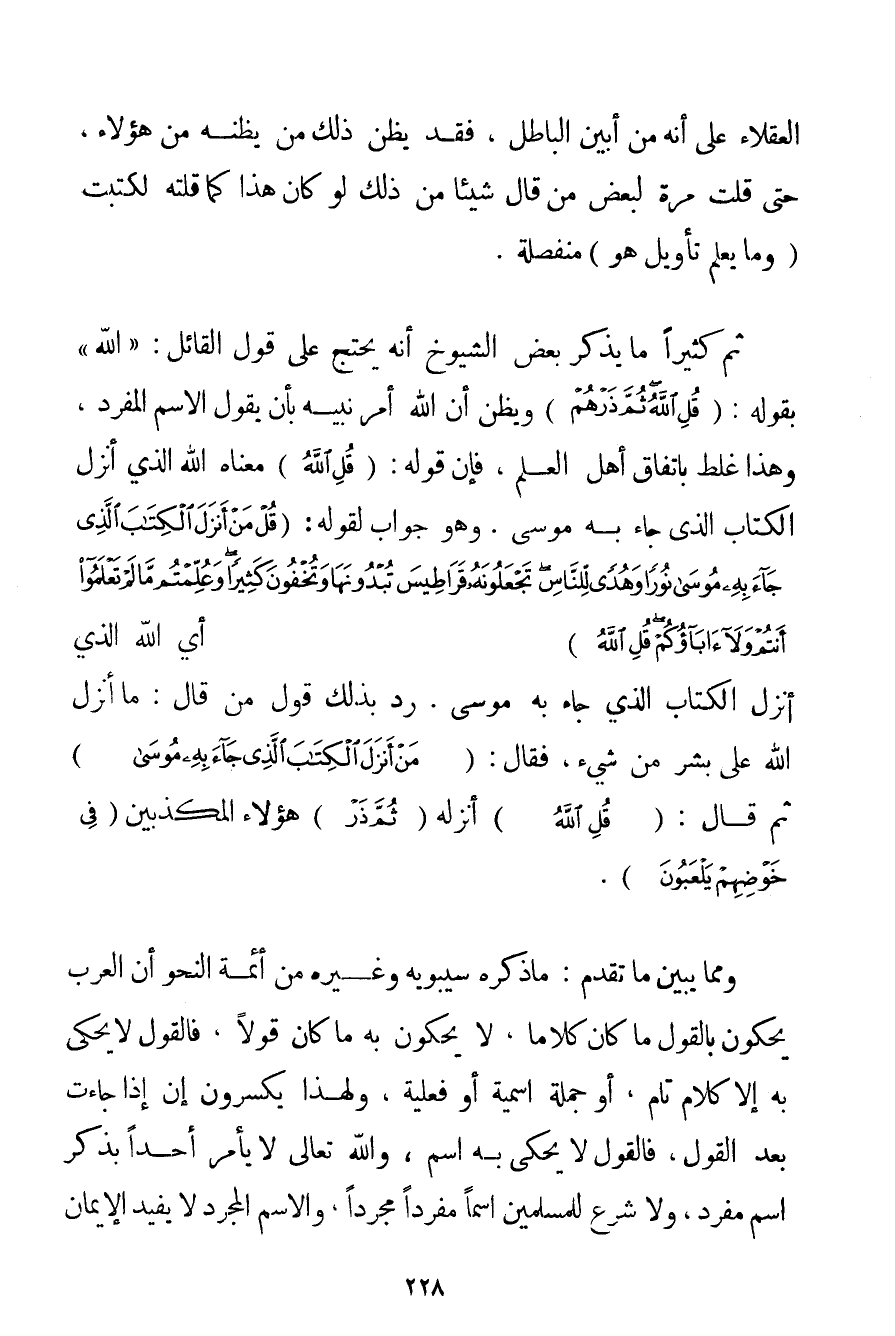 الْعُقَلَاءُ عَلَى أَنَّهُ مِنْ أَبْيَنِ الْبَاطِلِ فَقَدْ يَظُنُّ ذَلِكَ مَنْ يَظُنُّهُ مِنْ هَؤُلَاءِ. حَتَّى قُلْتُ مَرَّةً لِبَعْضِ مَنْ قَالَ شَيْئًا مِنْ ذَلِكَ لَوْ كَانَ هَذَا كَمَا قُلْتَهُ لَكَتَبْتُ (وَمَا يَعْلَمُ) تَأْوِيلَ هُوَ مُنْفَصِلَةً. ثُمَّ كَثِيرًا مَا يَذْكُرُ بَعْضُ الشُّيُوخِ أَنَّهُ يَحْتَجُّ عَلَى قَوْلِ الْقَائِلِ: " اللَّهُ " بِقَوْلِهِ: {قُلِ اللَّهُ ثُمَّ ذَرْهُمْ} وَيَظُنُّ أَنَّ اللَّهَ أَمَرَ نَبِيَّهُ بِأَنْ يَقُولَ الِاسْمَ الْمُفْرَدَ وَهَذَا غَلَطٌ بِاتِّفَاقِ أَهْلِ الْعِلْمِ فَإِنَّ قَوْلَهُ: {قُلِ اللَّهُ} مَعْنَاهُ اللَّهُ الَّذِي أَنْزَلَ الْكِتَابَ الَّذِي جَاءَ بِهِ مُوسَى. وَهُوَ جَوَابٌ لِقَوْلِهِ: {قُلْ مَنْ أَنْزَلَ الْكِتَابَ الَّذِي جَاءَ بِهِ مُوسَى نُورًا وَهُدًى لِلنَّاسِ تَجْعَلُونَهُ قَرَاطِيسَ تُبْدُونَهَا وَتُخْفُونَ كَثِيرًا وَعُلِّمْتُمْ مَا لَمْ تَعْلَمُوا أَنْتُمْ وَلَا آبَاؤُكُمْ قُلِ اللَّهُ} أَيْ اللَّهُ الَّذِي أَنْزَلَ الْكِتَابَ الَّذِي جَاءَ بِهِ مُوسَى. رَدَّ بِذَلِكَ قَوْلَ مَنْ قَالَ: مَا أَنْزَلَ اللَّهُ عَلَى بَشَرٍ مِنْ شَيْءٍ فَقَالَ: {مَنْ أَنْزَلَ الْكِتَابَ الَّذِي جَاءَ بِهِ مُوسَى} ثُمَّ قَالَ: {قُلِ اللَّهُ} أَنْزَلَهُ ثُمَّ ذَرْ هَؤُلَاءِ الْمُكَذِّبِينَ {فِي خَوْضِهِمْ يَلْعَبُونَ} . وَمِمَّا يُبَيِّنُ مَا تَقَدَّمَ: مَا ذَكَرَهُ سِيبَوَيْهِ وَغَيْرُهُ مِنْ أَئِمَّةِ النَّحْوِ أَنَّ الْعَرَبَ يَحْكُونَ بِالْقَوْلِ مَا كَانَ كَلَامًا لَا يَحْكُونَ بِهِ مَا كَانَ قَوْلًا فَالْقَوْلُ لَا يُحْكَى بِهِ إلَّا كَلَامٌ تَامٌّ أَوْ جُمْلَةٌ اسْمِيَّةٌ أَوْ فِعْلِيَّةٌ وَلِهَذَا يَكْسِرُونَ إنَّ إذَا جَاءَتْ بَعْدَ الْقَوْلِ فَالْقَوْلُ لَا يُحْكَى بِهِ اسْمٌ وَاَللَّهُ تَعَالَى لَا يَأْمُرُ أَحَدًا بِذِكْرِ اسْمٍ مُفْرَدٍ وَلَا شَرَعَ لِلْمُسْلِمِينَ اسْمًا مُفْرَدًا مُجَرَّدًا وَالِاسْمُ الْمُجَرَّدُ لَا يُفِيدُ الْإِيمَانَ