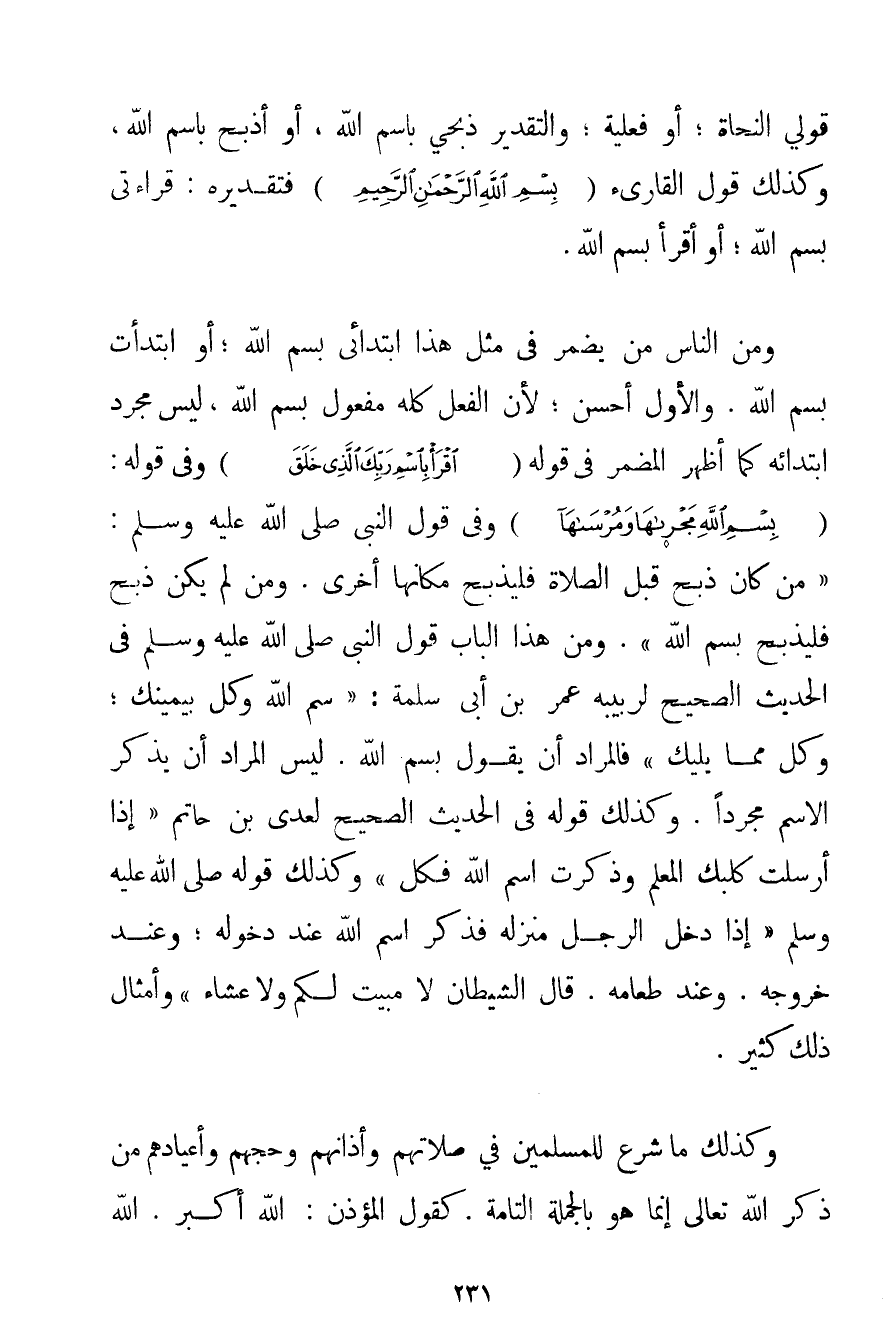 قَوْلَيْ النُّحَاةِ؛ أَوْ فِعْلِيَّةٌ؛ وَالتَّقْدِيرُ ذَبْحِي بِاسْمِ اللَّهِ أَوْ أَذْبَحُ بِاسْمِ اللَّهِ وَكَذَلِكَ قَوْلُ الْقَارِئِ (بِسْمِ اللَّهِ الرَّحْمَنِ الرَّحِيمِ) فَتَقْدِيرُهُ: قِرَاءَتِي بِسْمِ اللَّهِ؛ أَوْ أَقْرَأُ بِسْمِ اللَّهِ. وَمِنْ النَّاسِ مَنْ يُضْمِرُ فِي مِثْلِ هَذَا ابْتِدَائِي بِسْمِ اللَّهِ؛ أَوْ ابْتَدَأْتُ بِسْمِ اللَّهِ. وَالْأَوَّلُ أَحْسَنُ؛ لِأَنَّ الْفِعْلَ كُلَّهُ مَفْعُولٌ بِسْمِ اللَّهِ لَيْسَ مُجَرَّدُ ابْتِدَائِهِ كَمَا أَظْهَرَ الْمُضْمَرَ فِي قَوْلِهِ {اقْرَأْ بِاسْمِ رَبِّكَ الَّذِي خَلَقَ} وَفِي قَوْلِهِ: {بِسْمِ اللَّهِ مَجْرَاهَا وَمُرْسَاهَا} وَفِي قَوْلِ النَّبِيِّ صَلَّى اللَّهُ عَلَيْهِ وَسَلَّمَ {مَنْ كَانَ ذَبَحَ قَبْلَ الصَّلَاةِ فَلْيَذْبَحْ مَكَانَهَا أُخْرَى. وَمَنْ لَمْ يَكُنْ ذَبَحَ فَلْيَذْبَحْ بِسْمِ اللَّهِ} . وَمِنْ هَذَا الْبَابِ قَوْلُ النَّبِيِّ صَلَّى اللَّهُ عَلَيْهِ وَسَلَّمَ فِي الْحَدِيثِ الصَّحِيحِ لِرَبِيبِهِ عُمَرَ بْنِ أَبِي سَلَمَةَ: {سَمِّ اللَّهَ وَكُلْ بِيَمِينِكَ؛ وَكُلْ مِمَّا يَلِيكَ} فَالْمُرَادُ أَنْ يَقُولَ بِسْمِ اللَّهِ. لَيْسَ الْمُرَادُ أَنْ يُذْكَرَ الِاسْمُ مُجَرَّدًا. وَكَذَلِكَ قَوْلُهُ فِي الْحَدِيثِ الصَّحِيحِ لِعَدِيِّ بْنِ حَاتِمٍ {إذَا أَرْسَلْتَ كَلْبَكَ الْمُعَلَّمَ وَذَكَرْتَ اسْمَ اللَّهِ فَكُلْ} وَكَذَلِكَ قَوْلُهُ صَلَّى اللَّهُ عَلَيْهِ وَسَلَّمَ {إذَا دَخَلَ الرَّجُلُ مَنْزِلَهُ فَذَكَرَ اسْمَ اللَّهِ عِنْدَ دُخُولِهِ؛ وَعِنْدَ خُرُوجِهِ. وَعِنْدَ طَعَامِهِ. قَالَ الشَّيْطَانُ لَا مَبِيتَ لَكُمْ وَلَا عَشَاءَ} وَأَمْثَالُ ذَلِكَ كَثِيرٌ. وَكَذَلِكَ مَا شُرِعَ لِلْمُسْلِمِينَ فِي صَلَاتِهِمْ وَأَذَانِهِمْ وَحَجِّهِمْ وَأَعْيَادِهِمْ مِنْ ذِكْرِ اللَّهِ تَعَالَى إنَّمَا هُوَ بِالْجُمْلَةِ التَّامَّةِ. كَقَوْلِ الْمُؤَذِّنِ: اللَّهُ أَكْبَرُ. اللَّهُ