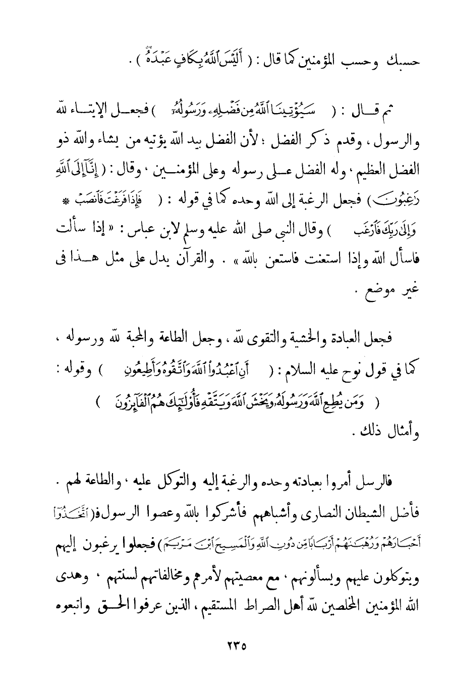 حَسْبُكَ وَحَسْبُ الْمُؤْمِنِينَ كَمَا قَالَ: {أَلَيْسَ اللَّهُ بِكَافٍ عَبْدَهُ} . ثُمَّ قَالَ: {سَيُؤْتِينَا اللَّهُ مِنْ فَضْلِهِ وَرَسُولُهُ} فَجَعَلَ الْإِيتَاءَ لِلَّهِ وَالرَّسُولِ وَقَدَّمَ ذِكْرَ الْفَضْلِ؛ لِأَنَّ الْفَضْلَ بِيَدِ اللَّهِ يُؤْتِيهِ مَنْ يَشَاءُ وَاَللَّهُ ذُو الْفَضْلِ الْعَظِيمُ وَلَهُ الْفَضْلُ عَلَى رَسُولِهِ وَعَلَى الْمُؤْمِنِينَ وَقَالَ: {إنَّا إلَى اللَّهِ رَاغِبُونَ} فَجَعَلَ الرَّغْبَةَ إلَى اللَّهِ وَحْدَهُ كَمَا فِي قَوْلِهِ: {فَإِذَا فَرَغْتَ فَانْصَبْ} {وَإِلَى رَبِّكَ فَارْغَبْ} {وَقَالَ النَّبِيُّ صَلَّى اللَّهُ عَلَيْهِ وَسَلَّمَ لِابْنِ عَبَّاسٍ: إذَا سَأَلْتَ فَاسْأَلْ اللَّهَ وَإِذَا اسْتَعَنْتَ فَاسْتَعِنْ بِاَللَّهِ} . وَالْقُرْآنُ يَدُلُّ عَلَى مِثْلِ هَذَا فِي غَيْرِ مَوْضِعٍ. فَجَعَلَ الْعِبَادَةَ وَالْخَشْيَةَ وَالتَّقْوَى لِلَّهِ وَجَعَلَ الطَّاعَةَ وَالْمَحَبَّةَ لِلَّهِ وَرَسُولِهِ كَمَا فِي قَوْلِ نُوحٍ عَلَيْهِ السَّلَامُ {أَنِ اعْبُدُوا اللَّهَ وَاتَّقُوهُ وَأَطِيعُونِ} وَقَوْلِهِ: {وَمَنْ يُطِعِ اللَّهَ وَرَسُولَهُ وَيَخْشَ اللَّهَ وَيَتَّقْهِ فَأُولَئِكَ هُمُ الْفَائِزُونَ} وَأَمْثَالِ ذَلِكَ. فَالرُّسُلُ أُمِرُوا بِعِبَادَتِهِ وَحْدَهُ وَالرَّغْبَةِ إلَيْهِ وَالتَّوَكُّلِ عَلَيْهِ وَالطَّاعَةِ لَهُمْ. فَأَضَلَّ الشَّيْطَانُ النَّصَارَى وَأَشْبَاهَهُمْ فَأَشْرَكُوا بِاَللَّهِ وَعَصَوْا الرَّسُولَ فَ {اتَّخَذُوا أَحْبَارَهُمْ وَرُهْبَانَهُمْ أَرْبَابًا مِنْ دُونِ اللَّهِ وَالْمَسِيحَ ابْنَ مَرْيَمَ} فَجَعَلُوا يَرْغَبُونَ إلَيْهِمْ وَيَتَوَكَّلُونَ عَلَيْهِمْ وَيَسْأَلُونَهُمْ مَعَ مَعْصِيَتِهِمْ لِأَمْرِهِمْ وَمُخَالَفَاتِهِمْ لِسُنَّتِهِمْ وَهَدَى اللَّهُ الْمُؤْمِنِينَ الْمُخْلِصِينَ لِلَّهِ أَهْلَ الصِّرَاطِ الْمُسْتَقِيمِ الَّذِينَ عَرَفُوا الْحَقَّ وَاتَّبَعُوهُ