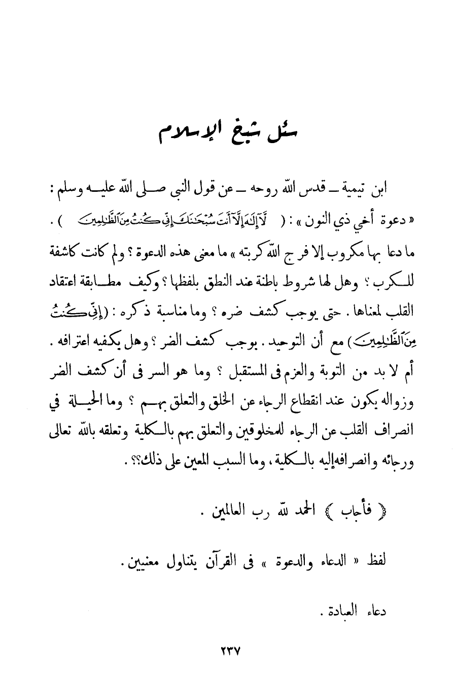 عَنْ قَوْلِ النَّبِيِّ صَلَّى اللَّهُ عَلَيْهِ وَسَلَّمَ {دَعْوَةُ أَخِي ذِي النُّونِ: {لَا إلَهَ إلَّا أَنْتَ سُبْحَانَكَ إنِّي كُنْتُ مِنَ الظَّالِمِينَ} . مَا دَعَا بِهَا مَكْرُوبٌ إلَّا فَرَّجَ اللَّهُ كُرْبَتَهُ} مَا مَعْنَى هَذِهِ الدَّعْوَةِ؟ وَلِمَ كَانَتْ كَاشِفَةً لِلْكَرْبِ؟ وَهَلْ لَهَا شُرُوطٌ بَاطِنَةٌ عِنْدَ النُّطْقِ بِلَفْظِهَا؟ وَكَيْفَ مُطَابَقَةُ اعْتِقَادِ الْقَلْبِ لِمَعْنَاهَا. حَتَّى يُوجِبَ كَشْفَ ضُرِّهِ؟ وَمَا مُنَاسَبَةُ ذِكْرِهِ: {إنِّي كُنْتُ مِنَ الظَّالِمِينَ} مَعَ أَنَّ التَّوْحِيدَ. يُوجِبُ كَشْفَ الضُّرِّ؟ وَهَلْ يَكْفِيهِ اعْتِرَافُهُ. أَمْ لَا بُدَّ مِنْ التَّوْبَةِ وَالْعَزْمِ فِي الْمُسْتَقْبَلِ؟ وَمَا هُوَ السِّرُّ فِي أَنَّ كَشْفَ الضُّرِّ وَزَوَالَهُ يَكُونُ عِنْدَ انْقِطَاعِ الرَّجَاءِ عَنْ الْخَلْقِ وَالتَّعَلُّقِ بِهِمْ؟ وَمَا الْحِيلَةُ فِي انْصِرَافِ الْقَلْبِ عَنْ الرَّجَاءِ لِلْمَخْلُوقِينَ وَالتَّعَلُّقِ بِهِمْ بِالْكُلِّيَّةِ وَتَعَلُّقِهِ بِاَللَّهِ تَعَالَى وَرَجَائِهِ وَانْصِرَافِهِ إلَيْهِ بِالْكُلِّيَّةِ وَمَا السَّبَبُ الْمُعِينُ عَلَى ذَلِكَ؟ ؟ .