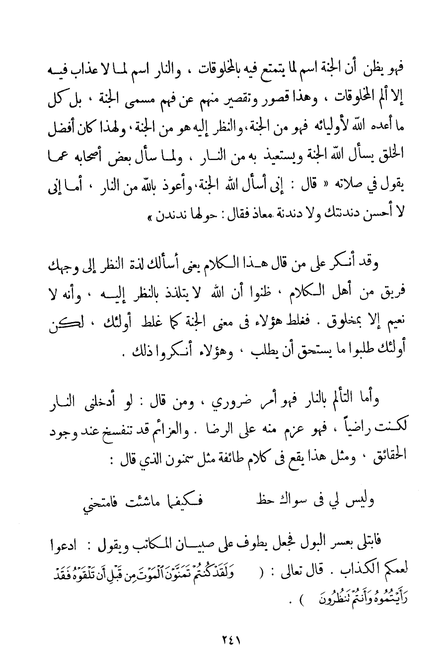 فَهُوَ يَظُنُّ أَنَّ الْجَنَّةَ اسْمٌ لِمَا يُتَمَتَّعُ فِيهِ بِالْمَخْلُوقَاتِ وَالنَّارَ اسْمٌ لِمَا لَا عَذَابَ فِيهِ إلَّا أَلَمُ الْمَخْلُوقَاتِ وَهَذَا قُصُورٌ وَتَقْصِيرٌ مِنْهُمْ عَنْ فَهْمِ مُسَمَّى الْجَنَّةِ بَلْ كُلُّ مَا أَعَدَّهُ اللَّهُ لِأَوْلِيَائِهِ فَهُوَ مِنْ الْجَنَّةِ وَالنَّظَرُ إلَيْهِ هُوَ مِنْ الْجَنَّةِ وَلِهَذَا كَانَ أَفْضَلُ الْخَلْقِ يَسْأَلُ اللَّهَ الْجَنَّةَ وَيَسْتَعِيذُ بِهِ مِنْ النَّارِ وَلَمَّا سَأَلَ بَعْضَ أَصْحَابِهِ عَمَّا يَقُولُ فِي صَلَاته {قَالَ: إنِّي أَسْأَلُ اللَّهَ الْجَنَّةَ وَأَعُوذُ بِاَللَّهِ مِنْ النَّارِ أَمَا إنِّي لَا أُحْسِنُ دَنْدَنَتَكَ وَلَا دَنْدَنَةَ مُعَاذٍ فَقَالَ: حَوْلَهَا نُدَنْدِنُ} وَقَدْ أَنْكَرَ عَلَى مَنْ قَالَ هَذَا الْكَلَامَ يَعْنِي أَسْأَلُكَ لَذَّةَ النَّظَرِ إلَى وَجْهِكَ فَرِيقٌ مَنْ أَهْلِ الْكَلَامِ ظَنُّوا أَنَّ اللَّهَ لَا يُتَلَذَّذُ بِالنَّظَرِ إلَيْهِ وَأَنَّهُ لَا نَعِيمَ إلَّا بِمَخْلُوقِ. فَغَلَّطَ هَؤُلَاءِ فِي مَعْنَى الْجَنَّةِ كَمَا غَلَّطَ أُولَئِكَ لَكِنَّ أُولَئِكَ طَلَبُوا مَا يَسْتَحِقُّ أَنْ يُطْلَبَ وَهَؤُلَاءِ أَنْكَرُوا ذَلِكَ. وَأَمَّا التَّأَلُّمُ بِالنَّارِ فَهُوَ أَمْرٌ ضَرُورِيٌّ وَمَنْ قَالَ: لَوْ أَدْخَلَنِي النَّارَ لَكُنْتُ رَاضِيًا فَهُوَ عَزْمٌ مِنْهُ عَلَى الرِّضَا. وَالْعَزَائِمُ قَدْ تَنْفَسِخُ عِنْدَ وُجُودِ الْحَقَائِقِ وَمِثْلُ هَذَا يَقَعُ فِي كَلَامِ طَائِفَةٍ مِثْلِ سمنون الَّذِي قَالَ: وَلَيْسَ لِي فِي سِوَاك حَظٌّ فَكَيْفَمَا شِئْتَ فَامْتَحِنِّي فَابْتُلِيَ بِعُسْرِ الْبَوْلِ فَجَعَلَ يَطُوفُ عَلَى صِبْيَانِ الْمَكَاتِبِ وَيَقُولُ: اُدْعُوا لِعَمِّكُمْ الْكَذَّابِ. قَالَ تَعَالَى: {وَلَقَدْ كُنْتُمْ تَمَنَّوْنَ الْمَوْتَ مِنْ قَبْلِ أَنْ تَلْقَوْهُ فَقَدْ رَأَيْتُمُوهُ وَأَنْتُمْ تَنْظُرُونَ} .