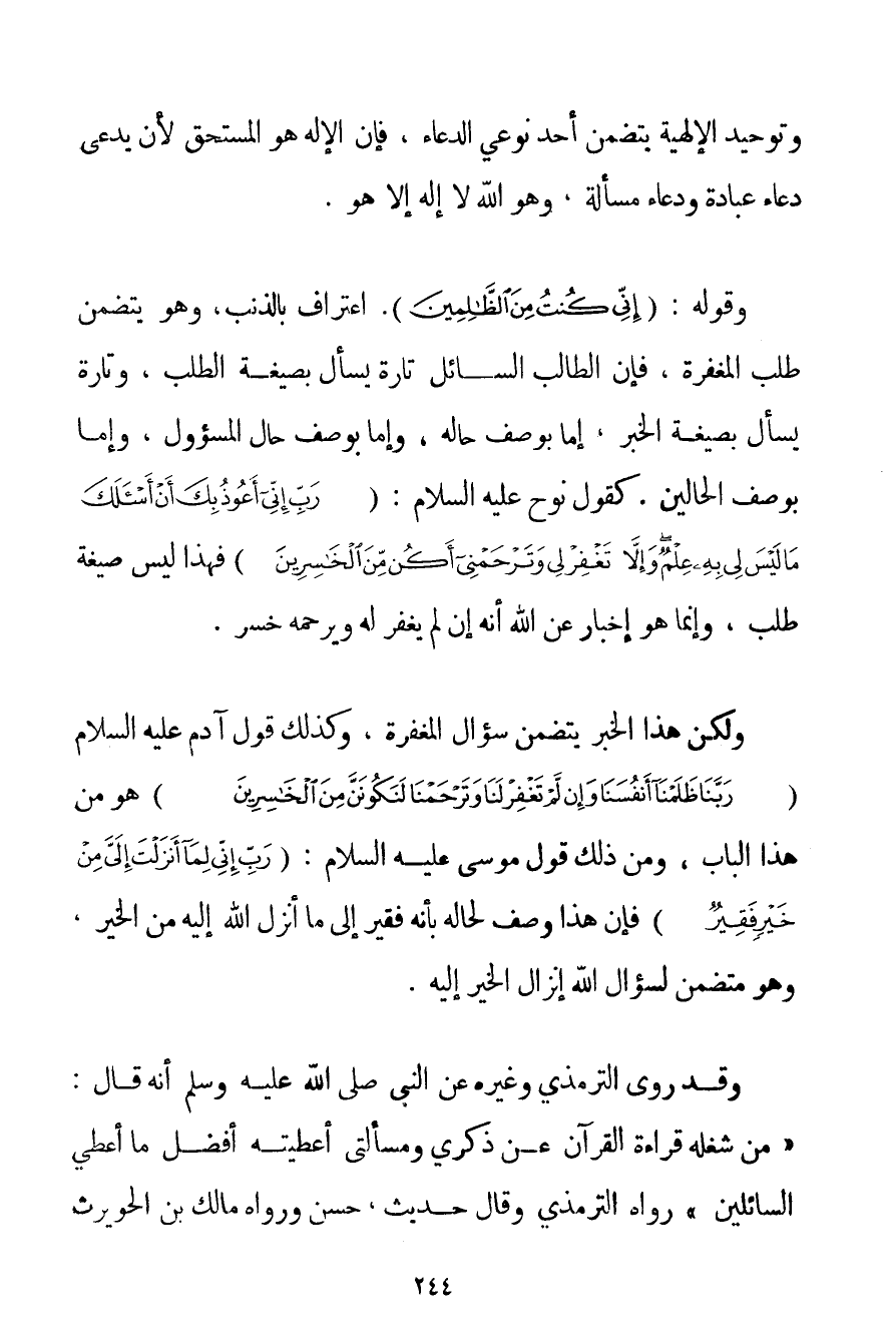 وَتَوْحِيدُ الْإِلَهِيَّةِ يَتَضَمَّنُ أَحَدَ نَوْعَيْ الدُّعَاءِ فَإِنَّ الْإِلَهَ هُوَ الْمُسْتَحِقُّ لِأَنْ يُدْعَى دُعَاءَ عِبَادَةٍ وَدُعَاءَ مَسْأَلَةٍ وَهُوَ اللَّهُ لَا إلَهَ إلَّا هُوَ. وَقَوْلُهُ: {إنِّي كُنْتُ مِنَ الظَّالِمِينَ} اعْتِرَافٌ بِالذَّنْبِ وَهُوَ يَتَضَمَّنُ طَلَبَ الْمَغْفِرَةِ فَإِنَّ الطَّالِبَ السَّائِلَ تَارَةً يَسْأَلُ بِصِيغَةِ الطَّلَبِ وَتَارَةً يَسْأَلُ بِصِيغَةِ الْخَبَرِ إمَّا بِوَصْفِ حَالِهِ وَإِمَّا بِوَصْفِ حَالِ الْمَسْئُولِ وَإِمَّا بِوَصْفِ الْحَالَيْنِ. كَقَوْلِ نُوحٍ عَلَيْهِ السَّلَامُ {رَبِّ إنِّي أَعُوذُ بِكَ أَنْ أَسْأَلَكَ مَا لَيْسَ لِي بِهِ عِلْمٌ وَإِلَّا تَغْفِرْ لِي وَتَرْحَمْنِي أَكُنْ مِنَ الْخَاسِرِينَ} فَهَذَا لَيْسَ صِيغَةَ طَلَبٍ وَإِنَّمَا هُوَ إخْبَارٌ عَنْ اللَّهِ أَنَّهُ إنْ لَمْ يَغْفِرْ لَهُ وَيَرْحَمْهُ خَسِرَ. وَلَكِنَّ هَذَا الْخَبَرَ يَتَضَمَّنُ سُؤَالَ الْمَغْفِرَةِ وَكَذَلِكَ قَوْلُ آدَمَ عَلَيْهِ السَّلَامُ {رَبَّنَا ظَلَمْنَا أَنْفُسَنَا وَإِنْ لَمْ تَغْفِرْ لَنَا وَتَرْحَمْنَا لَنَكُونَنَّ مِنَ الْخَاسِرِينَ} هُوَ مِنْ هَذَا الْبَابِ وَمِنْ ذَلِكَ قَوْلُ مُوسَى عَلَيْهِ السَّلَامُ {رَبِّ إنِّي لِمَا أَنْزَلْتَ إلَيَّ مِنْ خَيْرٍ فَقِيرٌ} فَإِنَّ هَذَا وَصْفٌ لِحَالِهِ بِأَنَّهُ فَقِيرٌ إلَى مَا أَنْزَلَ اللَّهُ إلَيْهِ مِنْ الْخَيْرِ وَهُوَ مُتَضَمِّنٌ لِسُؤَالِ اللَّهِ إنْزَالَ الْخَيْرِ إلَيْهِ. وَقَدْ رَوَى التِّرْمِذِيُّ وَغَيْرُهُ عَنْ النَّبِيِّ صَلَّى اللَّهُ عَلَيْهِ وَسَلَّمَ أَنَّهُ قَالَ: {مَنْ شَغَلَهُ قِرَاءَةُ الْقُرْآنِ عَنْ ذِكْرِي وَمَسْأَلَتِي أَعْطَيْتُهُ أَفْضَلَ مَا أُعْطِي السَّائِلِينَ} رَوَاهُ التِّرْمِذِيُّ وَقَالَ حَدِيثٌ حَسَنٌ وَرَوَاهُ مَالِكُ بْنُ الحويرث وَقَالَ: {مَنْ شَغَلَهُ ذِكْرِي عَنْ مَسْأَلَتِي أَعْطَيْتُهُ أَفْضَلَ مَا أُعْطِي السَّائِلِينَ}