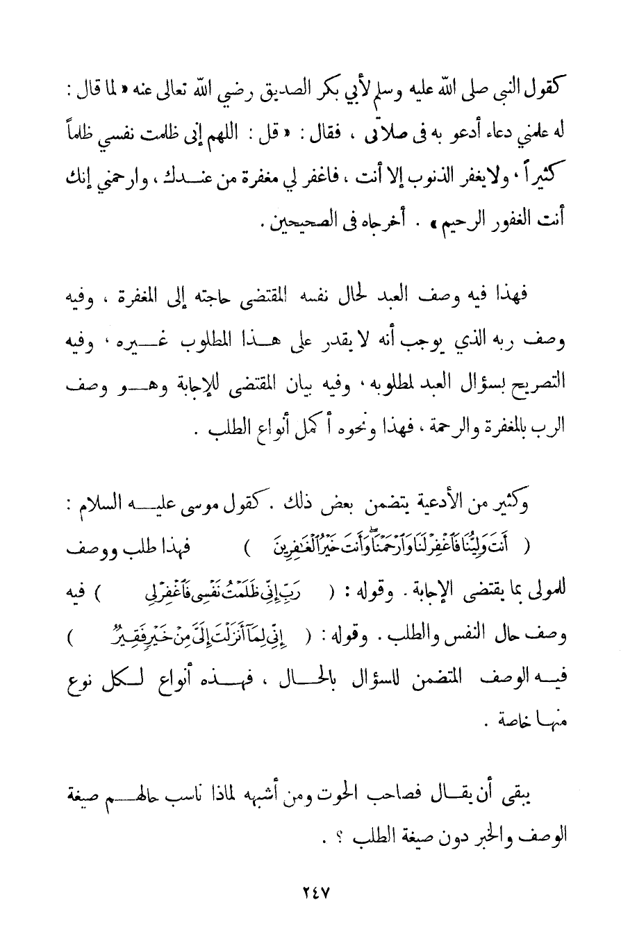 كَقَوْلِ النَّبِيِّ صَلَّى اللَّهُ عَلَيْهِ وَسَلَّمَ {لِأَبِي بَكْرٍ الصِّدِّيقِ رَضِيَ اللَّهُ عَنْهَا لَمَّا قَالَ: لَهُ عَلِّمْنِي دُعَاءً أَدْعُو بِهِ فِي صَلَاتِي فَقَالَ: قُلْ: اللَّهُمَّ إنِّي ظَلَمْتُ نَفْسِي ظُلْمًا كَثِيرًا وَلَا يَغْفِرُ الذُّنُوبَ إلَّا أَنْتَ فَاغْفِرْ لِي مَغْفِرَةً مِنْ عِنْدِكَ وَارْحَمْنِي إنَّكَ أَنْتَ الْغَفُورُ الرَّحِيمُ} . أَخْرَجَاهُ فِي الصَّحِيحَيْنِ. فَهَذَا فِيهِ وَصْفُ الْعَبْدِ لِحَالِ نَفْسِهِ الْمُقْتَضِي حَاجَتَهُ إلَى الْمَغْفِرَةِ وَفِيهِ وَصْفُ رَبِّهِ الَّذِي يُوجِبُ أَنَّهُ لَا يَقْدِرُ عَلَى هَذَا الْمَطْلُوبِ غَيْرُهُ وَفِيهِ التَّصْرِيحُ بِسُؤَالِ الْعَبْدِ لِمَطْلُوبِهِ وَفِيهِ بَيَانُ الْمُقْتَضِي لِلْإِجَابَةِ وَهُوَ وَصْفُ الرَّبِّ بِالْمَغْفِرَةِ وَالرَّحْمَةِ فَهَذَا وَنَحْوُهُ أَكْمَلُ أَنْوَاعِ الطَّلَبِ. وَكَثِيرٌ مِنْ الْأَدْعِيَةِ يَتَضَمَّنُ بَعْضَ ذَلِكَ. كَقَوْلِ مُوسَى عَلَيْهِ السَّلَامُ {أَنْتَ وَلِيُّنَا فَاغْفِرْ لَنَا وَارْحَمْنَا وَأَنْتَ خَيْرُ الْغَافِرِينَ} فَهَذَا طَلَبٌ وَوَصْفٌ لِلْمَوْلَى بِمَا يَقْتَضِي الْإِجَابَةَ. وَقَوْلُهُ: {رَبِّ إنِّي ظَلَمْتُ نَفْسِي فَاغْفِرْ لِي} فِيهِ وَصْفُ حَالِ النَّفْسِ وَالطَّلَبِ. وَقَوْلُهُ: {إنِّي لِمَا أَنْزَلْتَ إلَيَّ مِنْ خَيْرٍ فَقِيرٌ} فِيهِ الْوَصْفُ الْمُتَضَمِّنُ لِلسُّؤَالِ بِالْحَالِ فَهَذِهِ أَنْوَاعٌ لِكُلِّ نَوْعٍ مِنْهَا خَاصَّةٌ. يَبْقَى أَنْ يُقَالَ فَصَاحِبُ الْحُوتِ وَمَنْ أَشْبَهَهُ لِمَاذَا نَاسَبَ حَالَهُمْ صِيغَةُ الْوَصْفِ وَالْخَبَرِ دُونَ صِيغَةِ الطَّلَبِ؟
