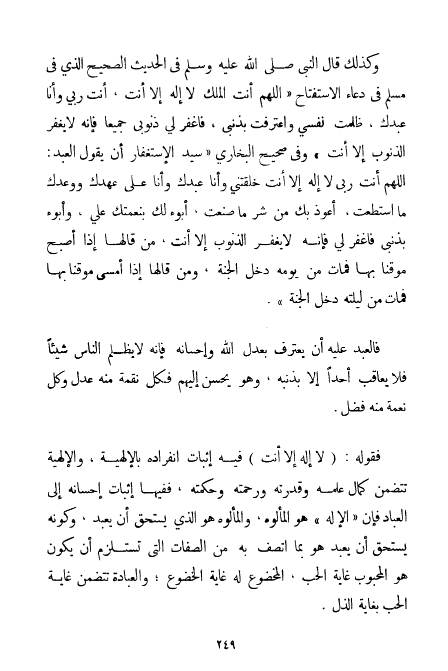 وَكَذَلِكَ قَالَ النَّبِيُّ صَلَّى اللَّهُ عَلَيْهِ وَسَلَّمَ فِي الْحَدِيثِ الصَّحِيحِ الَّذِي فِي مُسْلِمٍ فِي دُعَاءِ الِاسْتِفْتَاحِ {اللَّهُمَّ أَنْتَ الْمَلِكُ لَا إلَهَ إلَّا أَنْتَ أَنْتَ رَبِّي وَأَنَا عَبْدُكَ ظَلَمْتُ نَفْسِي وَاعْتَرَفْتُ بِذَنْبِي فَاغْفِرْ لِي ذُنُوبِي جَمِيعًا فَإِنَّهُ لَا يَغْفِرُ الذُّنُوبَ إلَّا أَنْتَ} وَفِي صَحِيحِ الْبُخَارِيِّ {سَيِّدُ الِاسْتِغْفَارِ أَنْ يَقُولَ الْعَبْدُ: اللَّهُمَّ أَنْتَ رَبِّي لَا إلَهَ إلَّا أَنْتَ خَلَقْتِنِي وَأَنَا عَبْدُكَ وَأَنَا عَلَى عَهْدِكَ وَوَعْدِكَ مَا اسْتَطَعْتُ أَعُوذُ بِكَ مِنْ شَرِّ مَا صَنَعْتُ أَبُوءُ لَكَ بِنِعْمَتِكَ عَلَيَّ وَأَبُوءُ بِذَنْبِي فَاغْفِرْ لِي فَإِنَّهُ لَا يَغْفِرُ الذُّنُوبَ إلَّا أَنْتَ مَنْ قَالَهَا إذَا أَصْبَحَ مُوقِنًا بِهَا فَمَاتَ مِنْ يَوْمِهِ دَخَلَ الْجَنَّةَ وَمَنْ قَالَهَا إذَا أَمْسَى مُوقِنًا بِهَا فَمَاتَ مِنْ لَيْلَتِهِ دَخَلَ الْجَنَّةَ} . فَالْعَبْدُ عَلَيْهِ أَنْ يَعْتَرِفَ بِعَدْلِ اللَّهِ وَإِحْسَانِهِ فَإِنَّهُ لَا يَظْلِمُ النَّاسَ شَيْئًا فَلَا يُعَاقِبُ أَحَدًا إلَّا بِذَنْبِهِ وَهُوَ يُحْسِنُ إلَيْهِمْ فَكُلُّ نِقْمَةٍ مِنْهُ عَدْلٌ وَكُلُّ نِعْمَةٍ مِنْهُ فَضْلٌ. فَقَوْلُهُ: {لَا إلَهَ إلَّا أَنْتَ} فِيهِ إثْبَاتُ انْفِرَادِهِ بِالْإِلَهِيَّةِ وَالْإِلَهِيَّةُ تَتَضَمَّنُ كَمَالَ عِلْمِهِ وَقُدْرَتِهِ وَرَحْمَتِهِ وَحِكْمَتِهِ فَفِيهَا إثْبَاتُ إحْسَانِهِ إلَى الْعِبَادِ فَإِنَّ " الْإِلَهَ " هُوَ الْمَأْلُوهُ وَالْمَأْلُوهُ هُوَ الَّذِي يَسْتَحِقُّ أَنْ يُعْبَدَ وَكَوْنُهُ يَسْتَحِقُّ أَنْ يُعْبَدَ هُوَ بِمَا اتَّصَفَ بِهِ مِنْ الصِّفَاتِ الَّتِي تَسْتَلْزِمُ أَنْ يَكُونَ هُوَ الْمَحْبُوبَ غَايَةَ الْحُبِّ الْمَخْضُوعَ لَهُ غَايَةَ الْخُضُوعِ؛ وَالْعِبَادَةُ تَتَضَمَّنُ غَايَةَ الْحُبِّ بِغَايَةِ الذُّلِّ.