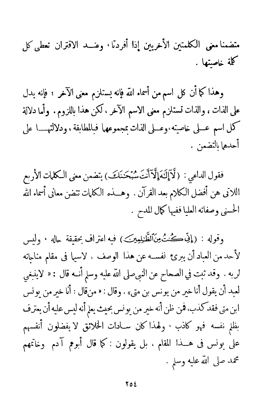 مُتَضَمِّنًا مَعْنَى الْكَلِمَتَيْنِ الْأُخْرَيَيْنِ إذَا أُفْرِدَتَا وَعِنْدَ الِاقْتِرَانِ تُعْطَى كُلُّ كَلِمَةٍ خَاصِّيَّتَهَا. وَهَذَا كَمَا أَنَّ كُلَّ اسْمٍ مِنْ أَسْمَاءِ اللَّهِ فَإِنَّهُ يَسْتَلْزِمُ مَعْنَى الْآخَرِ؛ فَإِنَّهُ يَدُلُّ عَلَى الذَّاتِ وَالذَّاتُ تَسْتَلْزِمُ مَعْنَى الِاسْمِ الْآخَرِ لَكِنَّ هَذَا بِاللُّزُومِ. وَأَمَّا دِلَالَةُ كُلِّ اسْمٍ عَلَى خَاصِّيَّتِهِ وَعَلَى الذَّاتِ بِمَجْمُوعِهِمَا فَبِالْمُطَابَقَةِ وَدِلَالَتُهَا عَلَى أَحَدِهِمَا بِالتَّضَمُّنِ. فَقَوْلُ الدَّاعِي: {لَا إلَهَ إلَّا أَنْتَ سُبْحَانَكَ} يَتَضَمَّنُ مَعْنَى الْكَلِمَاتِ الْأَرْبَعِ اللَّاتِي هُنَّ أَفْضَلُ الْكَلَامِ بَعْدَ الْقُرْآنِ. وَهَذِهِ الْكَلِمَاتُ تَتَضَمَّنُ مَعَانِيَ أَسْمَاءِ اللَّهِ الْحُسْنَى وَصِفَاتِهِ الْعُلْيَا فَفِيهَا كَمَالُ الْمَدْحِ. وَقَوْلُهُ: {إنِّي كُنْتُ مِنَ الظَّالِمِينَ} فِيهِ اعْتِرَافٌ بِحَقِيقَةِ حَالِهِ وَلَيْسَ لِأَحَدِ مِنْ الْعِبَادِ أَنْ يُبَرِّئَ نَفْسَهُ عَنْ هَذَا الْوَصْفِ لَا سِيَّمَا فِي مَقَامِ مُنَاجَاتِهِ لِرَبِّهِ. وَقَدْ ثَبَتَ فِي الصِّحَاحِ عَنْ النَّبِيِّ صَلَّى اللَّهُ عَلَيْهِ وَسَلَّمَ أَنَّهُ قَالَ: {لَا يَنْبَغِي لِعَبْدِ أَنْ يَقُولَ أَنَا خَيْرٌ مِنْ يُونُسَ بْنِ متى} وَقَالَ: {مَنْ قَالَ: أَنَا خَيْرٌ مِنْ يُونُسَ بْنِ متى فَقَدْ كَذَبَ} فَمَنْ ظَنَّ أَنَّهُ خَيْرٌ مِنْ يُونُسَ بِحَيْثُ يَعْلَمُ أَنَّهُ لَيْسَ عَلَيْهِ أَنْ يَعْتَرِفَ بِظُلْمِ نَفْسِهِ فَهُوَ كَاذِبٌ وَلِهَذَا كَانَ سَادَاتُ الْخَلَائِقِ لَا يُفَضِّلُونَ أَنْفُسَهُمْ عَلَى يُونُسَ فِي هَذَا الْمَقَامِ بَلْ يَقُولُونَ: كَمَا قَالَ أَبُوهُمْ آدَمَ وَخَاتَمُهُمْ مُحَمَّدٌ صَلَّى اللَّهُ عَلَيْهِ وَسَلَّمَ.