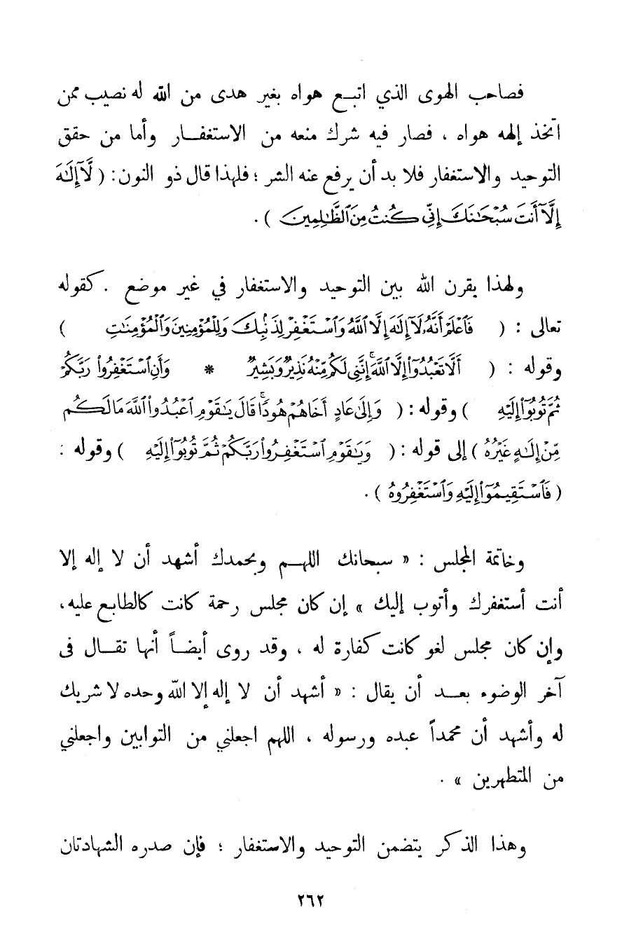 فَصَاحِبُ الْهَوَى الَّذِي اتَّبَعَ هَوَاهُ بِغَيْرِ هُدًى مِنْ اللَّهِ لَهُ نَصِيبٌ مِمَّنْ اتَّخَذَ إلَهَهُ هَوَاهُ فَصَارَ فِيهِ شِرْكٌ مَنَعَهُ مِنْ الِاسْتِغْفَارِ وَأَمَّا مَنْ حَقَّقَ التَّوْحِيدَ وَالِاسْتِغْفَارَ فَلَا بُدَّ أَنْ يُرْفَعَ عَنْهُ الشَّرُّ؛ فَلِهَذَا قَالَ ذُو النُّونِ: {لَا إلَهَ إلَّا أَنْتَ سُبْحَانَكَ إنِّي كُنْتُ مِنَ الظَّالِمِينَ} . وَلِهَذَا يَقْرِنُ اللَّهُ بَيْنَ التَّوْحِيدِ وَالِاسْتِغْفَارِ فِي غَيْرِ مَوْضِعٍ. كَقَوْلِهِ تَعَالَى: {فَاعْلَمْ أَنَّهُ لَا إلَهَ إلَّا اللَّهُ وَاسْتَغْفِرْ لِذَنْبِكَ وَلِلْمُؤْمِنِينَ وَالْمُؤْمِنَاتِ} وَقَوْلِهِ: {أَلَّا تَعْبُدُوا إلَّا اللَّهَ إنَّنِي لَكُمْ مِنْهُ نَذِيرٌ وَبَشِيرٌ} {وَأَنِ اسْتَغْفِرُوا رَبَّكُمْ ثُمَّ تُوبُوا إلَيْهِ} وَقَوْلِهِ: {وَإِلَى عَادٍ أَخَاهُمْ هُودًا قَالَ يَا قَوْمِ اعْبُدُوا اللَّهَ مَا لَكُمْ مِنْ إلَهٍ غَيْرُهُ} إلَى قَوْلِهِ: {وَيَا قَوْمِ اسْتَغْفِرُوا رَبَّكُمْ ثُمَّ تُوبُوا إلَيْهِ} وَقَوْلِهِ: {فَاسْتَقِيمُوا إلَيْهِ وَاسْتَغْفِرُوهُ} . وَخَاتِمَةُ الْمَجْلِسِ: {سُبْحَانَكَ اللَّهُمَّ وَبِحَمْدِكَ أَشْهَدُ أَنْ لَا إلَهَ إلَّا أَنْتَ أَسْتَغْفِرُكَ وَأَتُوبُ إلَيْكَ} إنْ كَانَ مَجْلِسَ رَحْمَةٍ كَانَتْ كَالطَّابَعِ عَلَيْهِ وَإِنْ كَانَ مَجْلِسَ لَغْوٍ كَانَتْ كَفَّارَةً لَهُ وَقَدْ رُوِيَ أَيْضًا أَنَّهَا تُقَالُ فِي آخِرِ الْوُضُوءِ بَعْدَ أَنْ يُقَالَ: {أَشْهَدُ أَنْ لَا إلَهَ إلَّا اللَّهُ وَحْدَهُ لَا شَرِيكَ لَهُ وَأَشْهَدُ أَنَّ مُحَمَّدًا عَبْدُهُ وَرَسُولُهُ اللَّهُمَّ اجْعَلْنِي مِنْ التَّوَّابِينَ وَاجْعَلْنِي مِنْ الْمُتَطَهِّرِينَ} . وَهَذَا الذِّكْرُ يَتَضَمَّنُ التَّوْحِيدَ وَالِاسْتِغْفَارَ؛ فَإِنَّ صَدْرَهُ الشَّهَادَتَانِ