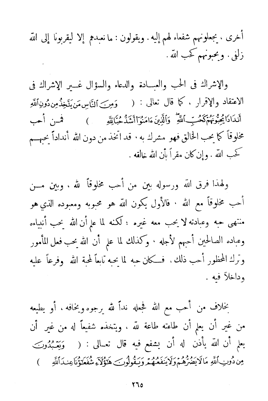 وَالْإِشْرَاكُ فِي الْحُبِّ وَالْعِبَادَةِ وَالدُّعَاءِ وَالسُّؤَالِ غَيْرُ الْإِشْرَاكِ فِي الِاعْتِقَادِ وَالْإِقْرَارِ كَمَا قَالَ تَعَالَى: {وَمِنَ النَّاسِ مَنْ يَتَّخِذُ مِنْ دُونِ اللَّهِ أَنْدَادًا يُحِبُّونَهُمْ كَحُبِّ اللَّهِ وَالَّذِينَ آمَنُوا أَشَدُّ حُبًّا لِلَّهِ} فَمَنْ أَحَبَّ مَخْلُوقًا كَمَا يُحِبُّ الْخَالِقَ فَهُوَ مُشْرِكٌ بِهِ قَدْ اتَّخَذَ مِنْ دُونِ اللَّهِ أَنْدَادًا يُحِبُّهُمْ كَحُبِّ اللَّهِ. وَإِنْ كَانَ مُقِرًّا بِأَنَّ اللَّهَ خَالِقُهُ. وَلِهَذَا فَرَّقَ اللَّهُ وَرَسُولُهُ بَيْنَ مَنْ أَحَبَّ مَخْلُوقًا لِلَّهِ وَبَيْنَ مَنْ أَحَبَّ مَخْلُوقًا مَعَ اللَّهِ فَالْأَوَّلُ يَكُونُ اللَّهُ هُوَ مَحْبُوبَهُ وَمَعْبُودَهُ الَّذِي هُوَ مُنْتَهَى حُبِّهِ وَعِبَادَتِهِ لَا يُحِبُّ مَعَهُ غَيْرَهُ؛ لَكِنَّهُ لَمَّا عَلِمَ أَنَّ اللَّهَ يُحِبُّ أَنْبِيَاءَهُ وَعِبَادَهُ الصَّالِحِينَ أَحَبَّهُمْ لِأَجْلِهِ وَكَذَلِكَ لَمَّا عَلِمَ أَنَّ اللَّهَ يُحِبُّ فِعْلَ الْمَأْمُورِ وَتَرْكَ الْمَحْظُورِ أَحَبَّ ذَلِكَ فَكَانَ حُبُّهُ لِمَا يُحِبُّهُ تَابِعًا لِمَحَبَّةِ اللَّهِ وَفَرْعًا عَلَيْهِ وَدَاخِلًا فِيهِ. بِخِلَافِ مَنْ أَحَبَّ مَعَ اللَّهِ فَجَعَلَهُ نِدًّا لِلَّهِ يَرْجُوهُ وَيَخَافُهُ أَوْ يُطِيعُهُ مِنْ غَيْرِ أَنْ يَعْلَمَ أَنَّ طَاعَتَهُ طَاعَةٌ لِلَّهِ وَيَتَّخِذُهُ شَفِيعًا لَهُ مِنْ غَيْرِ أَنْ يَعْلَمَ أَنَّ اللَّهَ يَأْذَنُ لَهُ أَنْ يُشَفَّعَ فِيهِ قَالَ تَعَالَى: {وَيَعْبُدُونَ مِنْ دُونِ اللَّهِ مَا لَا يَضُرُّهُمْ وَلَا يَنْفَعُهُمْ وَيَقُولُونَ هَؤُلَاءِ شُفَعَاؤُنَا عِنْدَ اللَّهِ}