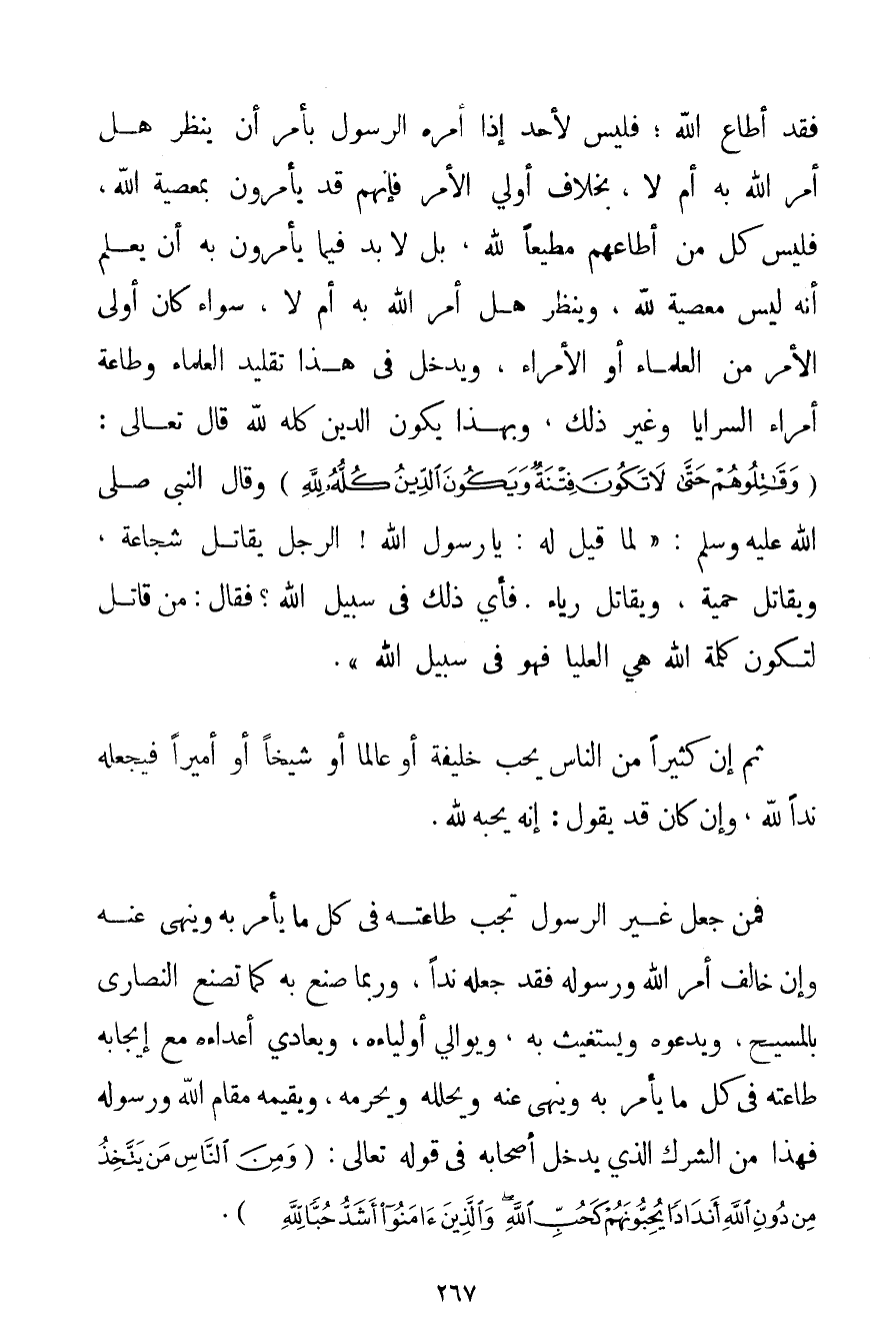 فَقَدْ أَطَاعَ اللَّهَ؛ فَلَيْسَ لِأَحَدٍ إذَا أَمَرَهُ الرَّسُولُ بِأَمْرِ أَنْ يَنْظُرَ هَلْ أَمَرَ اللَّهُ بِهِ أَمْ لَا بِخِلَافِ أُولِي الْأَمْرِ فَإِنَّهُمْ قَدْ يَأْمُرُونَ بِمَعْصِيَةِ اللَّهِ فَلَيْسَ كُلُّ مَنْ أَطَاعَهُمْ مُطِيعًا لِلَّهِ بَلْ لَا بُدَّ فِيمَا يَأْمُرُونَ بِهِ أَنْ يُعْلَمَ أَنَّهُ لَيْسَ مَعْصِيَةً لِلَّهِ وَيُنْظَرَ هَلْ أَمَرَ اللَّهُ بِهِ أَمْ لَا سَوَاءٌ كَانَ أُولِي الْأَمْرِ مِنْ الْعُلَمَاءِ أَوْ الْأُمَرَاءِ وَيَدْخُلُ فِي هَذَا تَقْلِيدُ الْعُلَمَاءِ وَطَاعَةُ أُمَرَاءِ السَّرَايَا وَغَيْرُ ذَلِكَ وَبِهَذَا يَكُونُ الدِّينُ كُلُّهُ لِلَّهِ قَالَ تَعَالَى: {وَقَاتِلُوهُمْ حَتَّى لَا تَكُونَ فِتْنَةٌ وَيَكُونَ الدِّينُ كُلُّهُ لِلَّهِ} وَقَالَ النَّبِيُّ صَلَّى اللَّهُ عَلَيْهِ وَسَلَّمَ {لَمَّا قِيلَ لَهُ: يَا رَسُولَ اللَّهِ الرَّجُلُ يُقَاتِلُ شَجَاعَةً وَيُقَاتِلُ حَمِيَّةً وَيُقَاتِلُ رِيَاءً. فَأَيُّ ذَلِكَ فِي سَبِيلِ اللَّهِ؟ فَقَالَ: مَنْ قَاتَلَ لِتَكُونَ كَلِمَةُ اللَّهِ هِيَ الْعُلْيَا فَهُوَ فِي سَبِيلِ اللَّهِ} . ثُمَّ إنَّ كَثِيرًا مِنْ النَّاسِ يُحِبُّ خَلِيفَةً أَوْ عَالِمًا أَوْ شَيْخًا أَوْ أَمِيرًا فَيَجْعَلَهُ نِدًّا لِلَّهِ وَإِنْ كَانَ قَدْ يَقُولُ: إنَّهُ يُحِبُّهُ لِلَّهِ. فَمَنْ جَعَلَ غَيْرَ الرَّسُولِ تَجِبُ طَاعَتُهُ فِي كُلِّ مَا يَأْمُرُ بِهِ وَيَنْهَى عَنْهُ وَإِنْ خَالَفَ أَمْرَ اللَّهِ وَرَسُولِهِ فَقَدْ جَعَلَهُ نِدًّا وَرُبَّمَا صَنَعَ بِهِ كَمَا تَصْنَعُ النَّصَارَى بِالْمَسِيحِ وَيَدْعُوهُ وَيَسْتَغِيثُ بِهِ وَيُوَالِي أَوْلِيَاءَهُ وَيُعَادِي أَعْدَاءَهُ مَعَ إيجَابِهِ طَاعَتَهُ فِي كُلِّ مَا يَأْمُرُ بِهِ وَيَنْهَى عَنْهُ وَيُحَلِّلُهُ وَيُحَرِّمُهُ وَيُقِيمُهُ مَقَامَ اللَّهِ وَرَسُولِهِ فَهَذَا مِنْ الشِّرْكِ الَّذِي يَدْخُلُ أَصْحَابُهُ فِي قَوْله تَعَالَى {وَمِنَ النَّاسِ مَنْ يَتَّخِذُ مِنْ دُونِ اللَّهِ أَنْدَادًا يُحِبُّونَهُمْ كَحُبِّ اللَّهِ وَالَّذِينَ آمَنُوا أَشَدُّ حُبًّا لِلَّهِ} .