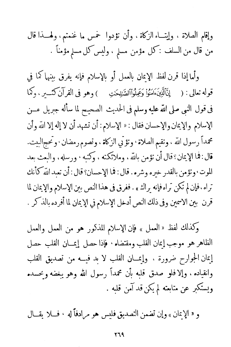 وَإِقَامُ الصَّلَاةِ وَإِيتَاءُ الزَّكَاةِ وَأَنْ تُؤَدُّوا خُمْسَ مَا غَنِمْتُمْ} وَلِهَذَا قَالَ مَنْ قَالَ مِنْ السَّلَفِ: كُلُّ مُؤْمِنٍ مُسْلِمٌ وَلَيْسَ كُلُّ مُسْلِمٍ مُؤْمِنًا. وَأَمَّا إذَا قُرِنَ لَفْظُ الْإِيمَانِ بِالْعَمَلِ أَوْ بِالْإِسْلَامِ فَإِنَّهُ يُفَرَّقُ بَيْنَهُمَا كَمَا فِي قَوْله تَعَالَى {إنَّ الَّذِينَ آمَنُوا وَعَمِلُوا الصَّالِحَاتِ} وَهُوَ فِي الْقُرْآنِ كَثِيرٌ وَكَمَا فِي قَوْلِ النَّبِيِّ صَلَّى اللَّهُ عَلَيْهِ وَسَلَّمَ فِي الْحَدِيثِ الصَّحِيحِ لَمَّا سَأَلَهُ جِبْرِيلُ عَنْ الْإِسْلَامِ وَالْإِيمَانِ وَالْإِحْسَانِ فَقَالَ: {الْإِسْلَامُ: أَنْ تَشْهَدَ أَنْ لَا إلَهَ إلَّا اللَّهُ وَأَنَّ مُحَمَّدًا رَسُولُ اللَّهِ وَتُقِيمَ الصَّلَاةَ وَتُؤْتِيَ الزَّكَاةَ وَتَصُومَ رَمَضَانَ وَتَحُجَّ الْبَيْتَ. قَالَ: فَمَا الْإِيمَانُ؟ قَالَ أَنْ تُؤْمِنَ بِاَللَّهِ وَمَلَائِكَتِهِ وَكُتُبِهِ وَرُسُلِهِ وَالْبَعْثِ بَعْدَ الْمَوْتِ وَتُؤْمِنَ بِالْقَدَرِ خَيْرِهِ وَشَرِّهِ. قَالَ: فَمَا الْإِحْسَانُ؟ قَالَ: أَنْ تَعْبُدَ اللَّهَ كَأَنَّكَ تَرَاهُ فَإِنْ لَمْ تَكُنْ تَرَاهُ فَإِنَّهُ يَرَاكَ} . فَفَرَّقَ فِي هَذَا النَّصِّ بَيْنَ الْإِسْلَامِ وَالْإِيمَانِ لَمَّا قَرَنَ بَيْنَ الِاسْمَيْنِ وَفِي ذَلِكَ النَّصِّ أَدْخَلَ الْإِسْلَامَ فِي الْإِيمَانِ لَمَّا أَفْرَدَهُ بِالذِّكْرِ. وَكَذَلِكَ لَفْظُ " الْعَمَلِ " فَإِنَّ الْإِسْلَامَ الْمَذْكُورَ هُوَ مِنْ الْعَمَلِ وَالْعَمَلُ الظَّاهِرُ هُوَ مُوجَبُ إيمَانِ الْقَلْبِ وَمُقْتَضَاهُ فَإِذَا حَصَلَ إيمَانُ الْقَلْبِ حَصَلَ إيمَانُ الْجَوَارِحِ ضَرُورَةً وَإِيمَانُ الْقَلْبِ لَا بُدَّ فِيهِ مِنْ تَصْدِيقِ الْقَلْبِ وَانْقِيَادِهِ وَإِلَّا فَلَوْ صَدَّقَ قَلْبُهُ بِأَنَّ مُحَمَّدًا رَسُولُ اللَّهِ وَهُوَ يُبْغِضُهُ وَيَحْسُدُهُ وَيَسْتَكْبِرُ عَنْ مُتَابَعَتِهِ لَمْ يَكُنْ قَدْ آمَنَ قَلْبُهُ. و " الْإِيمَانُ " وَإِنْ تَضَمَّنَ التَّصْدِيقَ فَلَيْسَ هُوَ مُرَادِفًا لَهُ فَلَا يُقَالُ